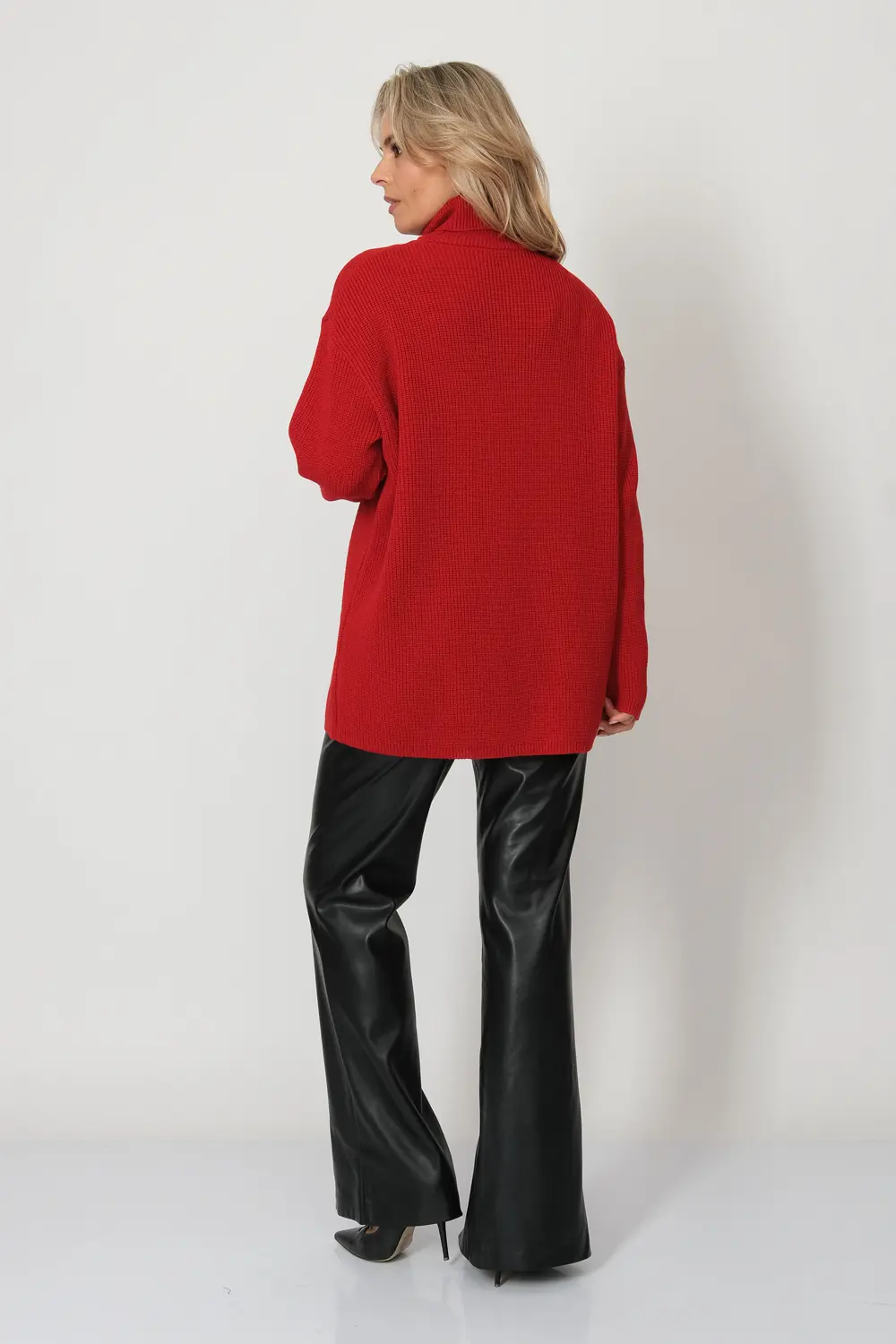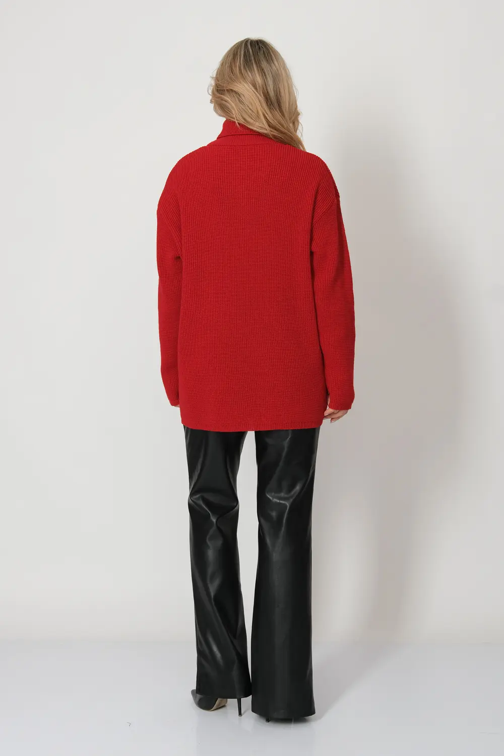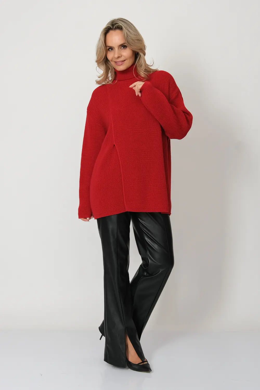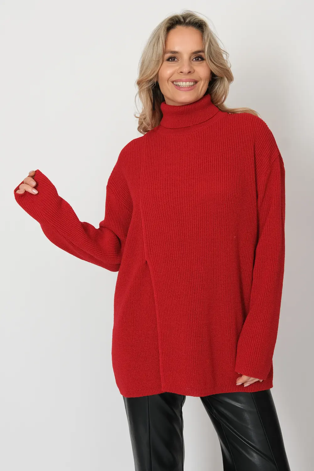 - Джемпер оверсайз с воротом-стойкой. Рукава длинные со спущенным плечом. По переднему полотну изделия сбоку стильный глубокий разрез.