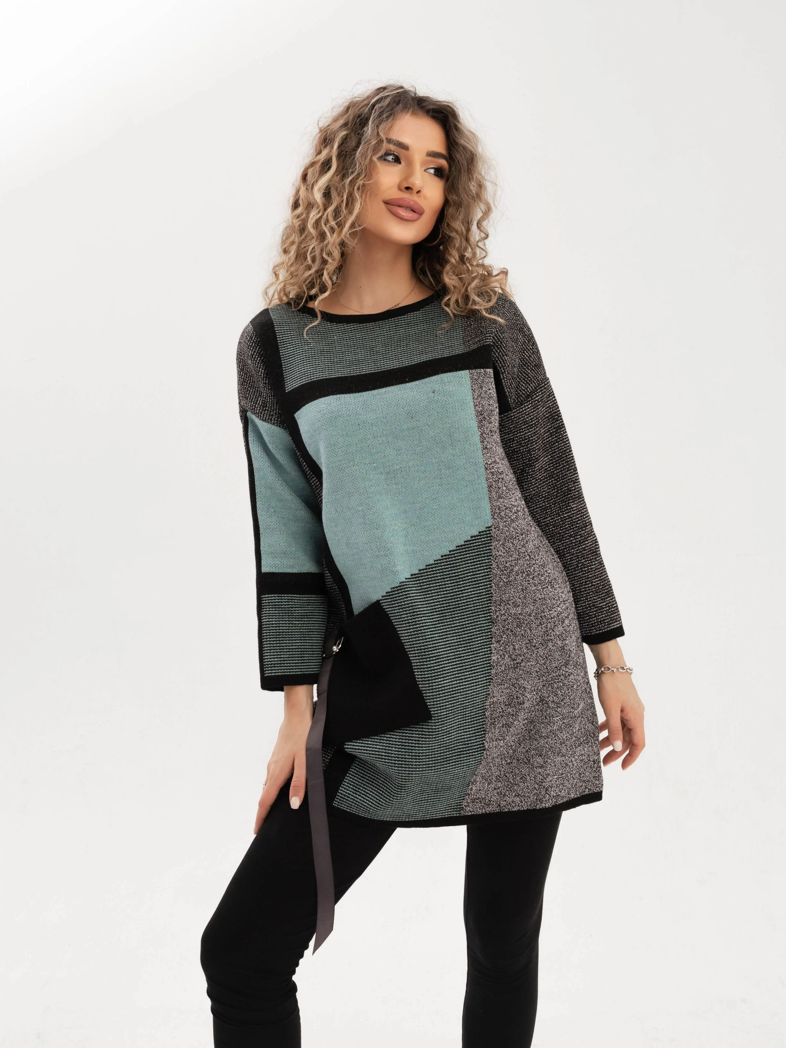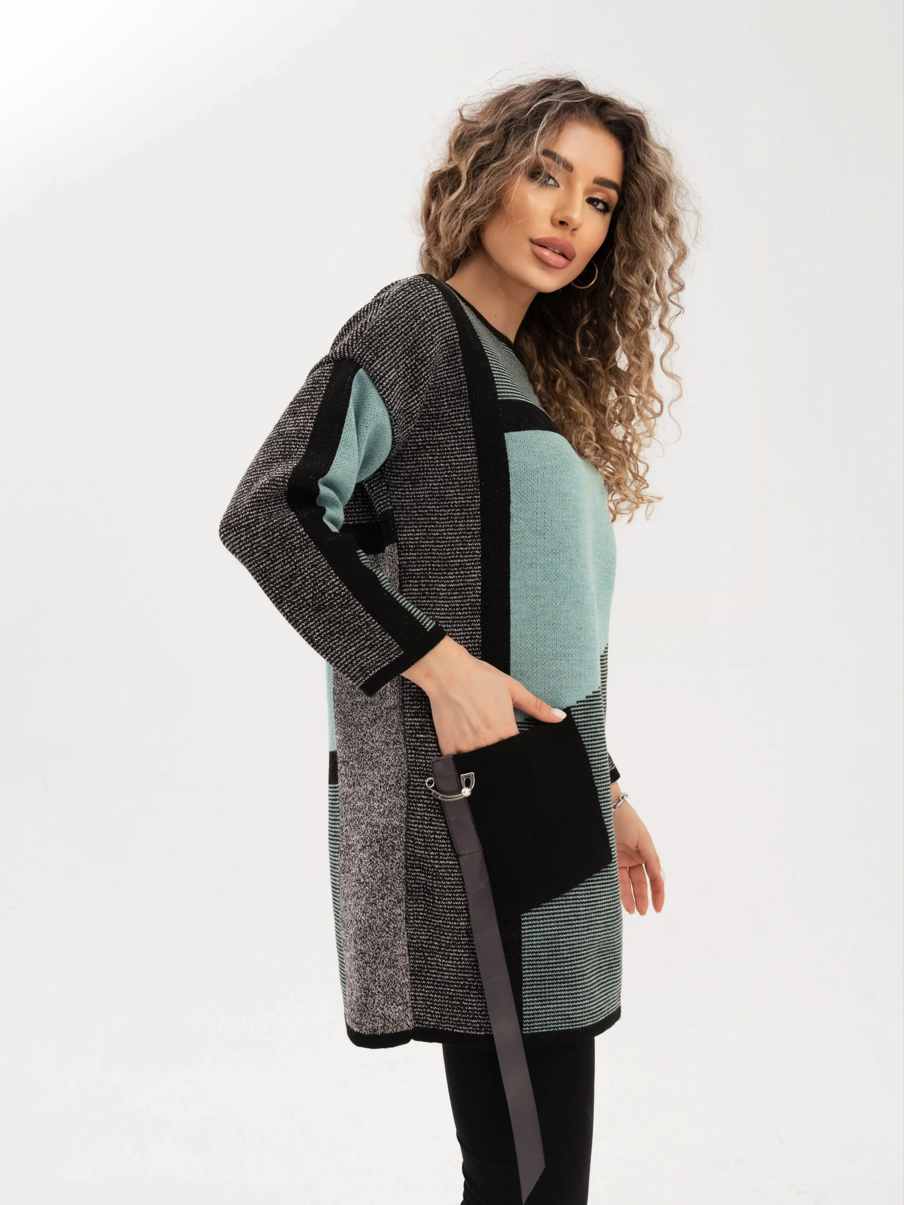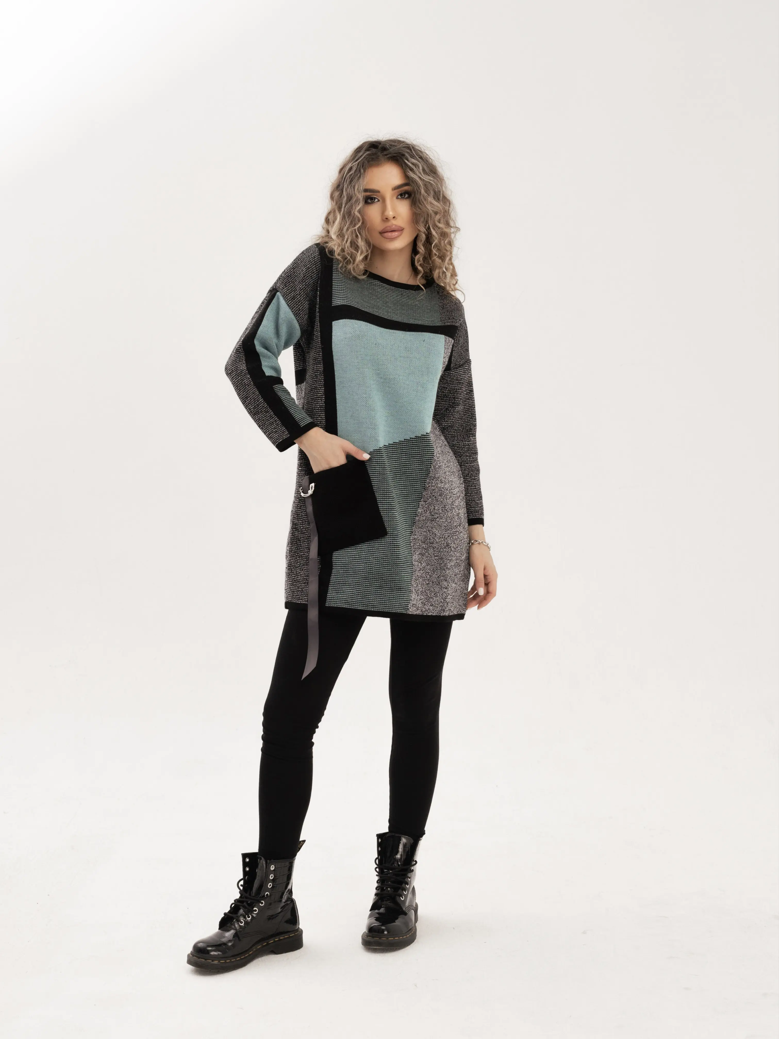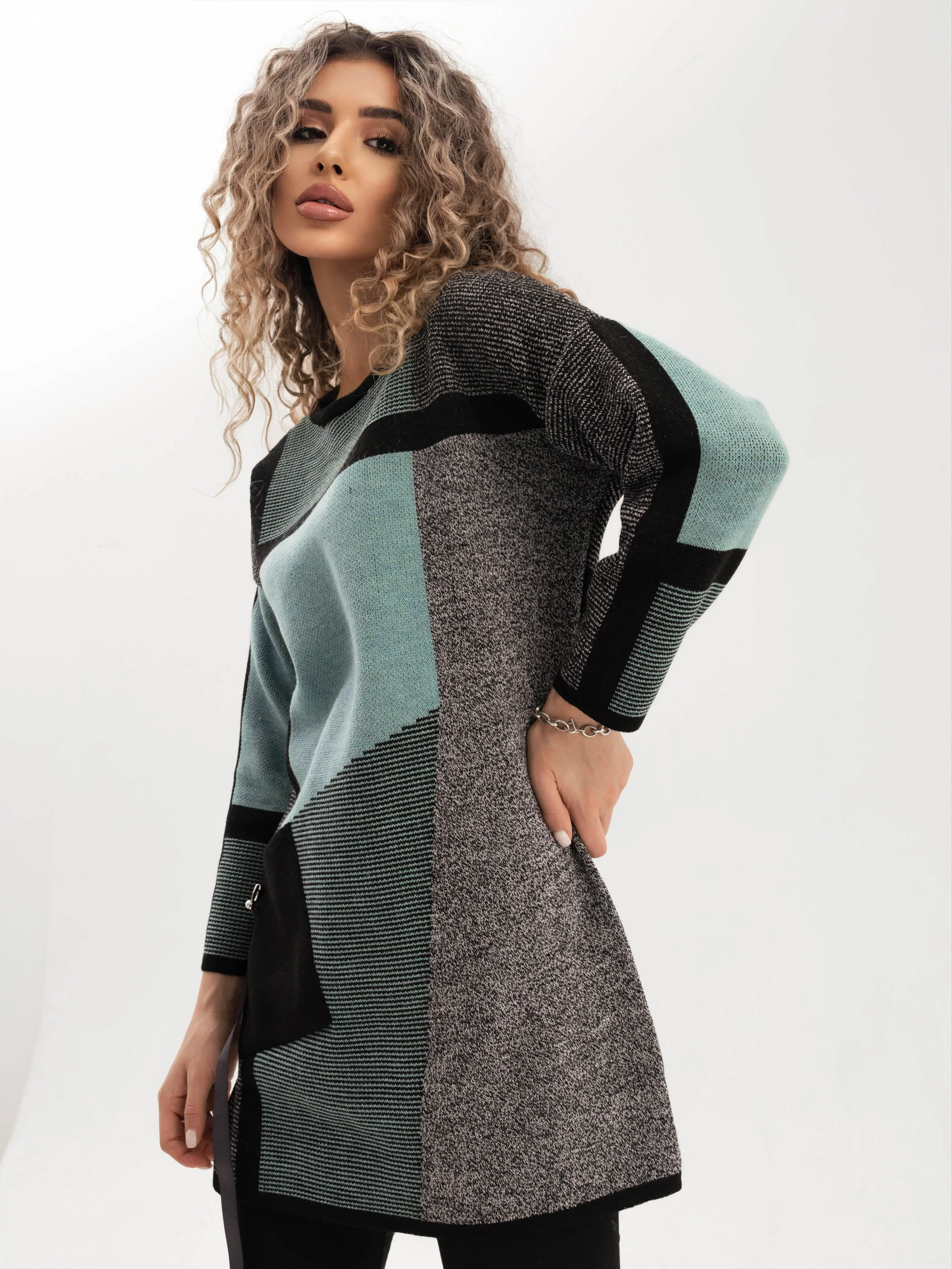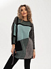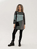 - Удлиненный джемпер полуприлегающего силуэта с круглой горловиной, выполнен в оригинальном цветовом решении. Рукав 3/4. Полочка, спинка и рукава выполнена в жаккардовом переплетении с контрастным геометрическим рисунком. Накладной карман с декоративной тесьмой.