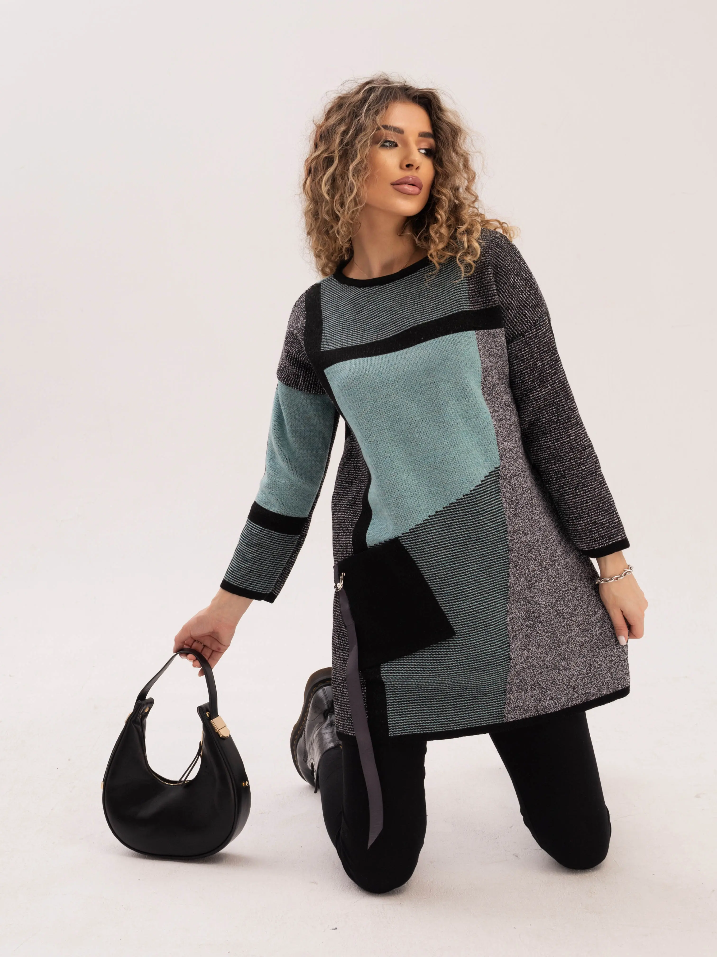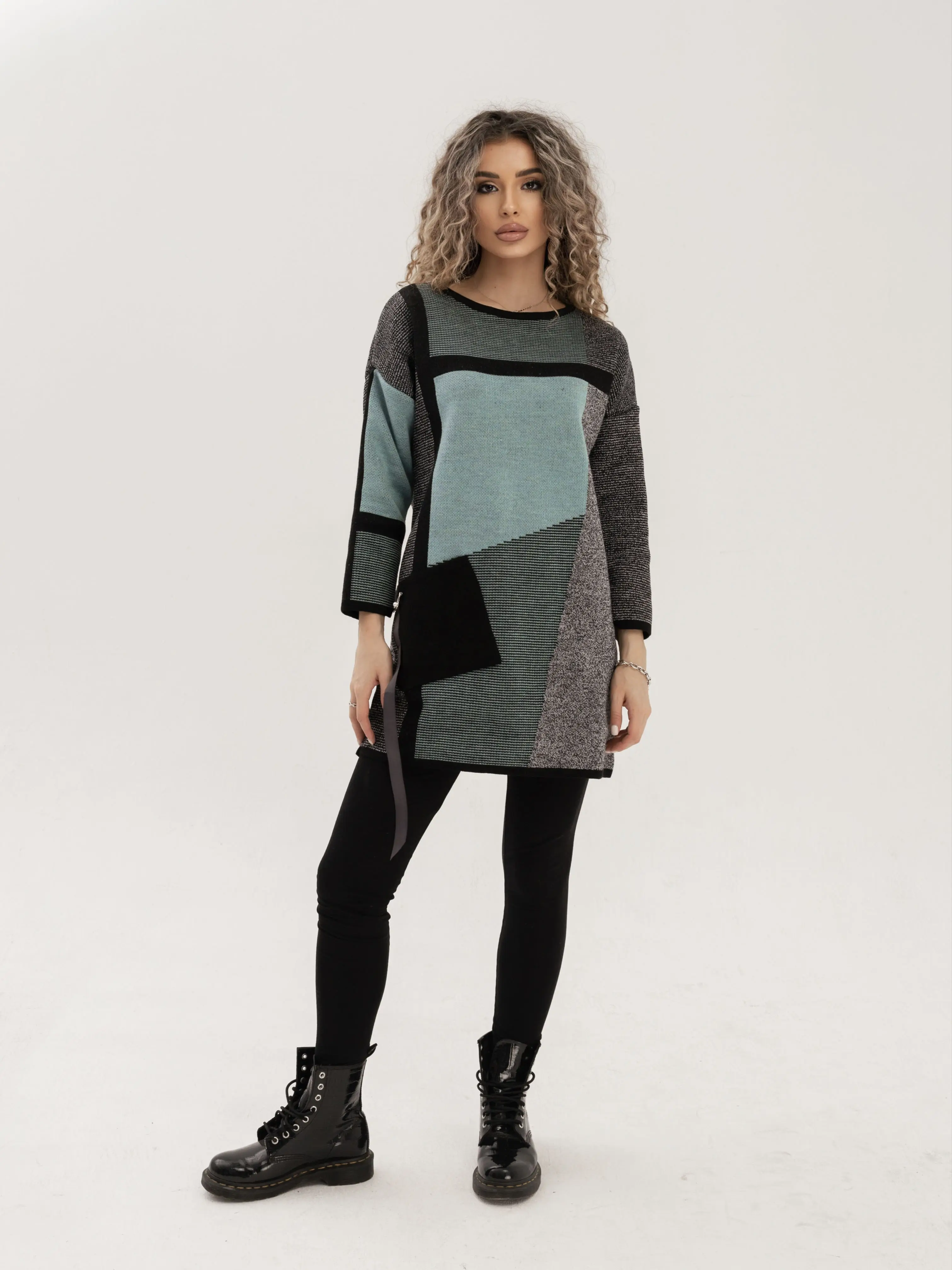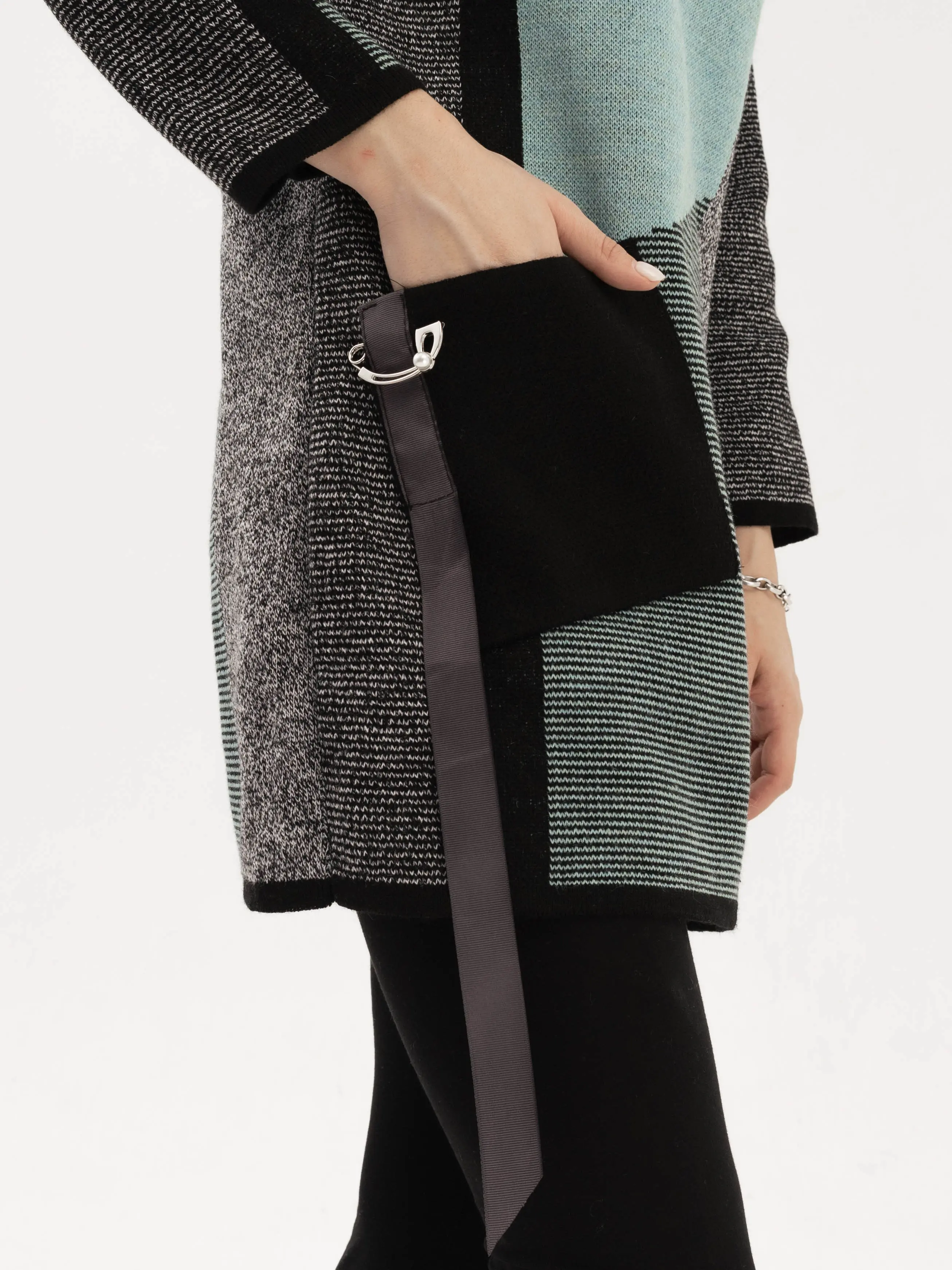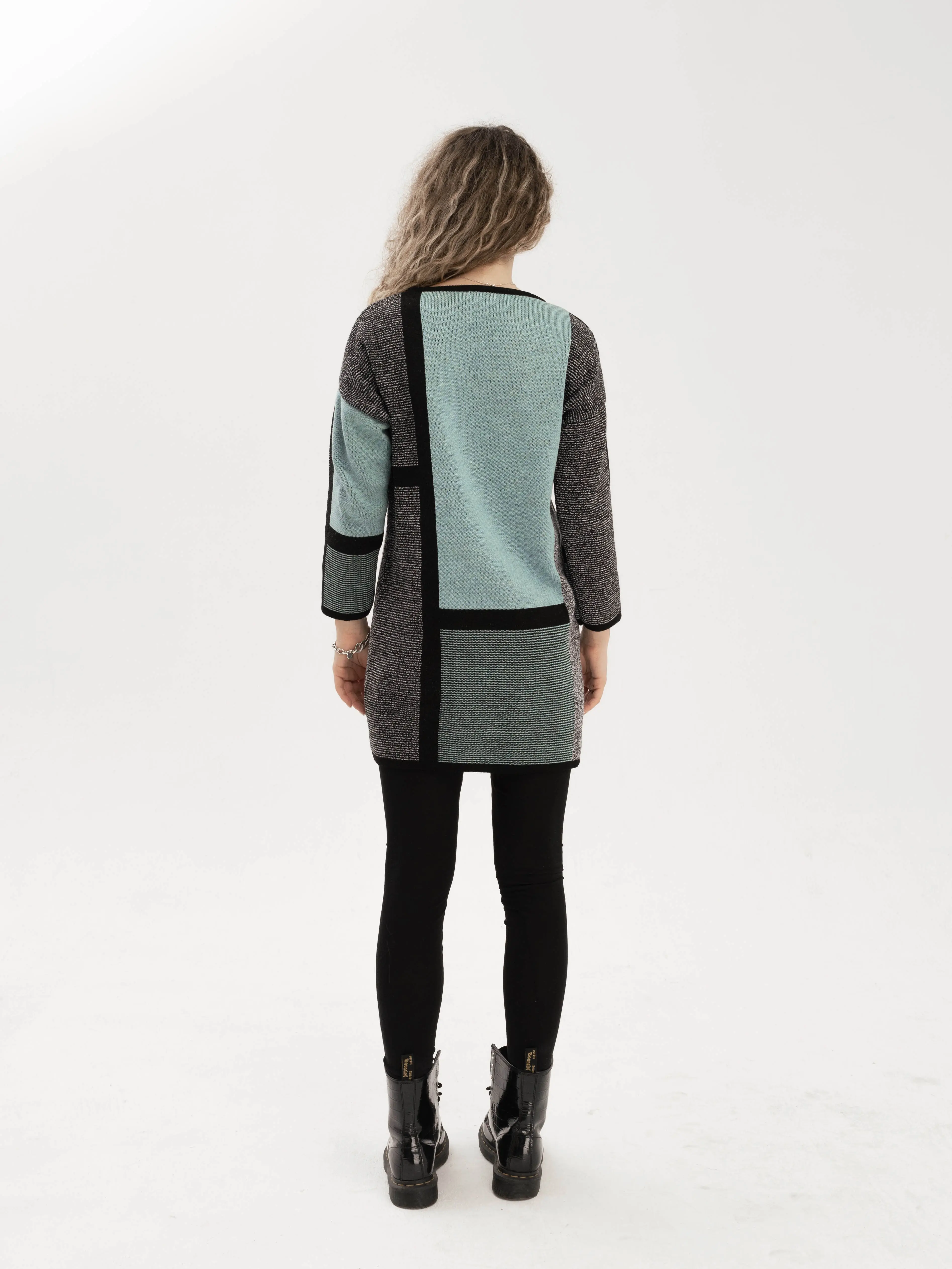 - Удлиненный джемпер полуприлегающего силуэта с круглой горловиной, выполнен в оригинальном цветовом решении. Рукав 3/4. Полочка, спинка и рукава выполнена в жаккардовом переплетении с контрастным геометрическим рисунком. Накладной карман с декоративной тесьмой.