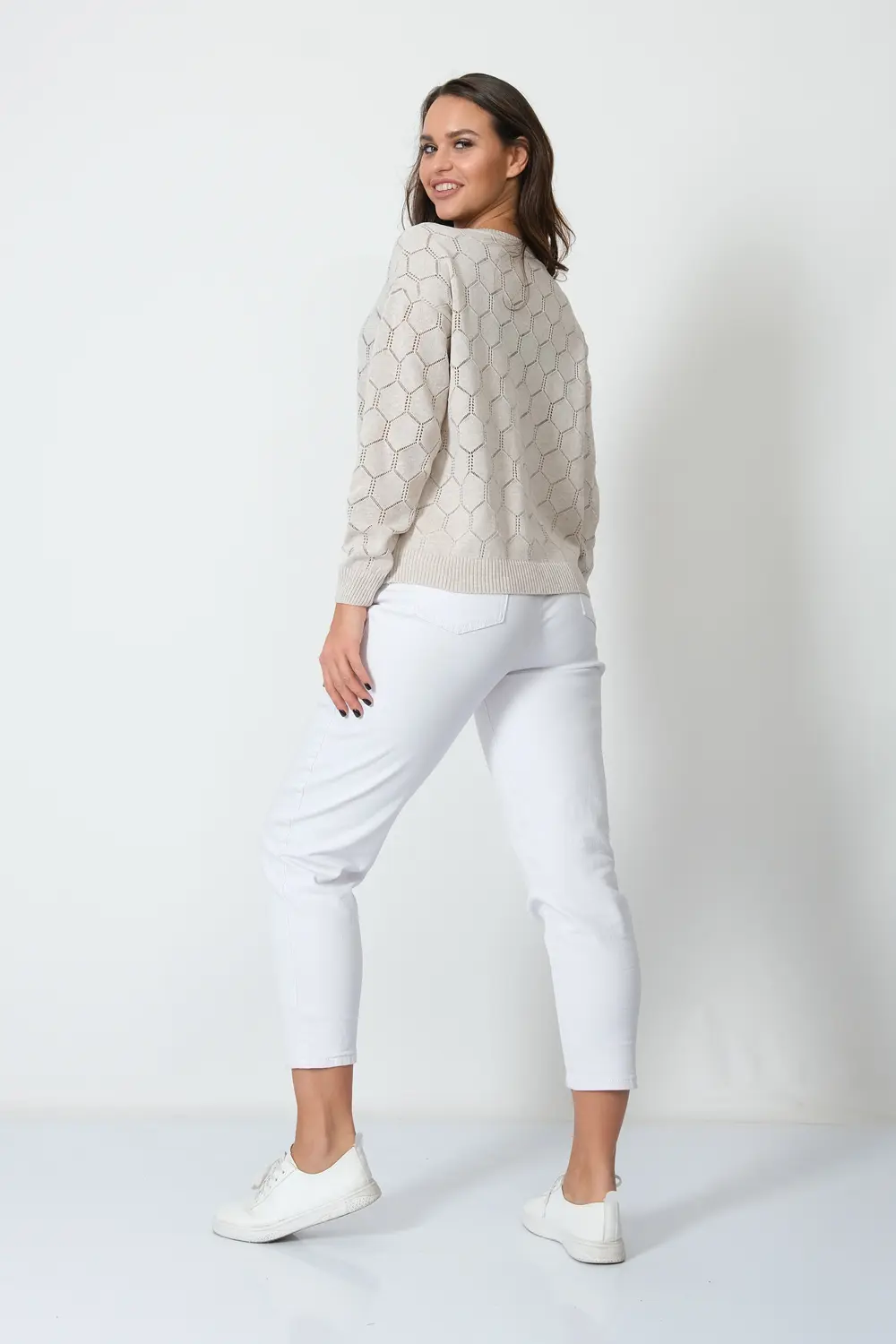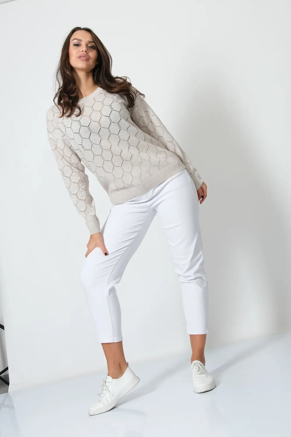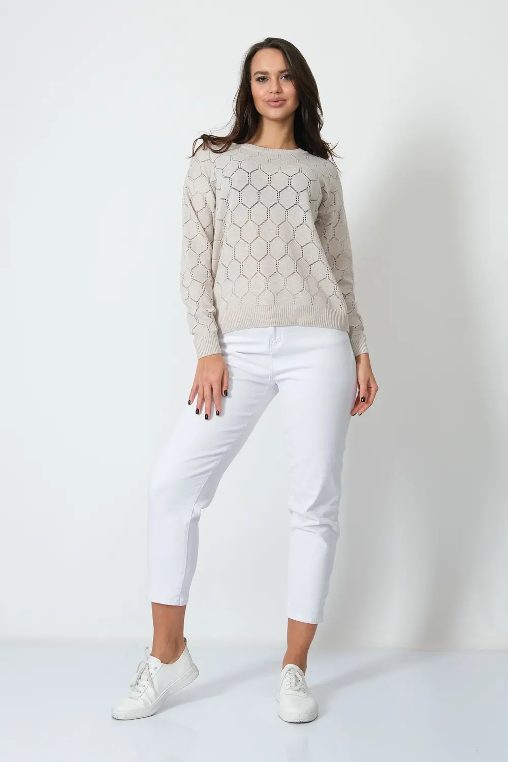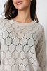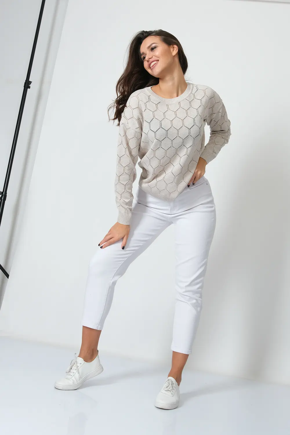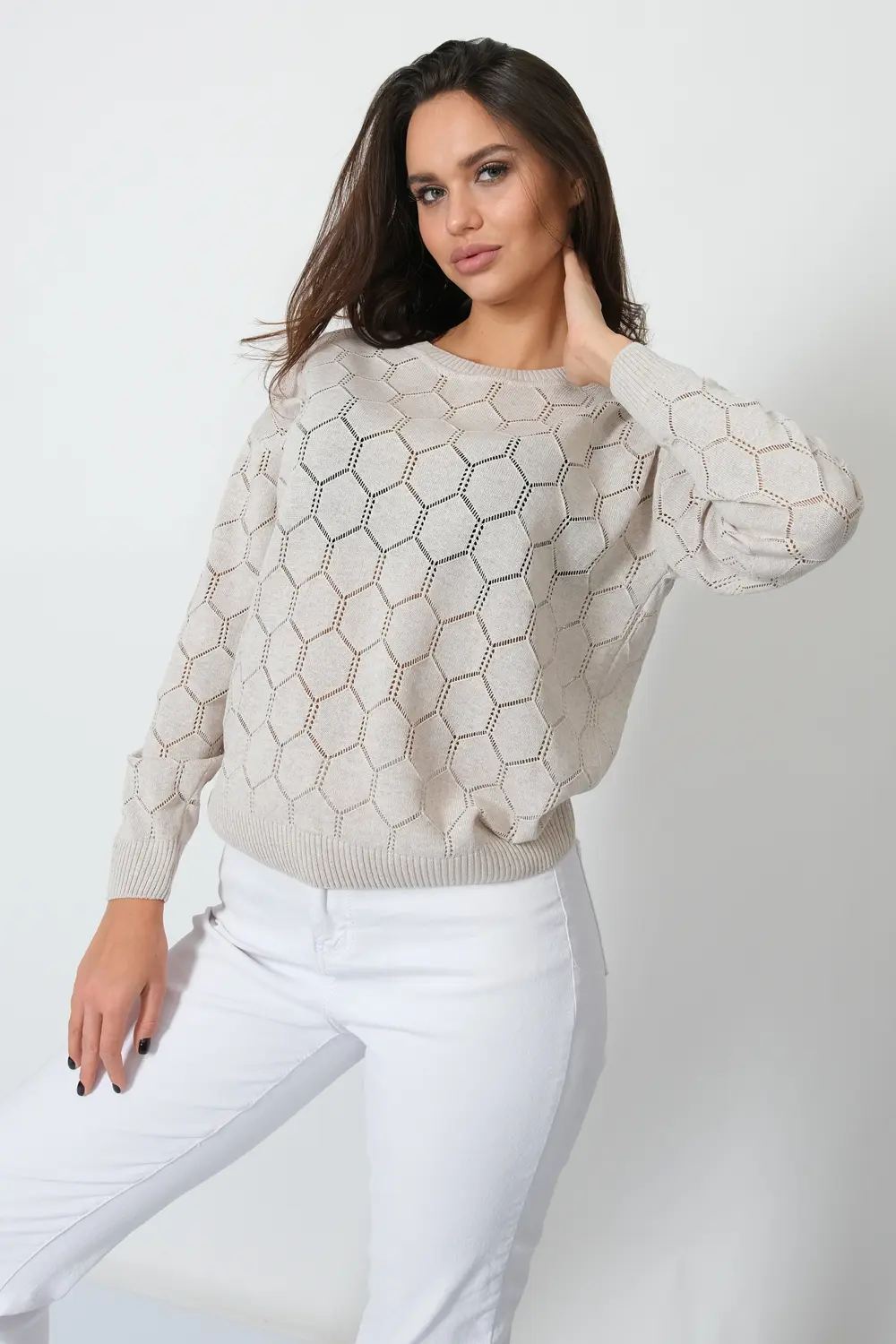 - Ажурный женский трикотажный джемпер свободного силуэта. Плечо спущенное, рукав длинный. Вырез горловины круглый. Джемпер выполнен ажурным переплетением, горловина, низ изделия и манжеты рукавов обработаны эластичным переплетением.