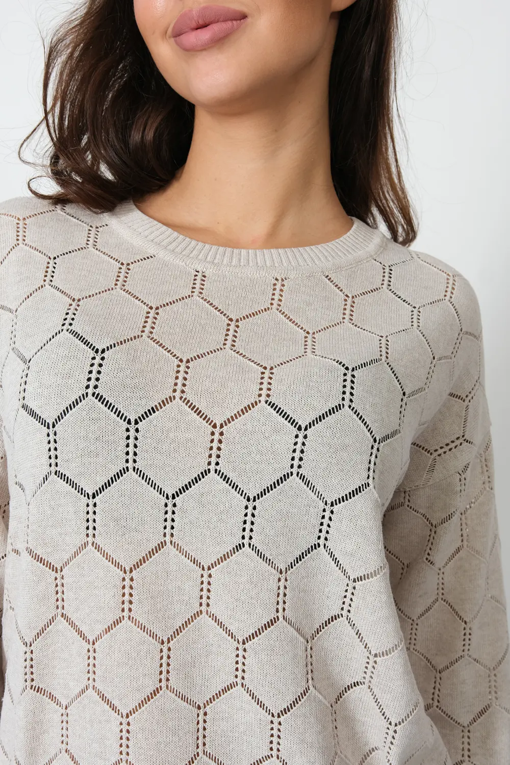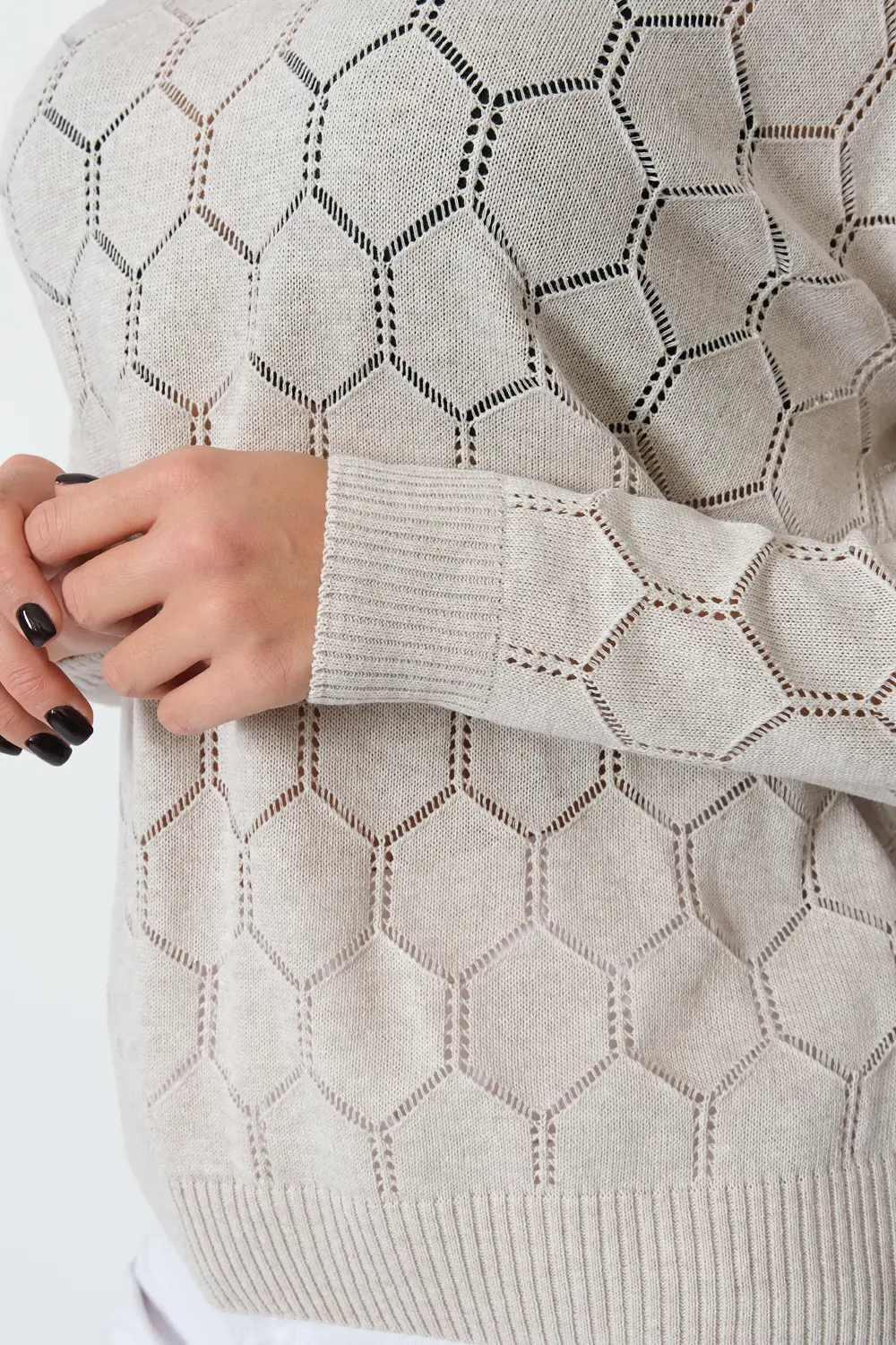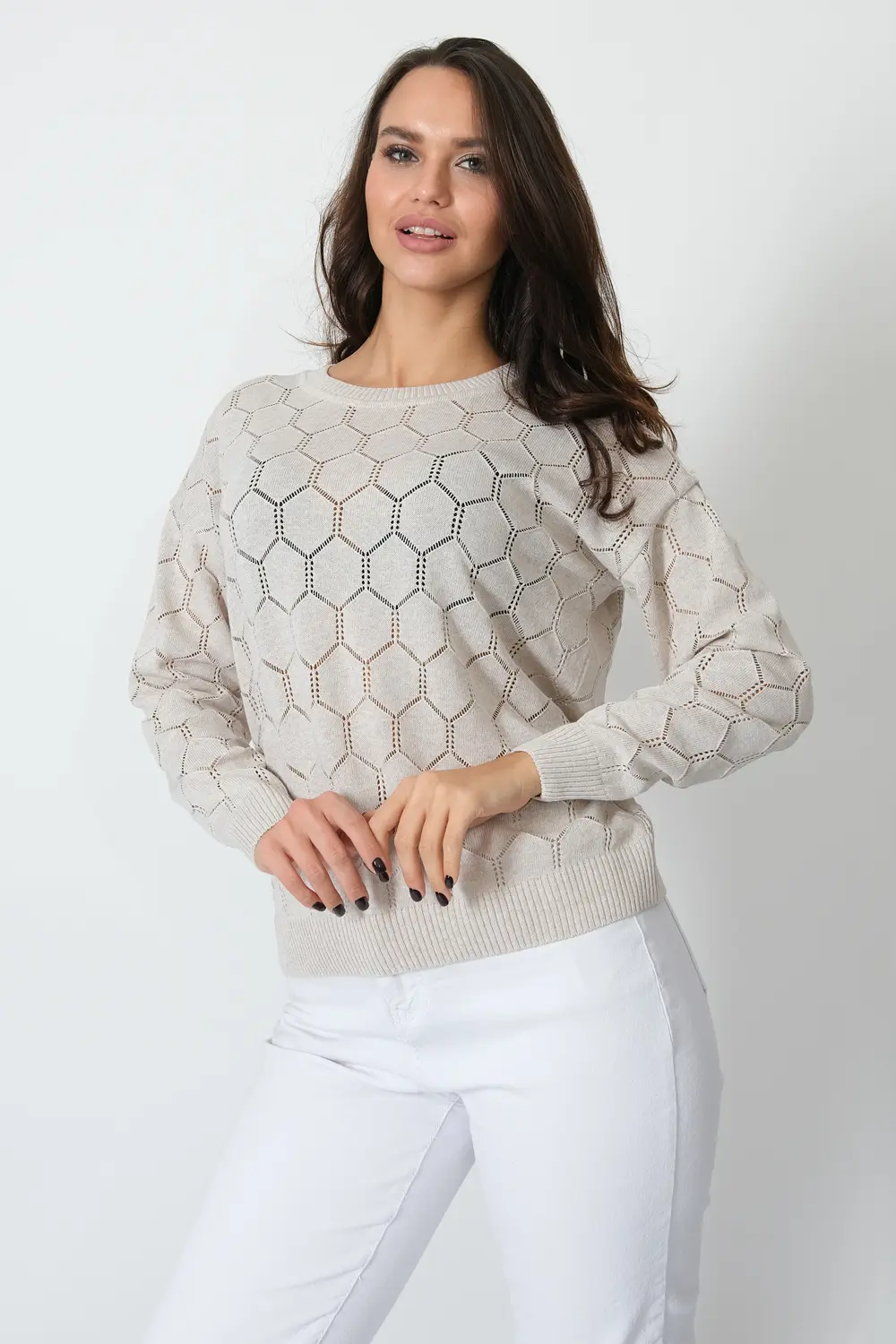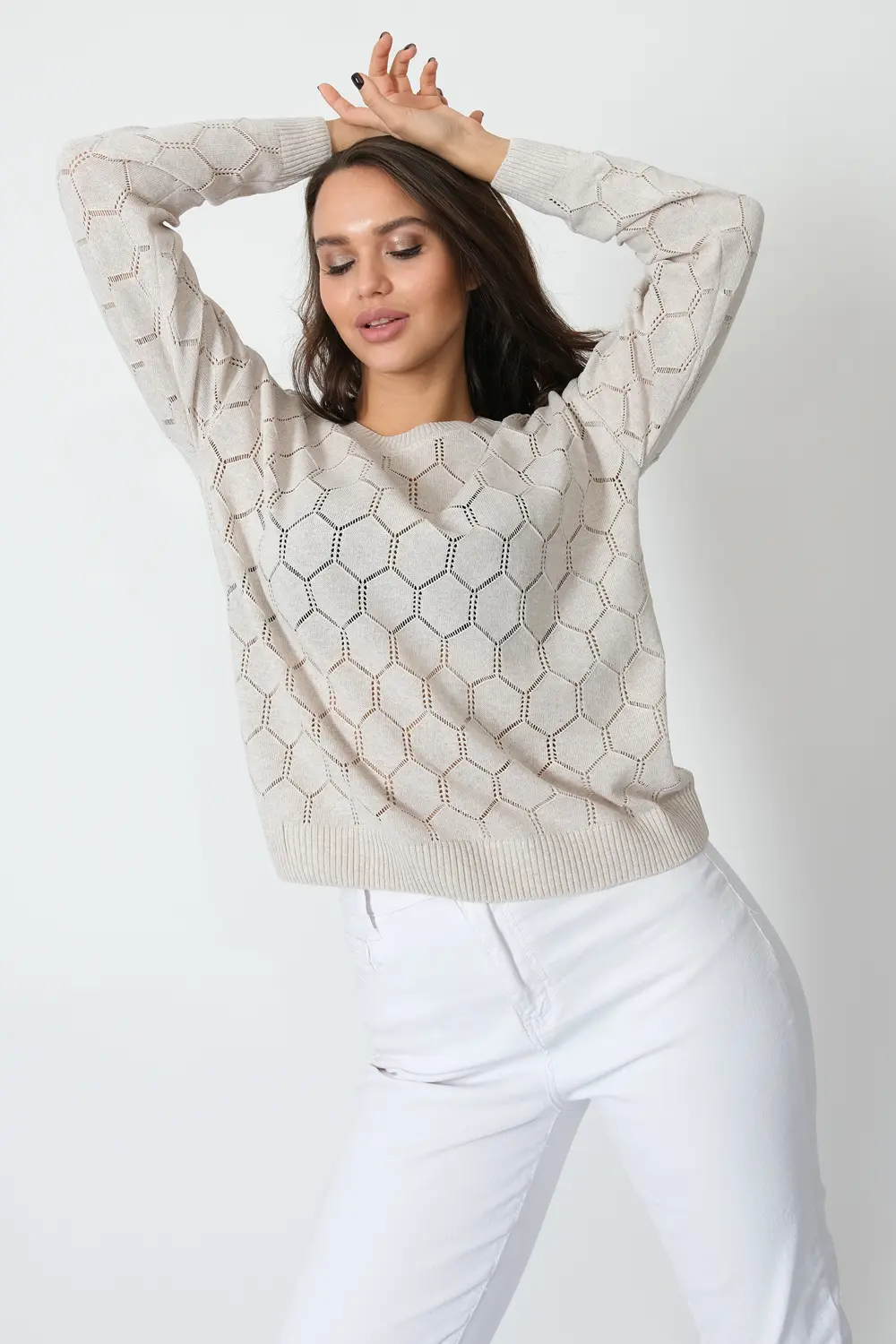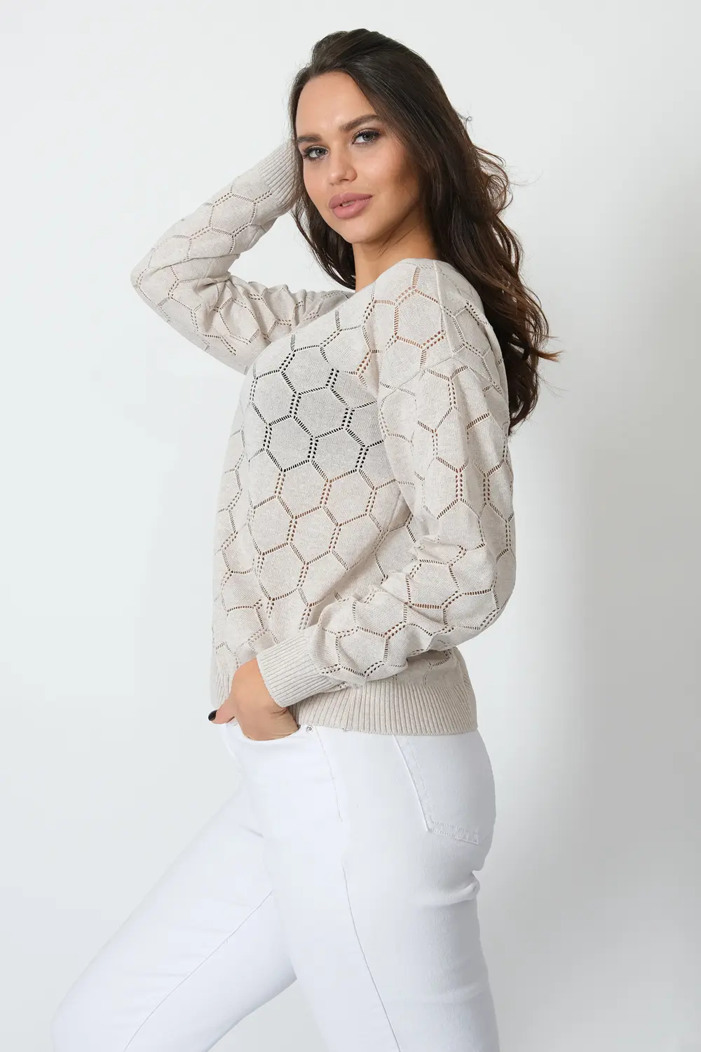 - Ажурный женский трикотажный джемпер свободного силуэта. Плечо спущенное, рукав длинный. Вырез горловины круглый. Джемпер выполнен ажурным переплетением, горловина, низ изделия и манжеты рукавов обработаны эластичным переплетением.