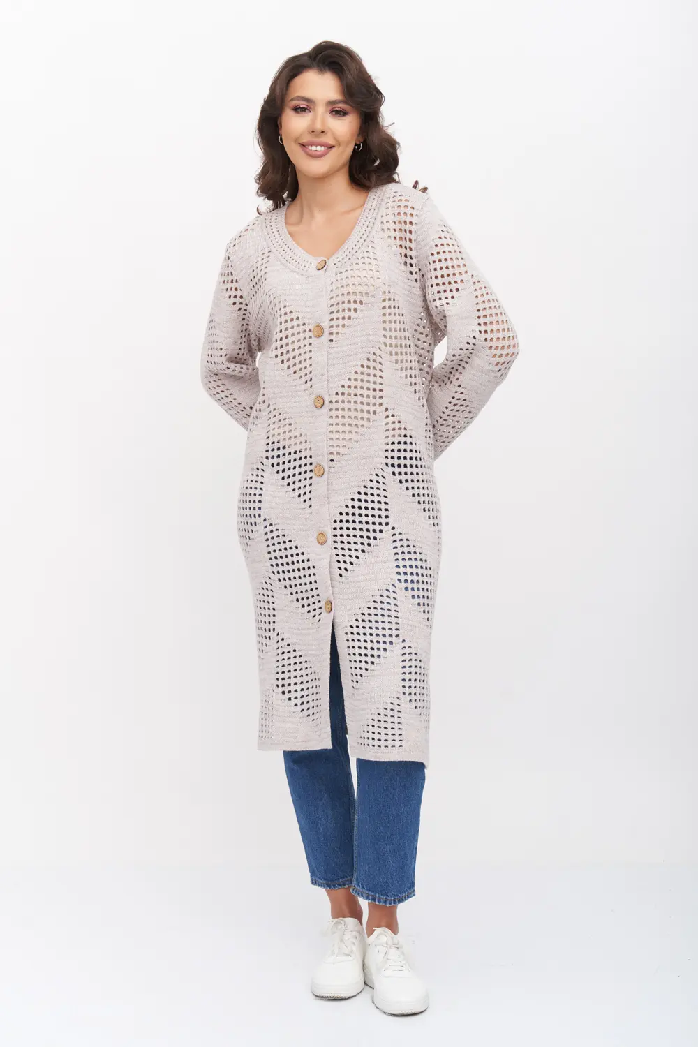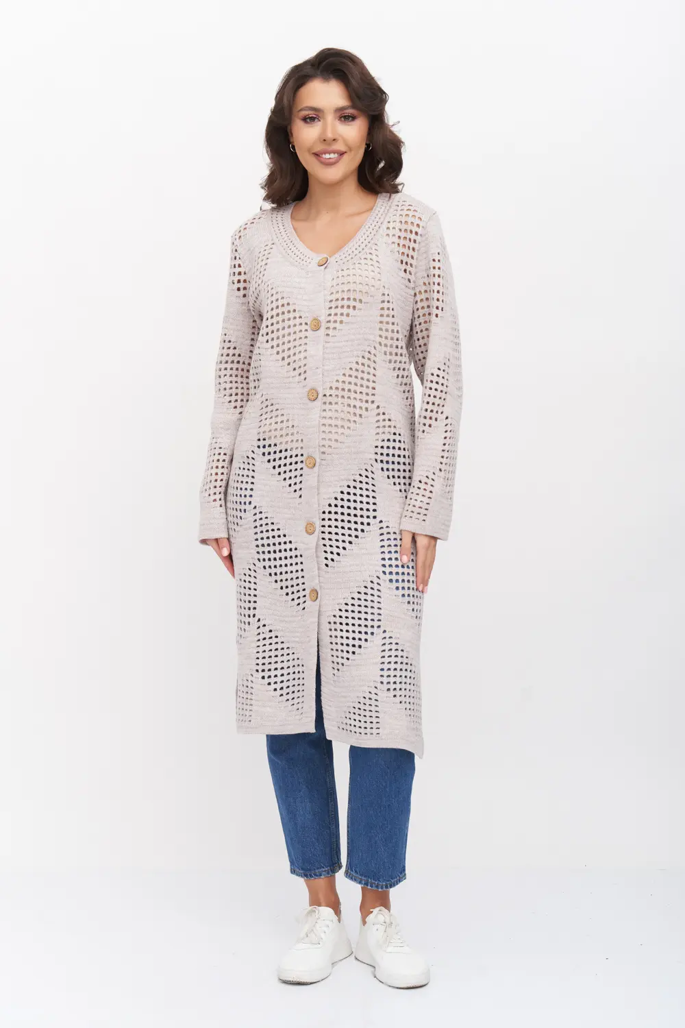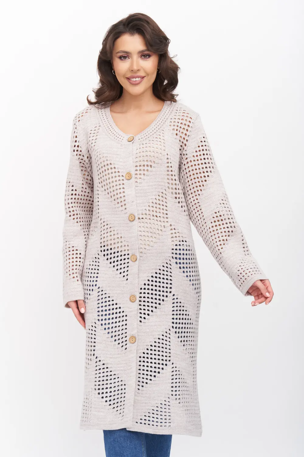 - Ажурный кардиган с круглой горловиной. Рукава втачные длинный. Кардиган застегивается по переду на крупные пуговицы.