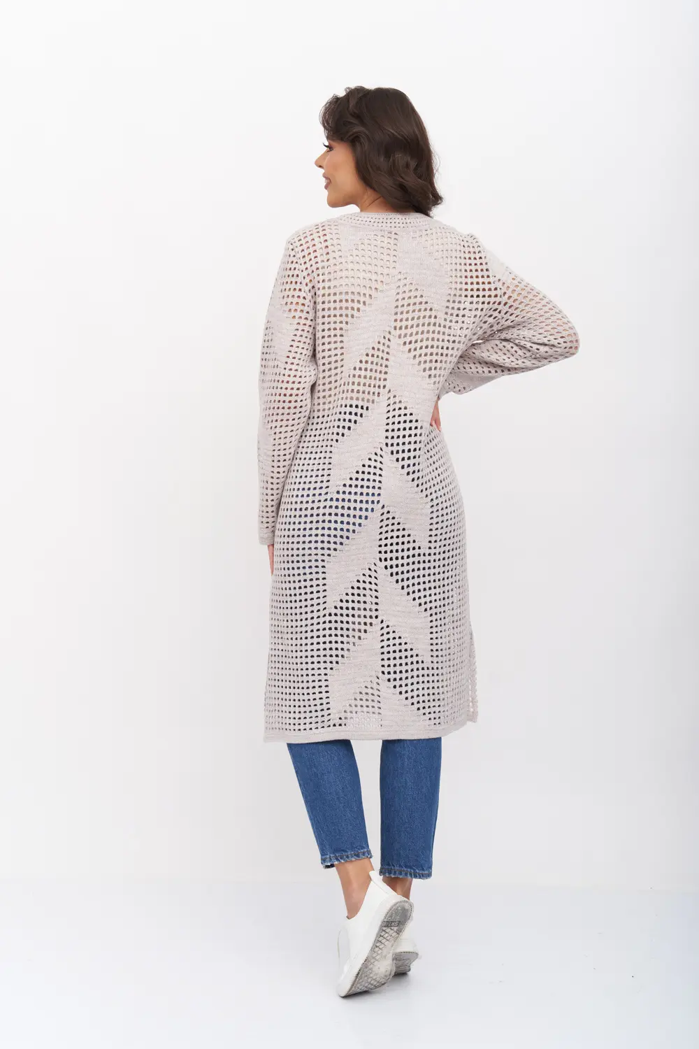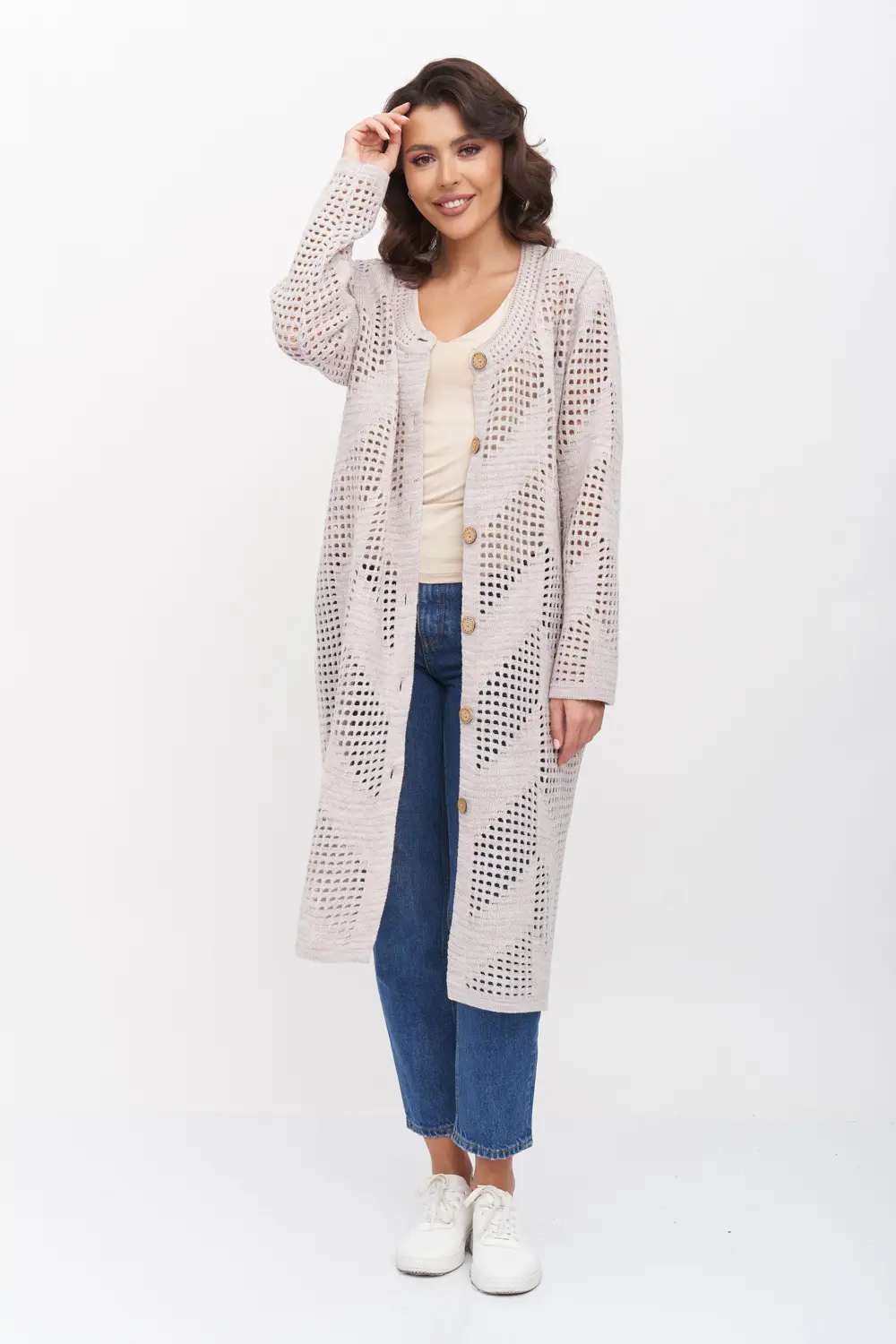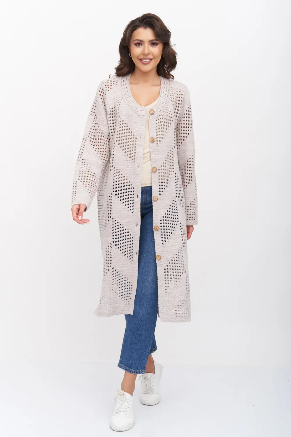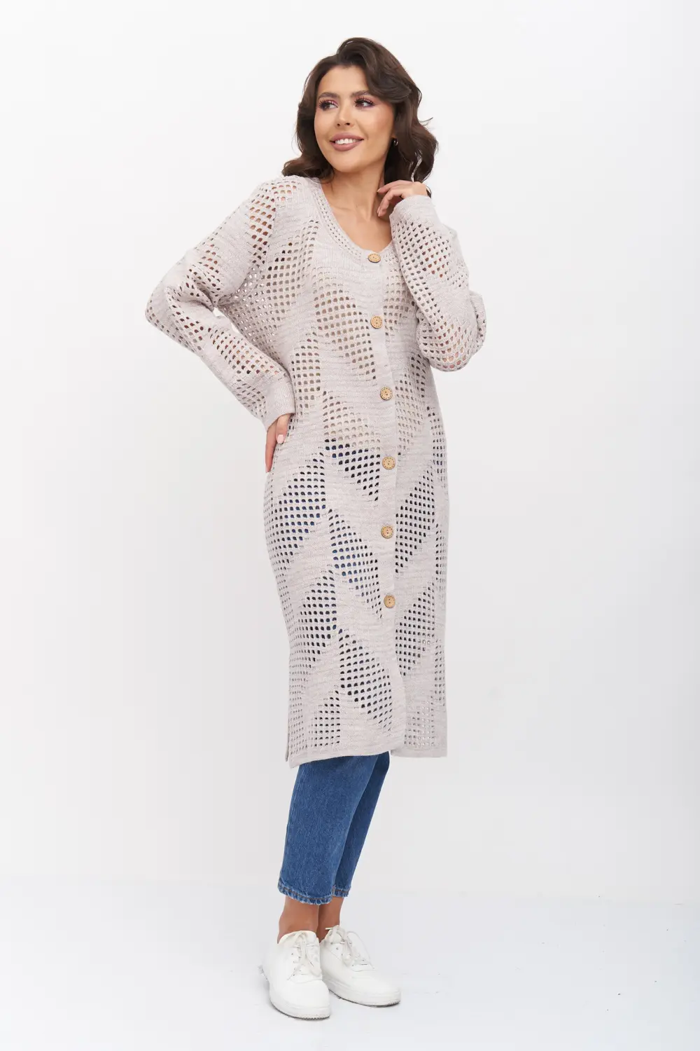- Ажурный кардиган с круглой горловиной. Рукава втачные длинный. Кардиган застегивается по переду на крупные пуговицы.