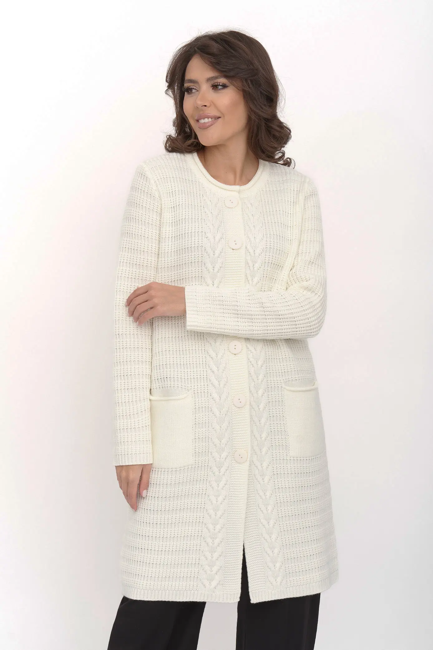 - Стильный вязаный женский кардиган прямого силуэта на пуговицах с круглой горловиной. Рукав втачной полной длины. Накладные карманы. Оригинальный узор с ажуром и косами. Кардиган с добавлением шерсти согреет в прохладную погоду и придаст оригинальности любому повседневному образу.