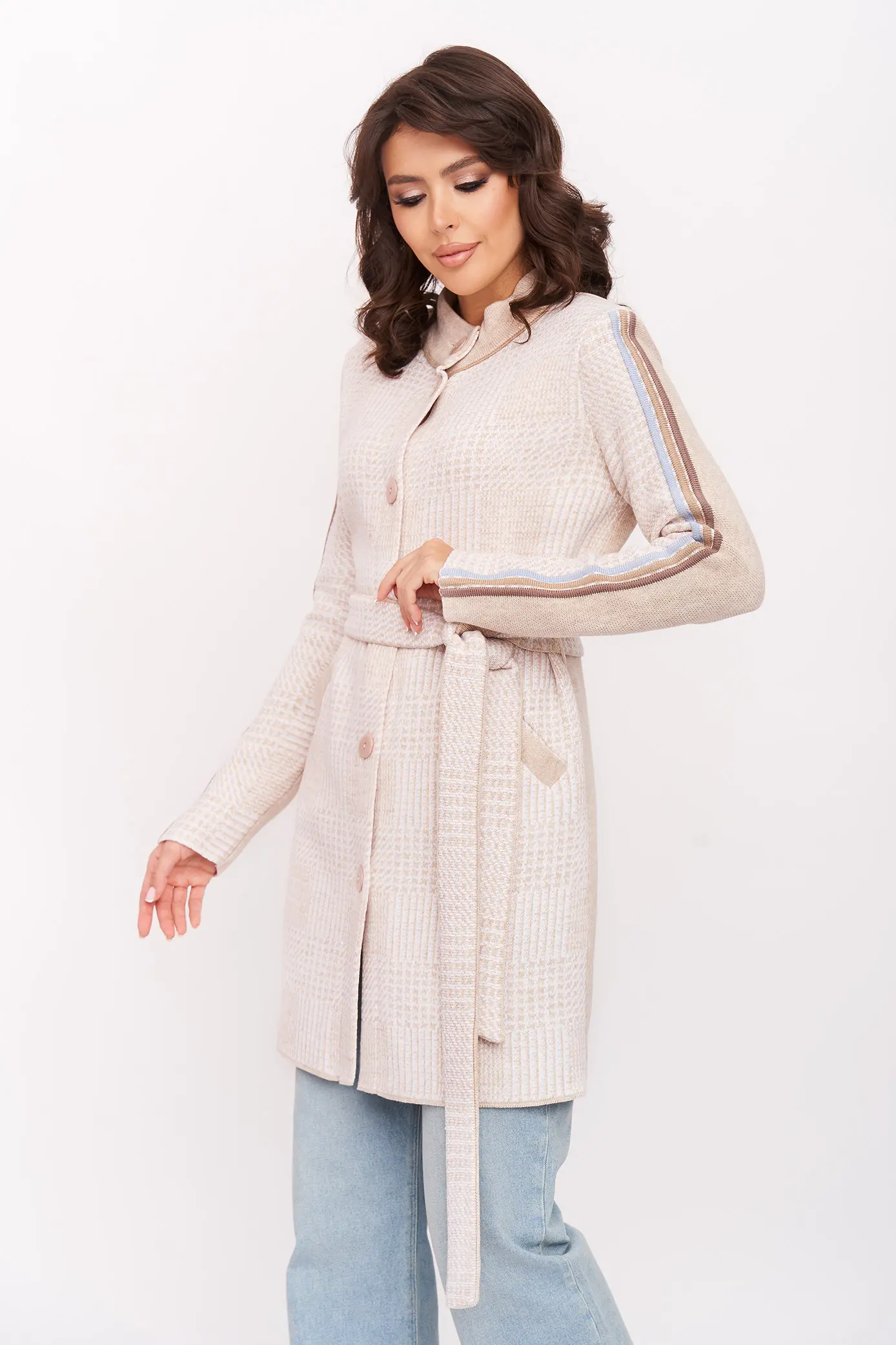 - Женский трикотажный кардиган прямого силуэта с поясом. Рукава втачные длинные, воротник-стойка. Застежка на пуговицы. Два прорезных кармана с листочкой. Кардиган выполнен жаккардовым переплетением, образующим клетку. Однотонная спинка.Отделка декоративной бейкой.