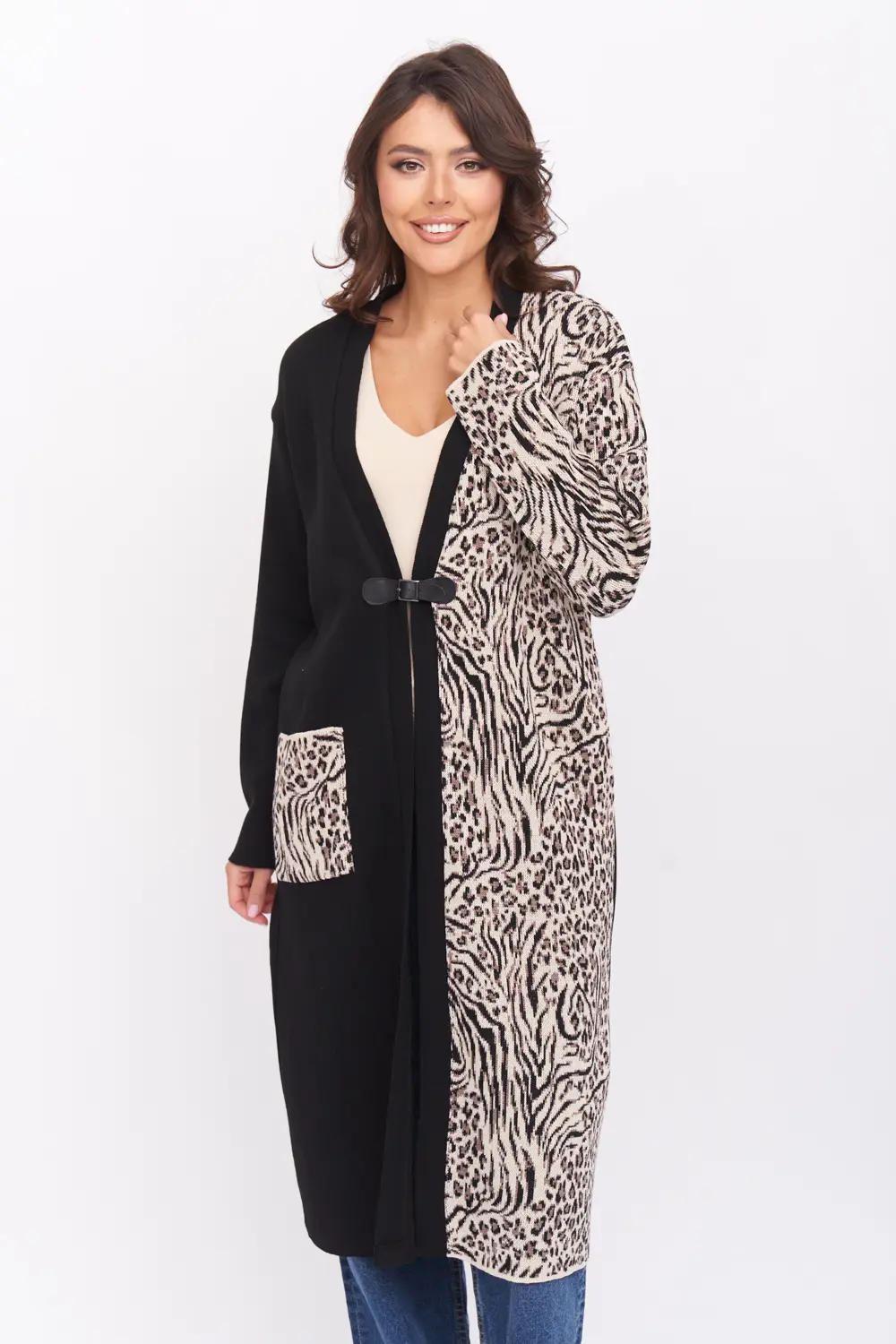 - Женский вязаный удлиненный кардиган со спущенным плечом. Рукава втачные длинные. V-вырез, накладной карман. Застегивается на пряжку. Это и классический длинный кардиган к офисному стилю, и объемная женская кофта для создания стильных образов. Кардиган за счет своего V-образного выреза выгодно подчеркнет вашу фигуру и зрительно увеличит ваш рост. Такая женская одежда подойдет на любой сезон. Кардиган можно использовать в прохладное время года как верхнюю одежду вместо пальто или офисный пиджак. Оригинальная расцветка придется по вкусу изысканным модницам.