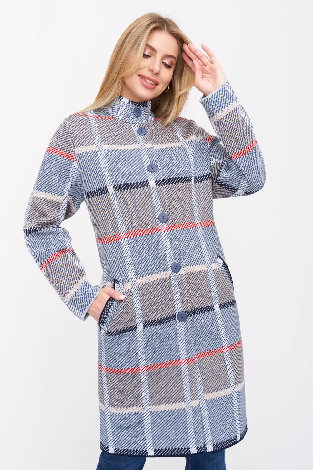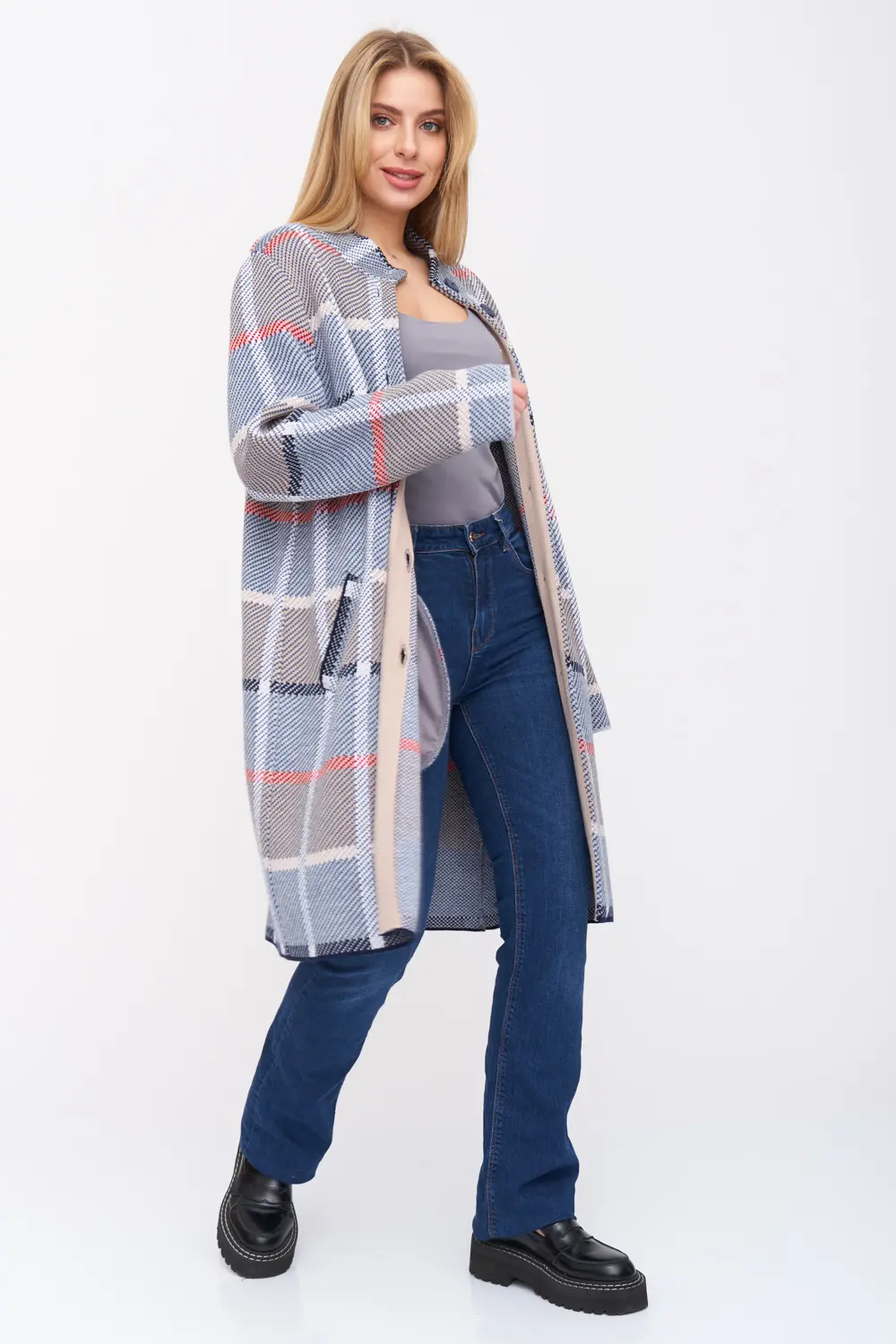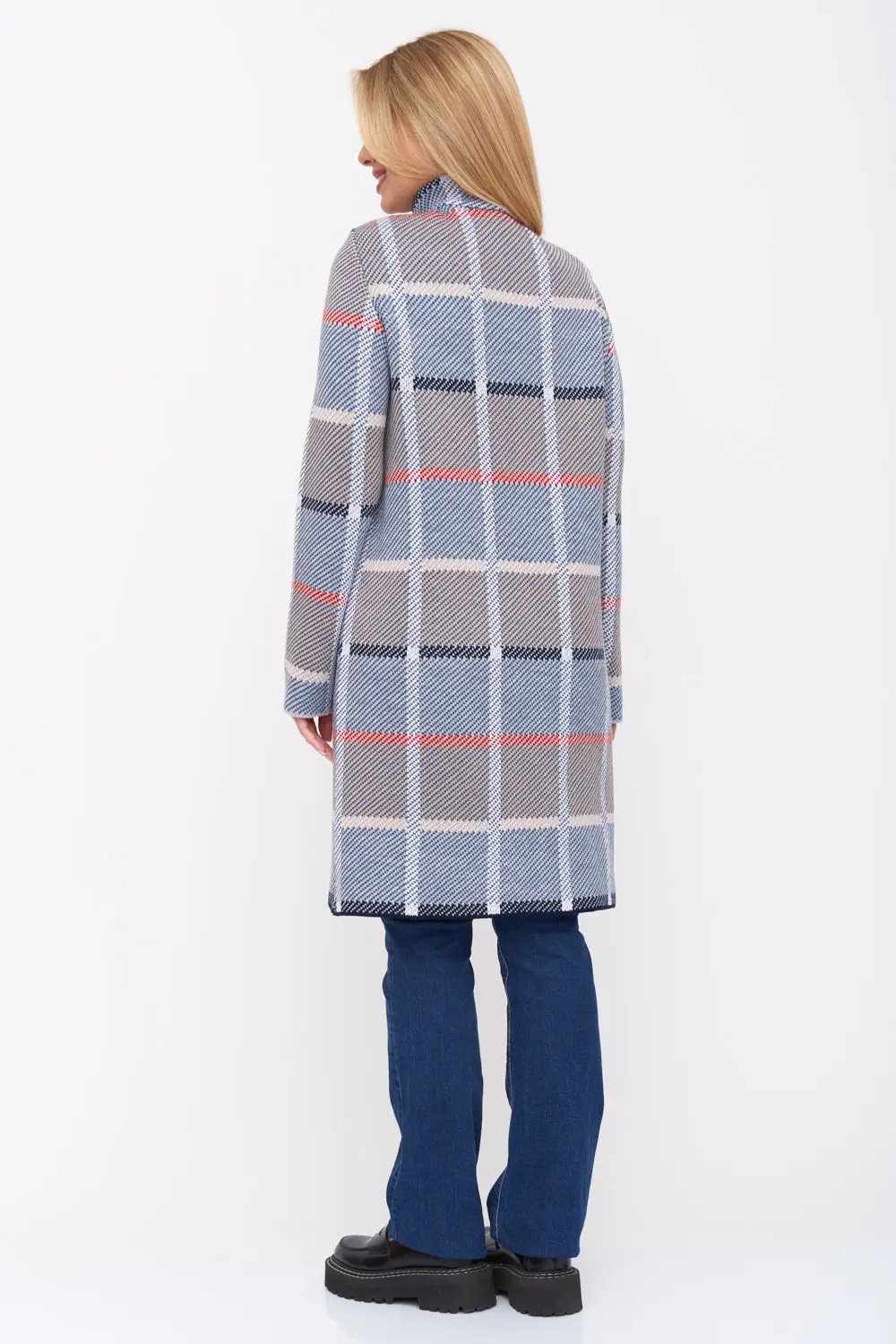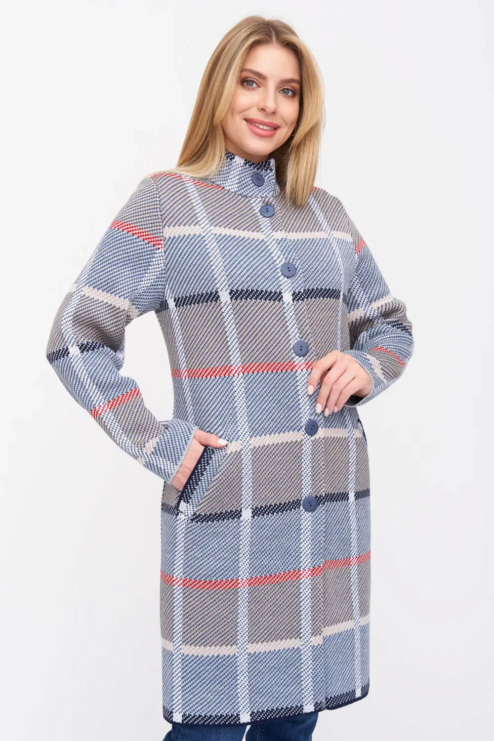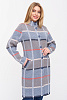 - Кардиган женский трикотажный свободного силуэта. Воротник -стойка, рукава втачные длинные. Два функциональных прорезных кармана, Кардиган выполнен жаккардовым переплетением, образуя геометрический рисунок-клетка.