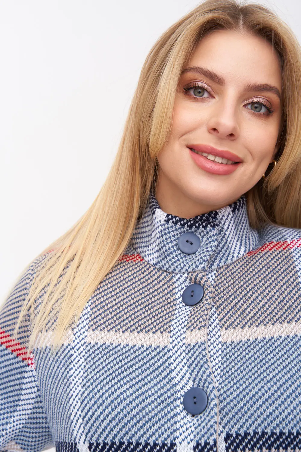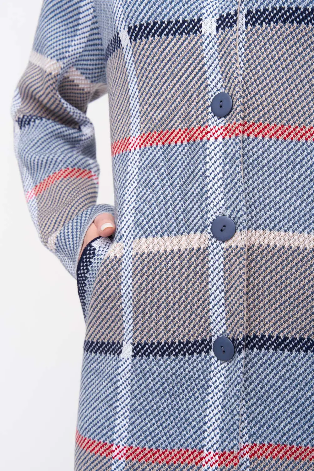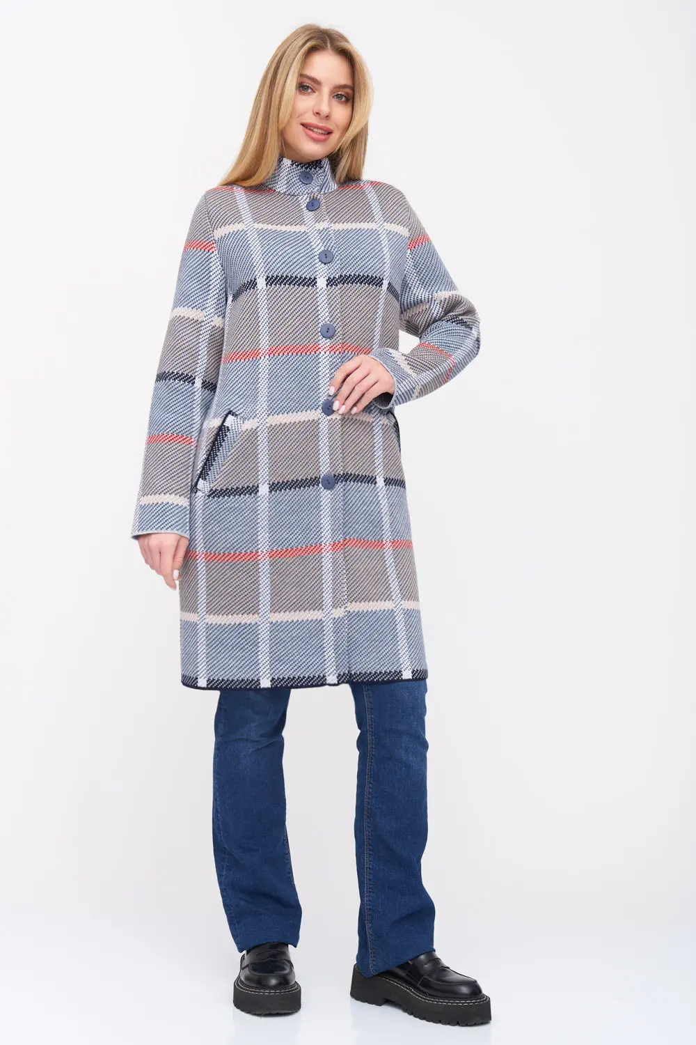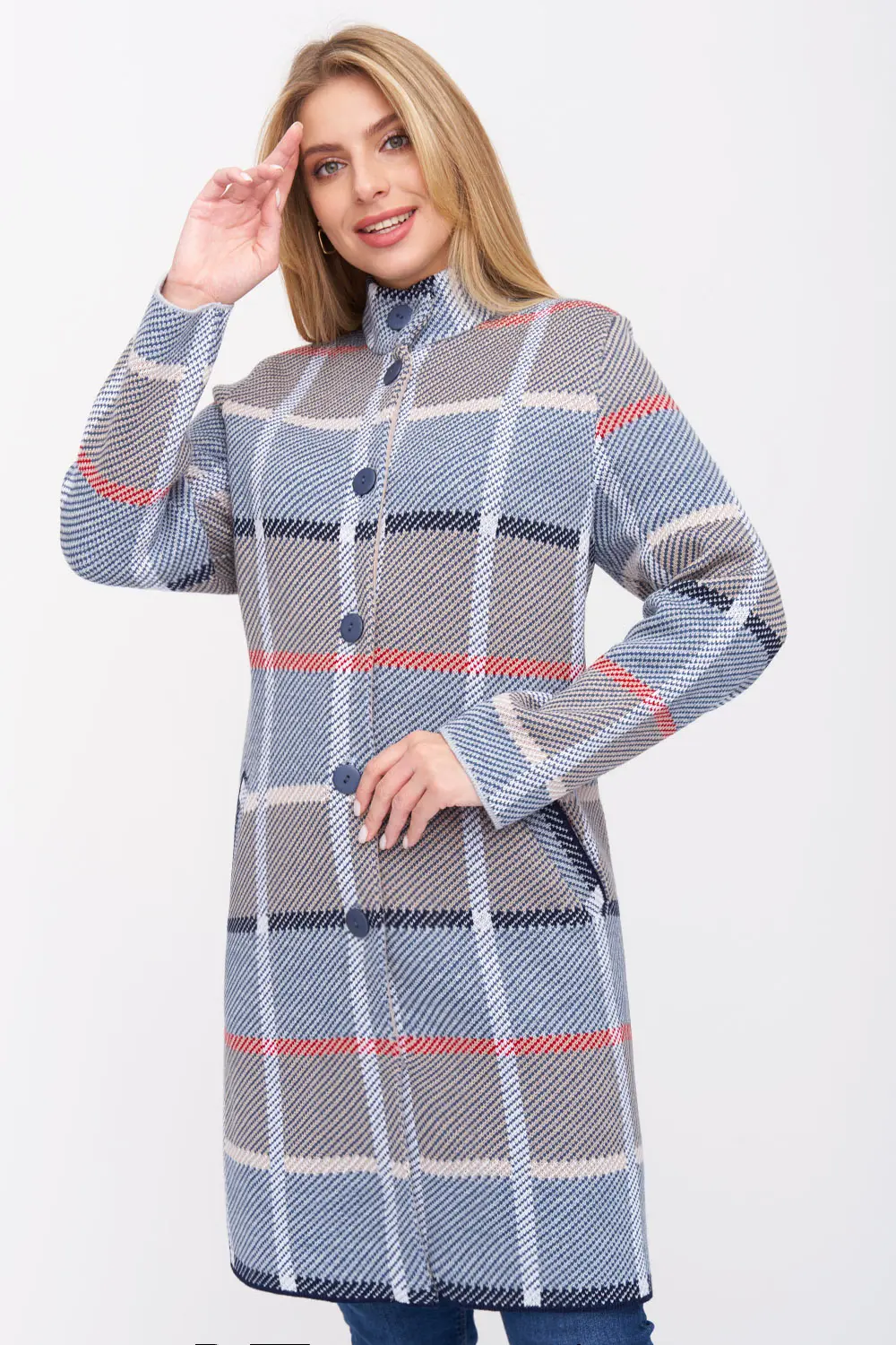 - Кардиган женский трикотажный свободного силуэта. Воротник -стойка, рукава втачные длинные. Два функциональных прорезных кармана, Кардиган выполнен жаккардовым переплетением, образуя геометрический рисунок-клетка.