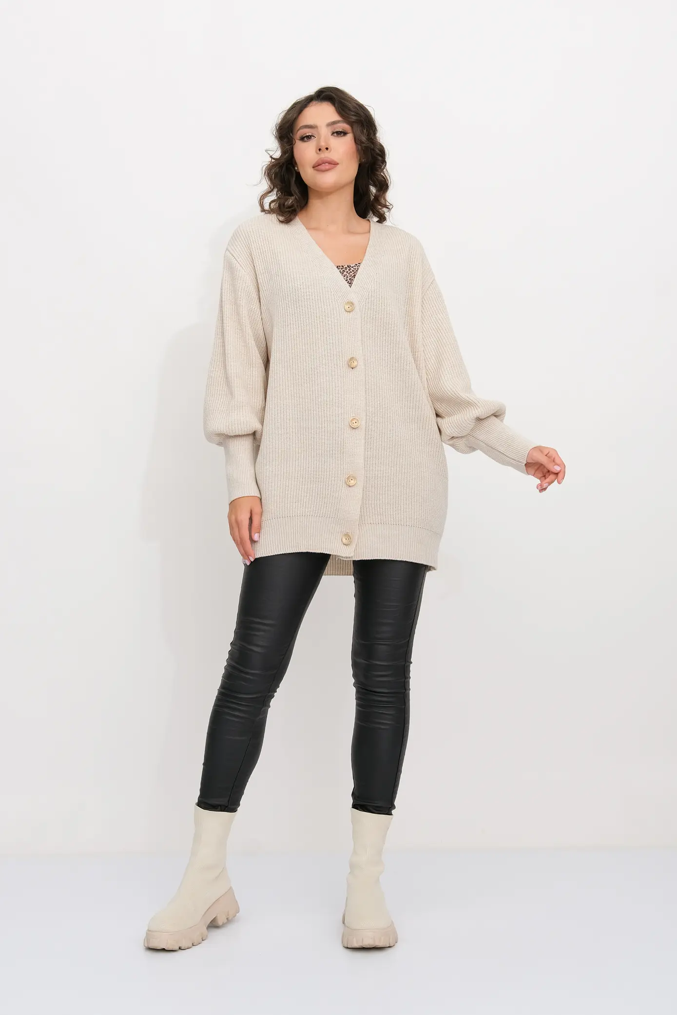 - Жакет свободного силуэта. Плечо спущенное, рукава втачные длинные. По переду застегивается на крупные пуговицы образуя V-образный вырез горловины. Жакет выполнен "жемчужными" петлями. Бейка по переду, низ изделия и манжеты выполнены эластичным переплетением.