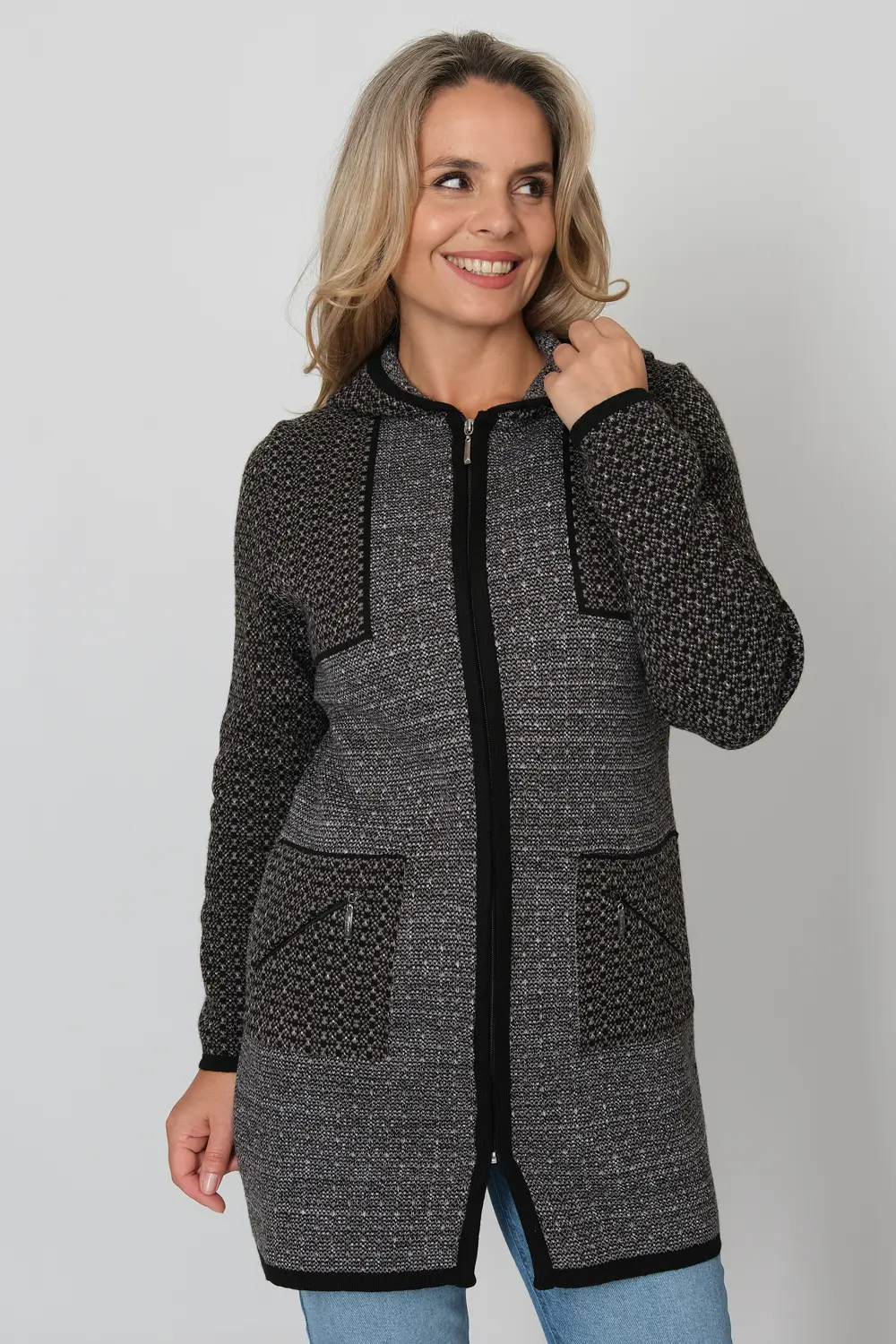 - Женский вязаный кардиган полуприлегающего силуэта с капюшоном. Кардиган на молнии. Рукава втачные длинные. Накладные карманы на молнии. Кардиган выполнен жаккардовым переплетением.