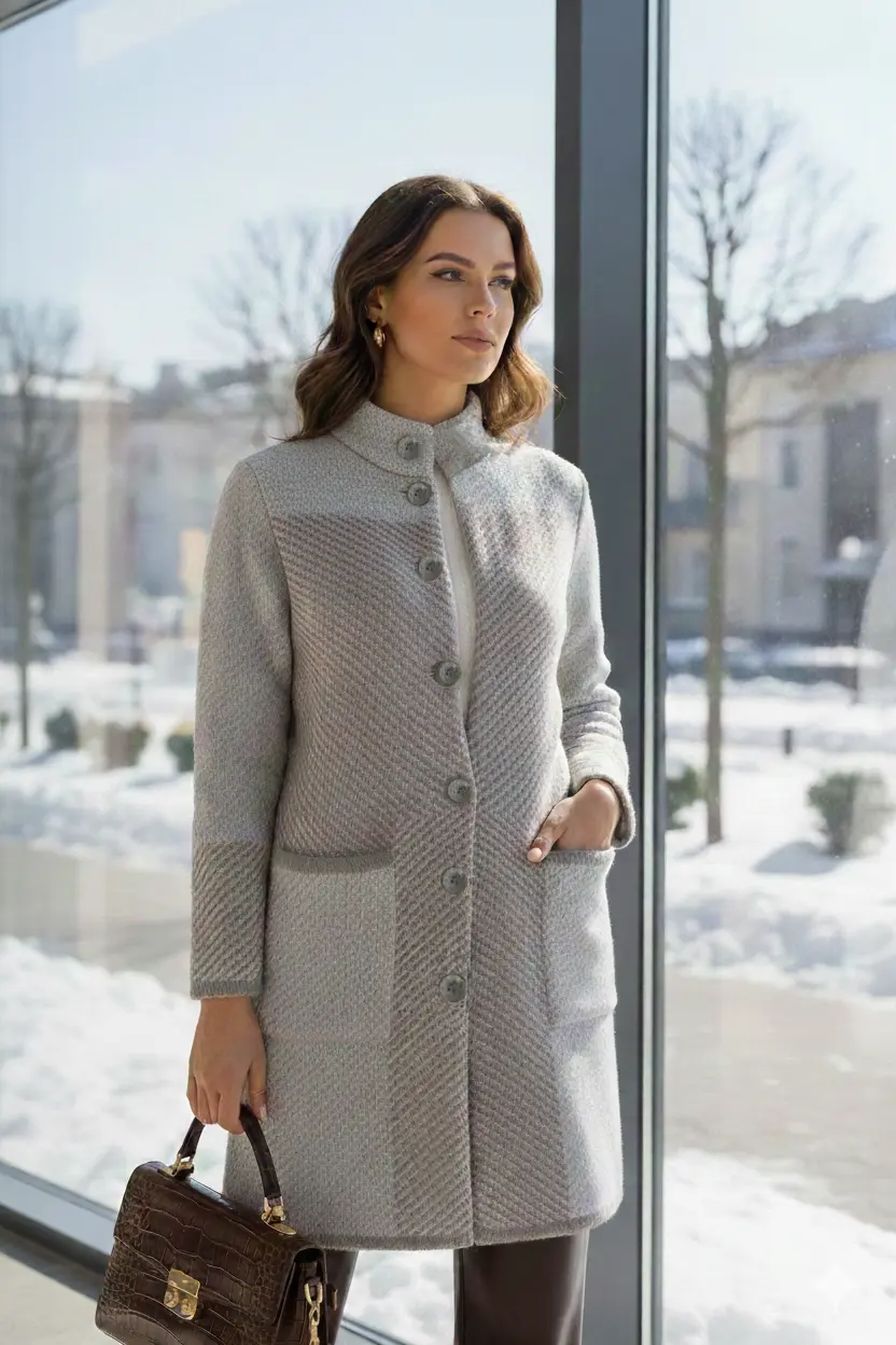 - Женский вязаный кардиган полуприлегающего силуэта с воротником-стойкой. Кардиган застегивается на пуговицы. Рукава втачные длинные. Накладные карманы прямоугольной формы. Кардиган выполнен жаккардовым переплетением.