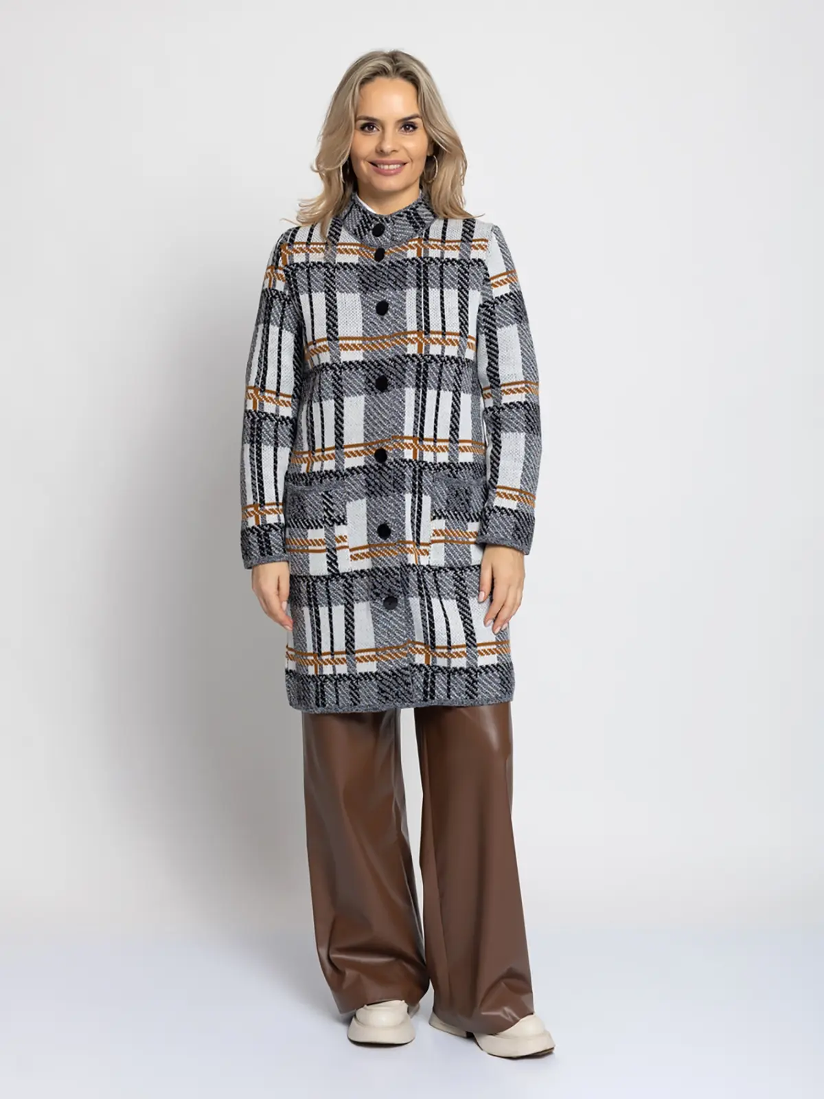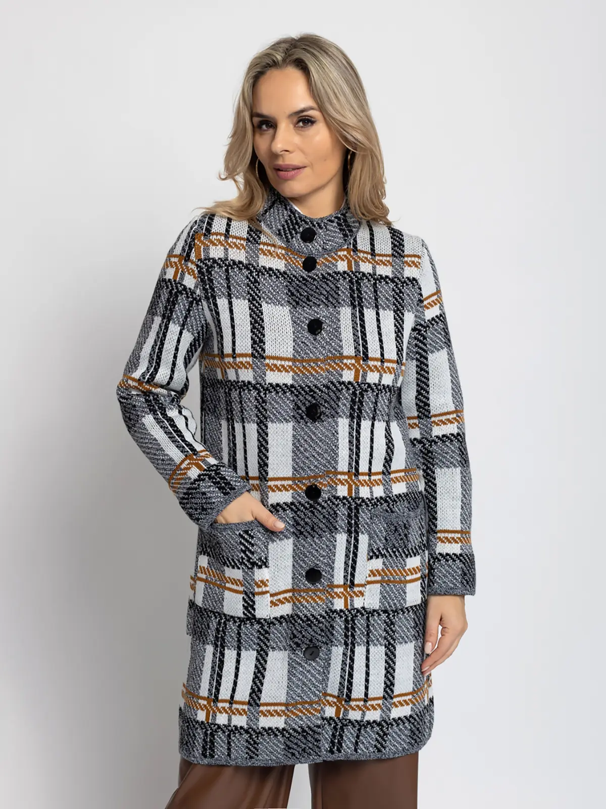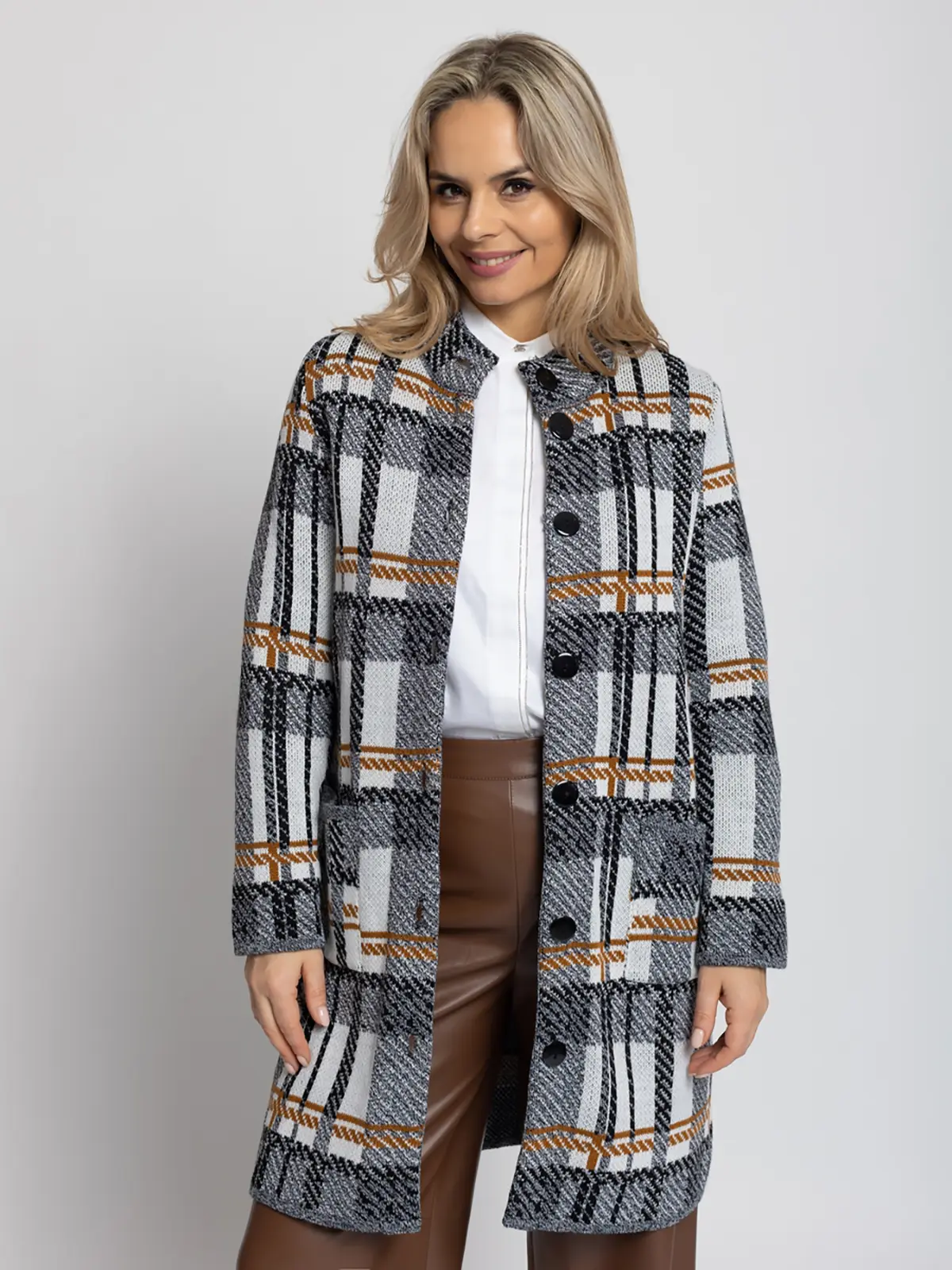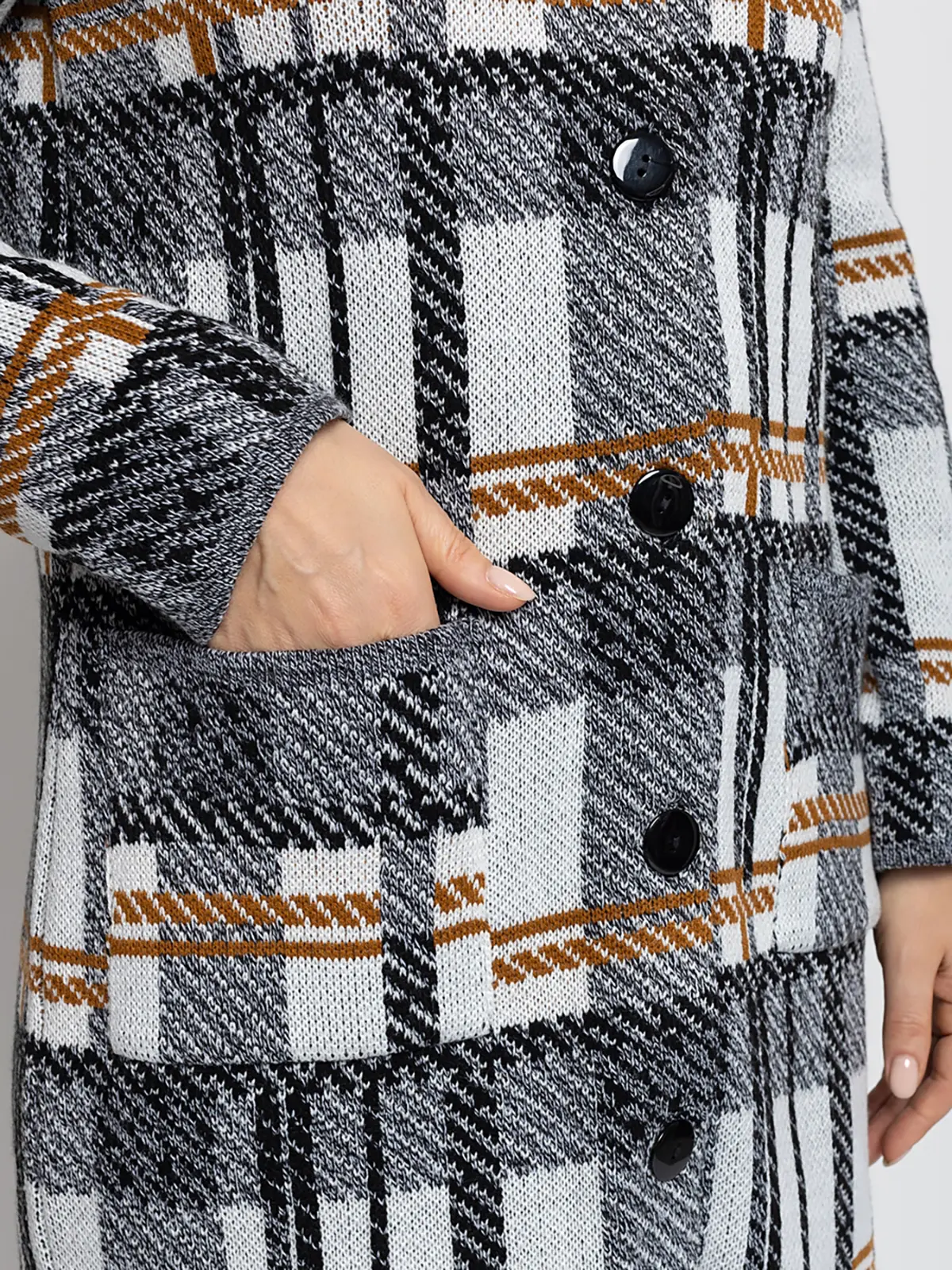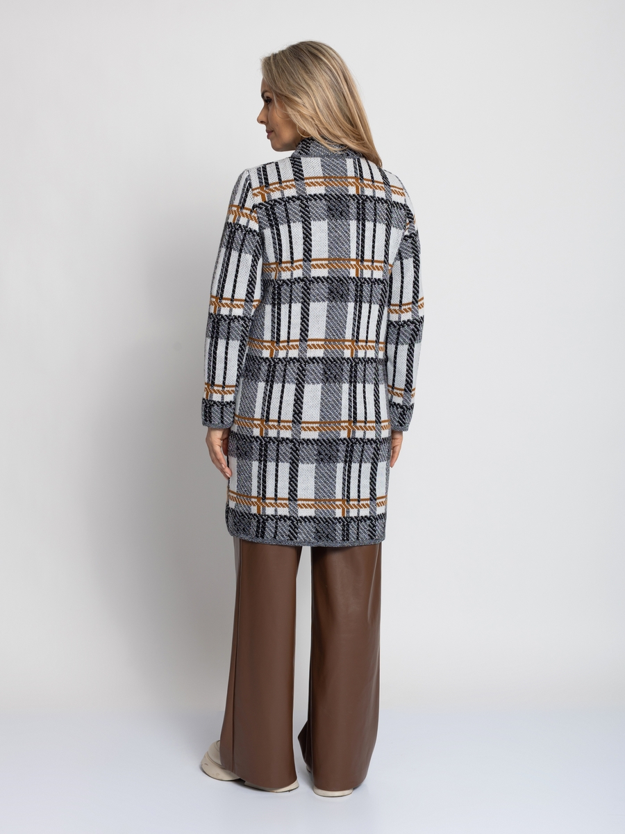 - Женский эффектный вязанный кардиган прямого силуэта. Воротник-стойка. Застегивается на пуговицы Рукава втачные длинные. Два накладных кармана. Кардиган выполнен жаккардовым переплетением образующим геометрический рисунок "клетка". Он согреет вас в прохладный день и подарит ощущение невероятного комфорта.