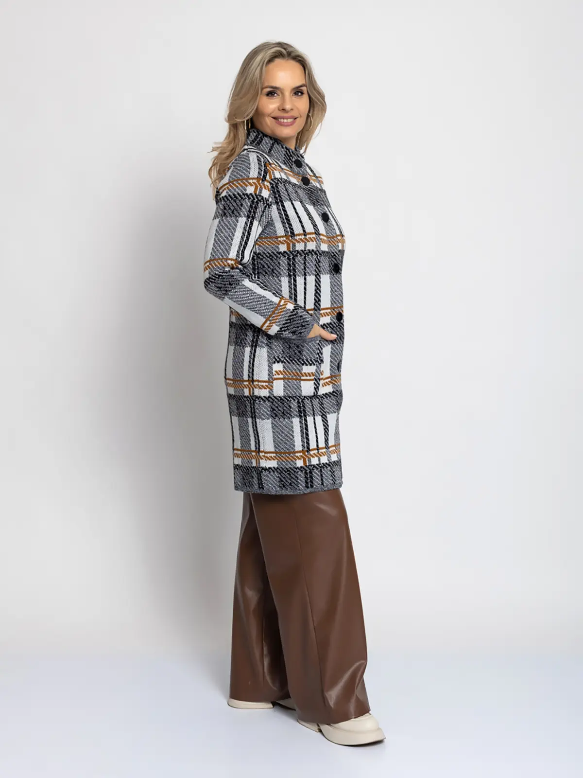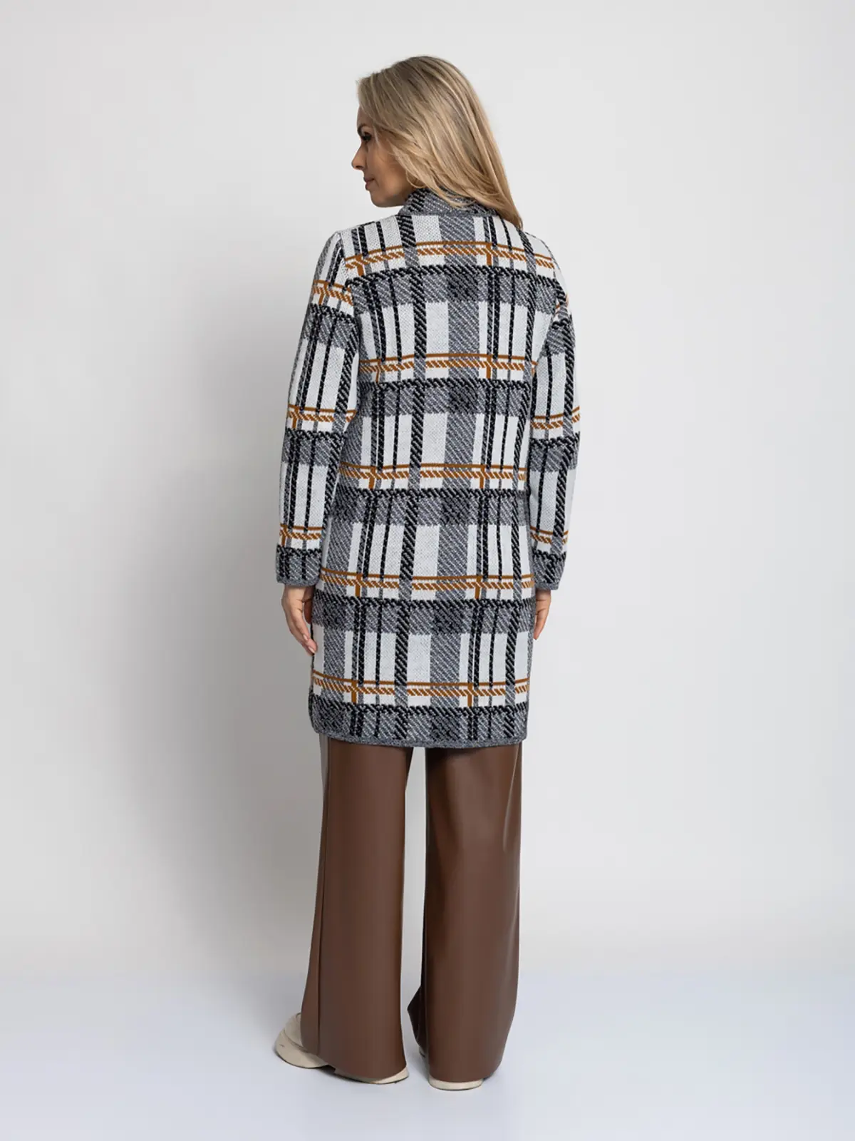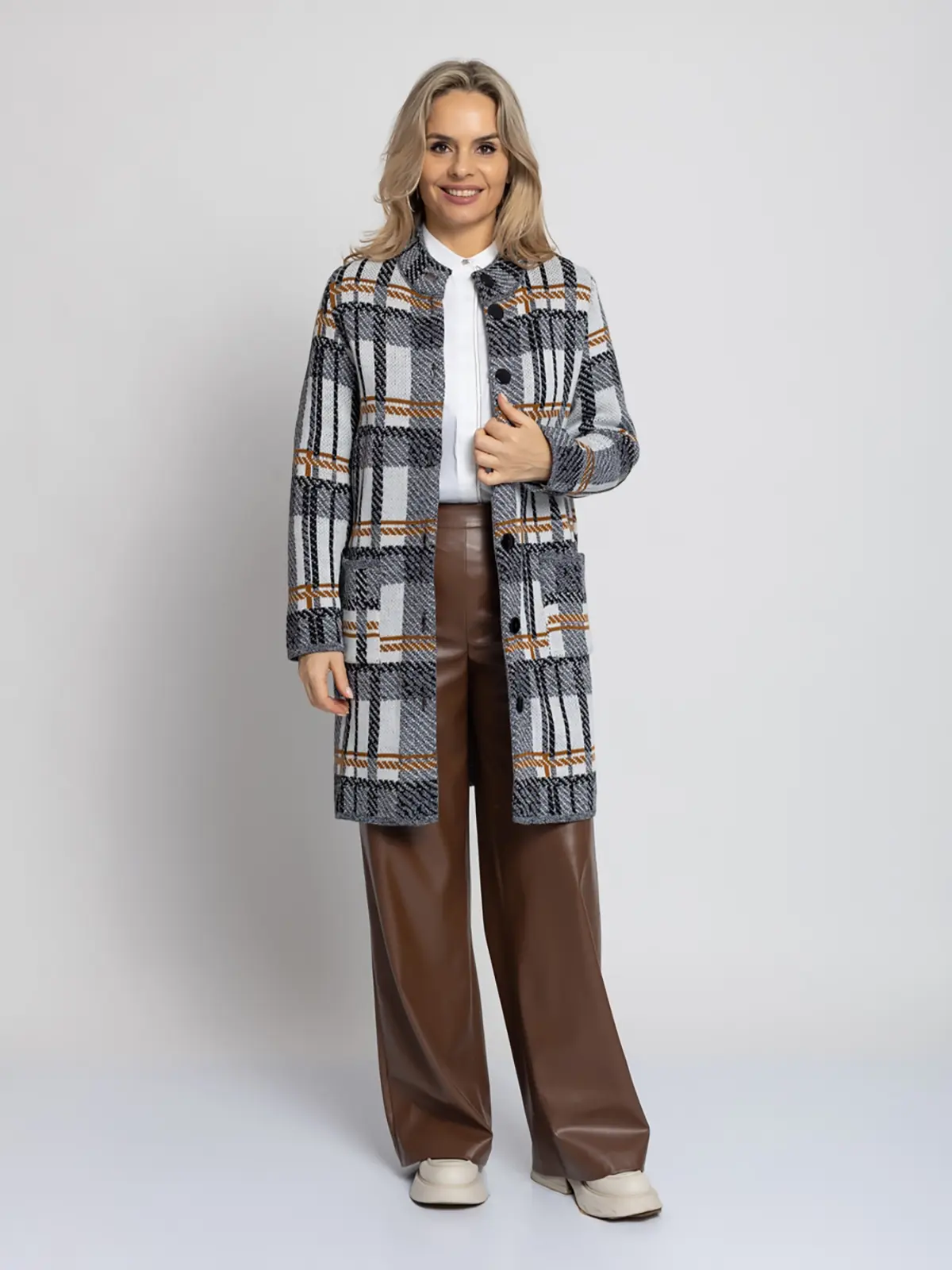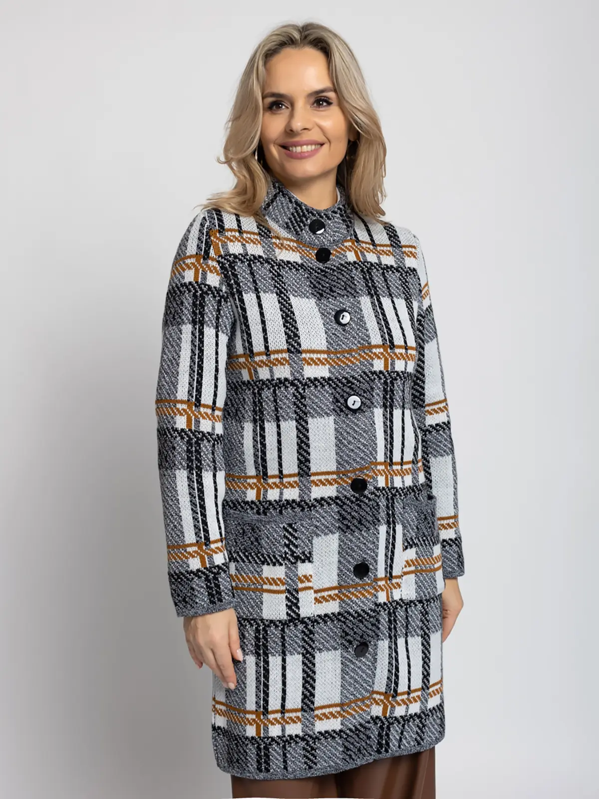 - Женский эффектный вязанный кардиган прямого силуэта. Воротник-стойка. Застегивается на пуговицы Рукава втачные длинные. Два накладных кармана. Кардиган выполнен жаккардовым переплетением образующим геометрический рисунок "клетка". Он согреет вас в прохладный день и подарит ощущение невероятного комфорта.