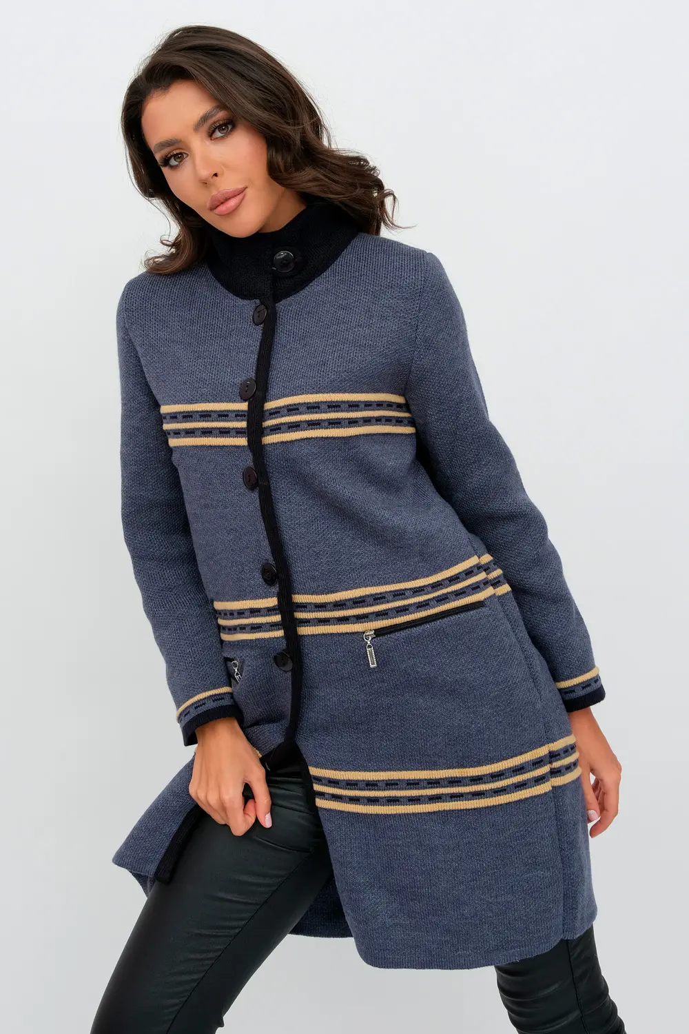 - Женский вязанный кардиган прямого силуэта. Воротник-стойка. Застегивается на пуговицы Рукава втачные длинные. Два прорезных кармана с молнией. Кардиган выполнен жаккардовым переплетением с горизонтальными контрастными полосами. Он согреет вас в прохладный день и подарит ощущение невероятного комфорта.