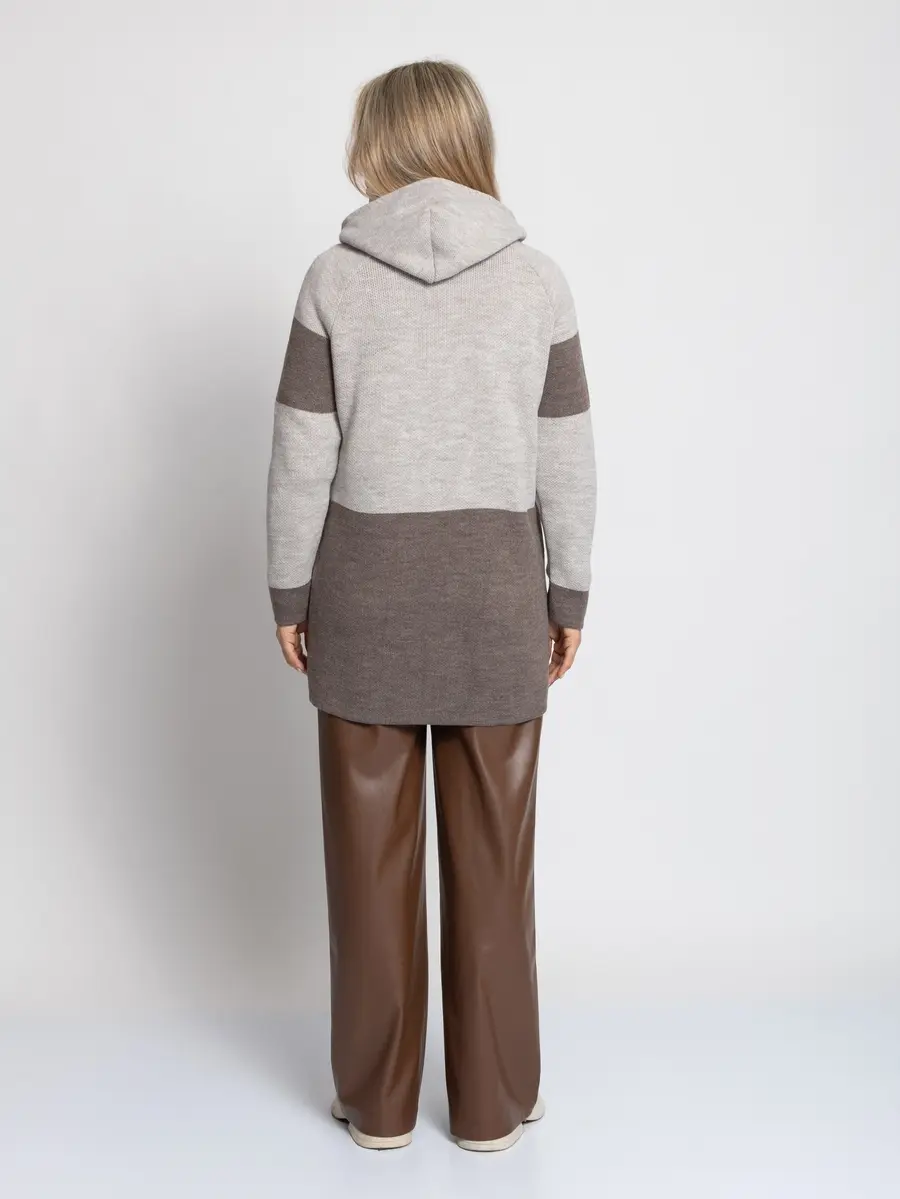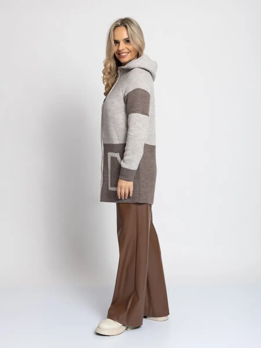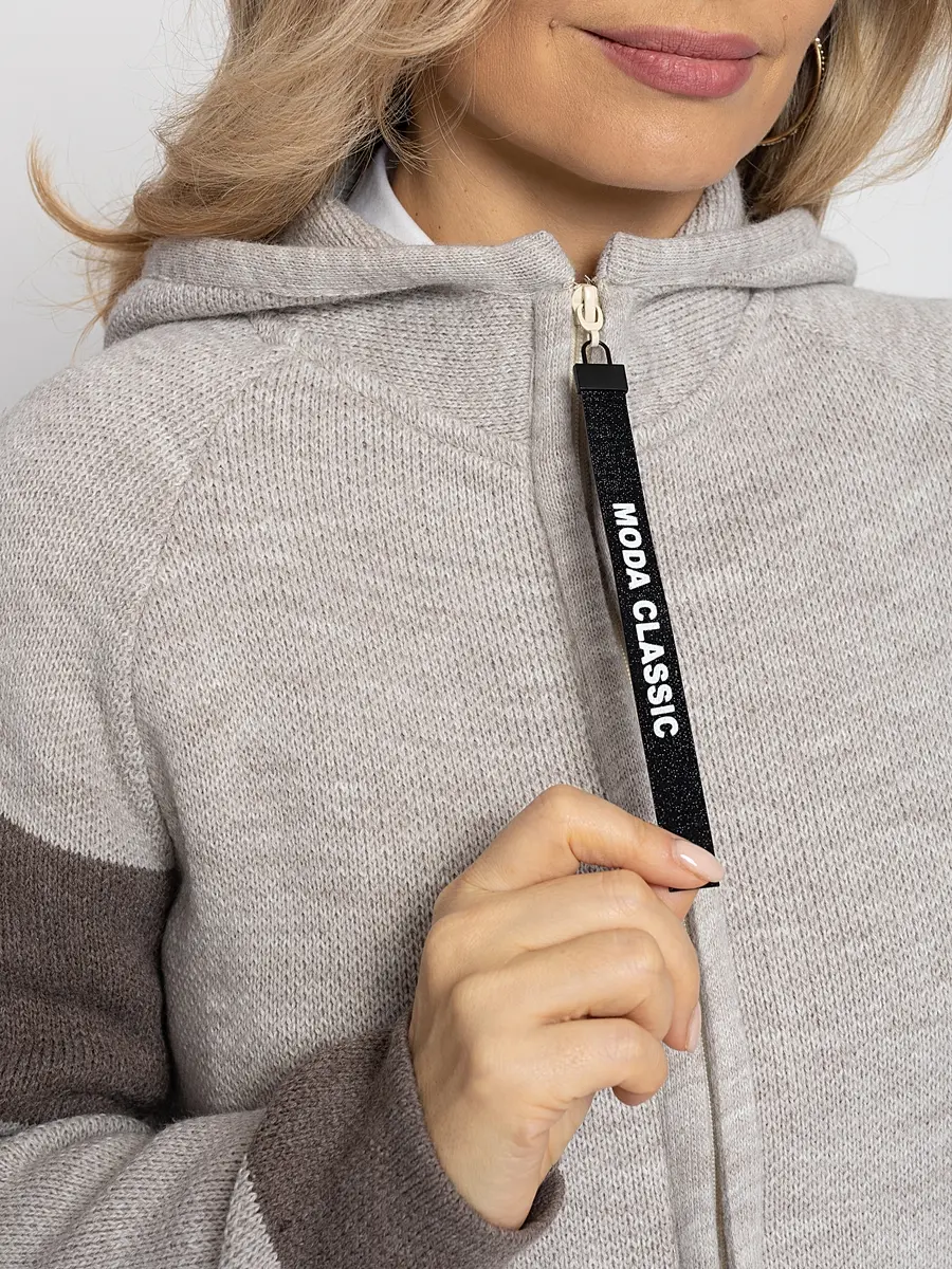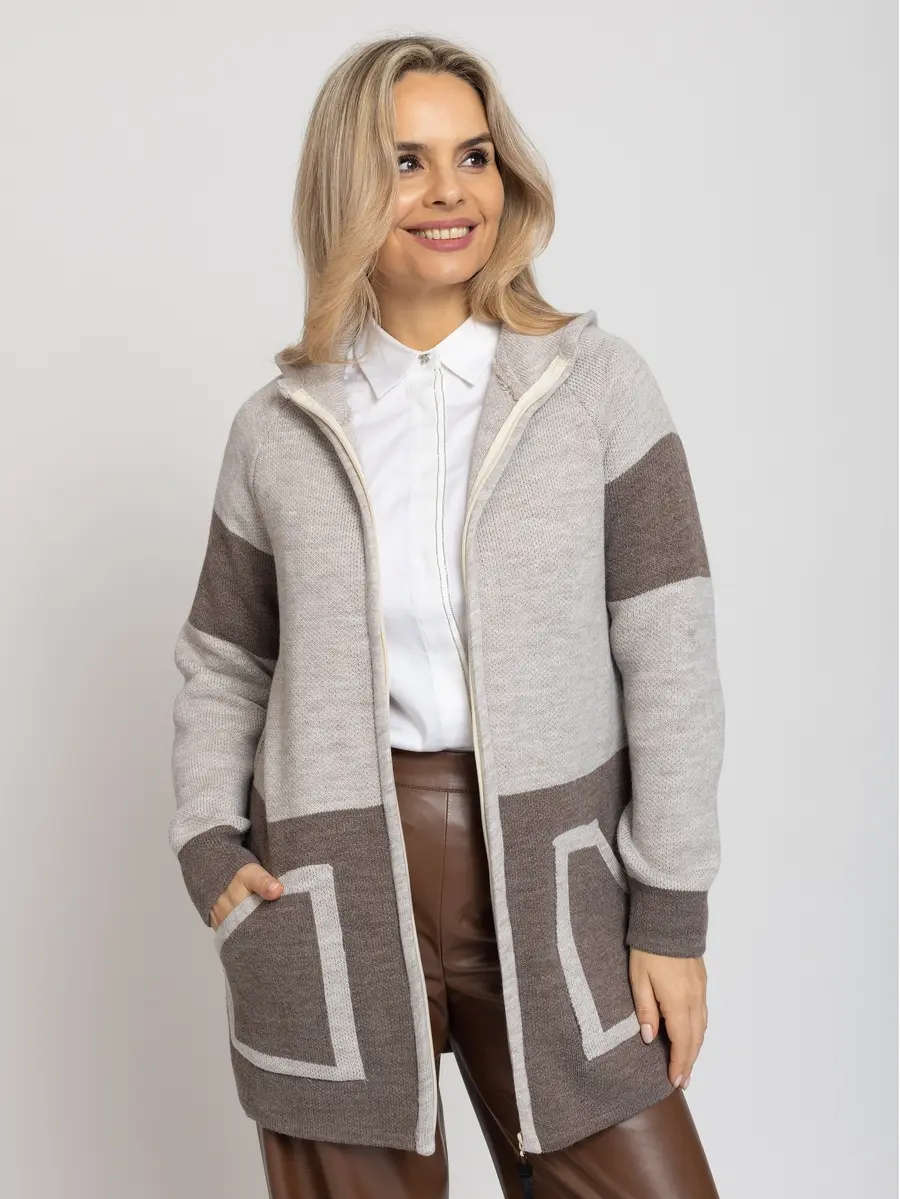 - Женский вязаный кардиган прямого силуэта в спортивном стиле, с капюшоном. Кардиган на молнии. Рукав-реглан полной длины. Накладные карманы. Контрастная отделка.