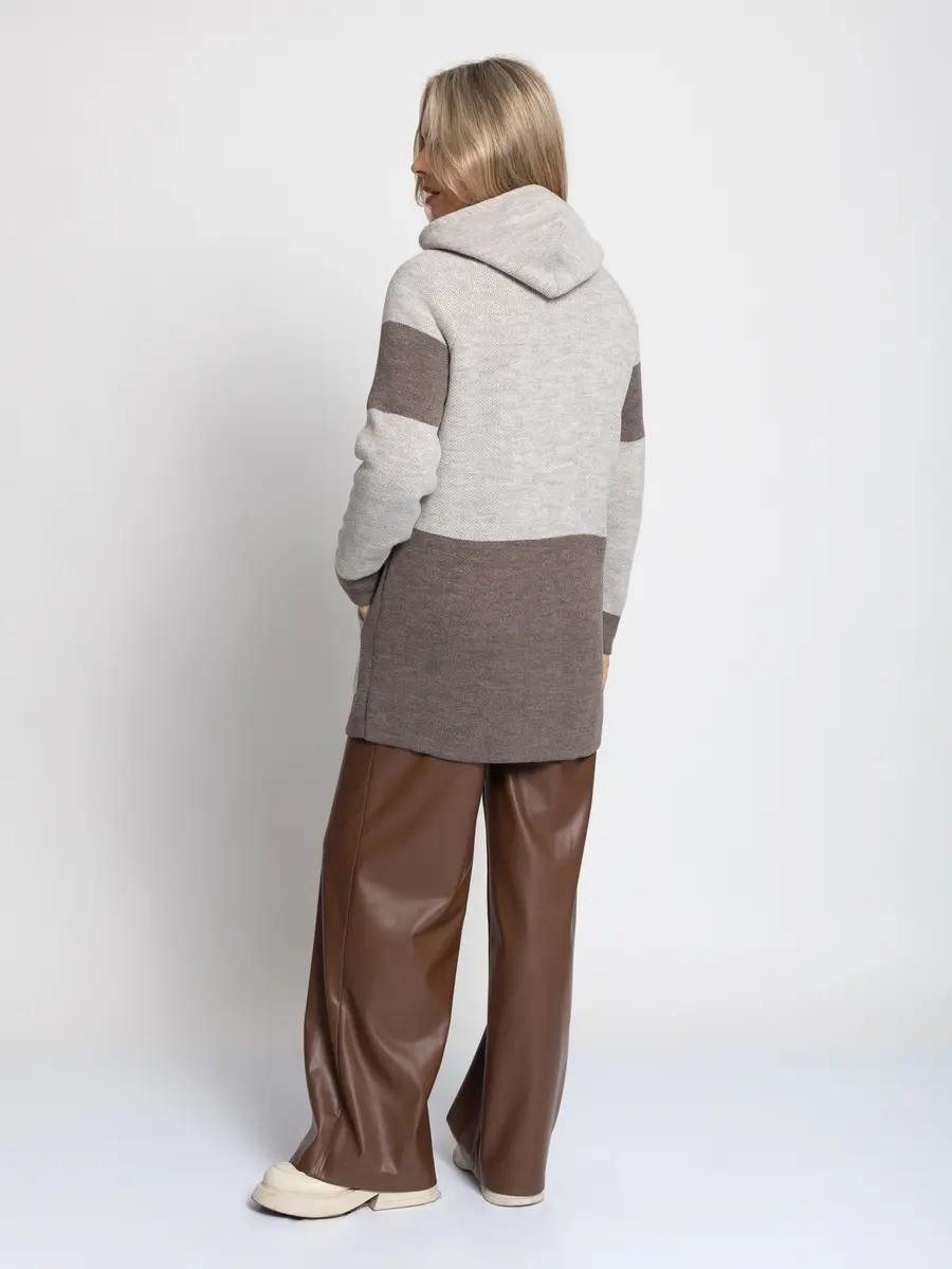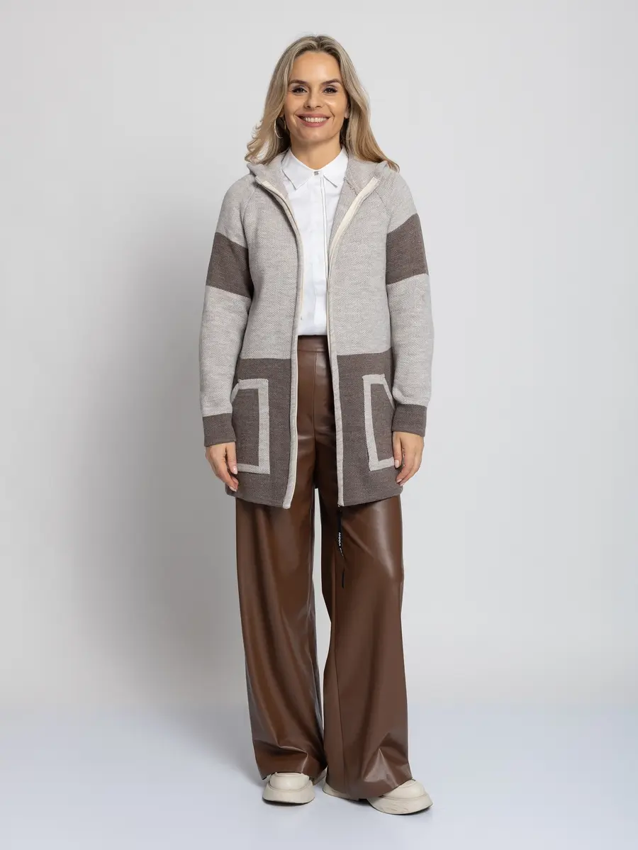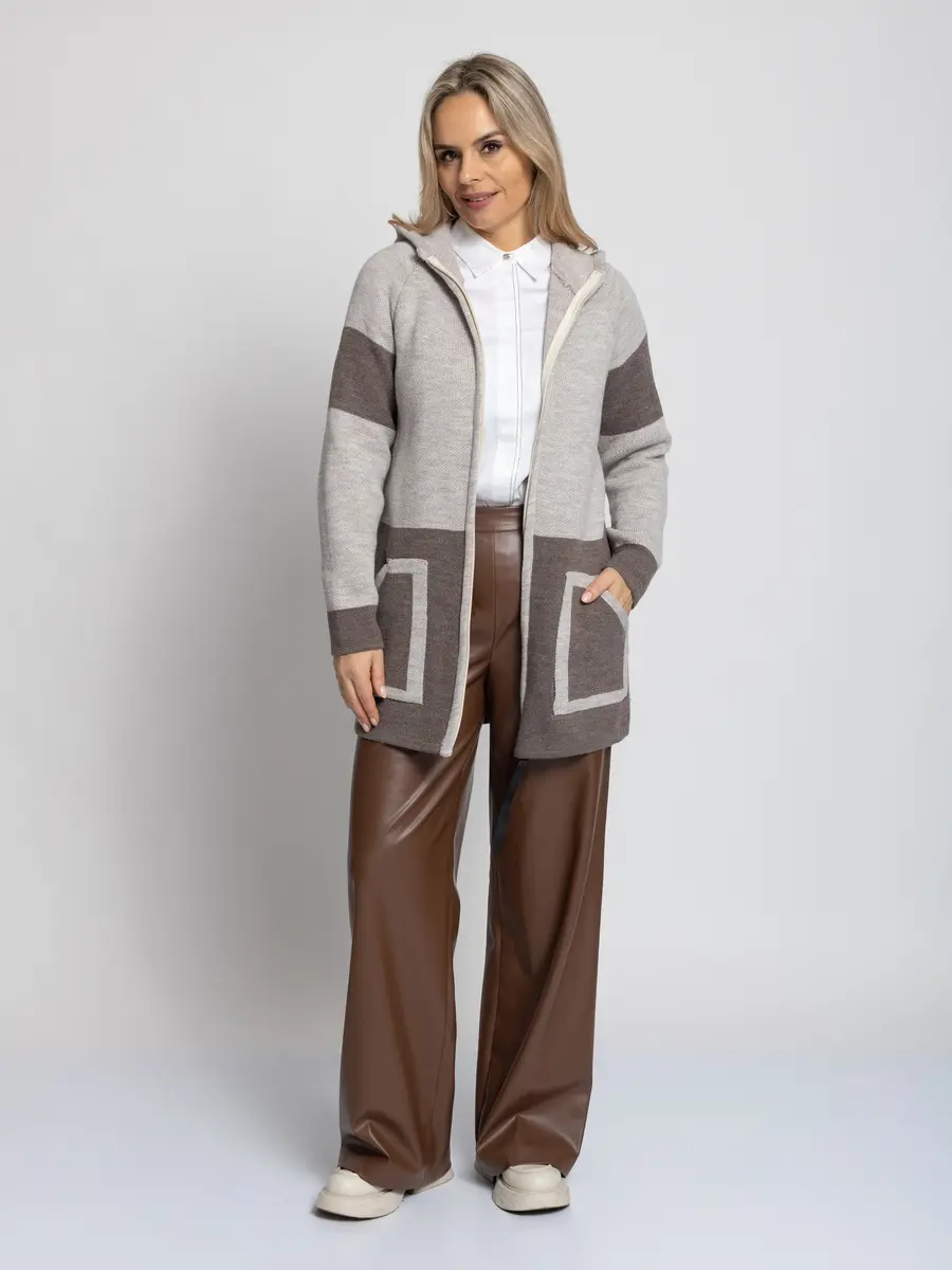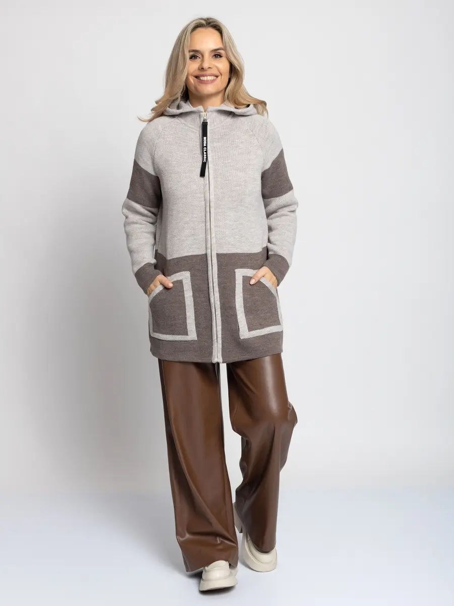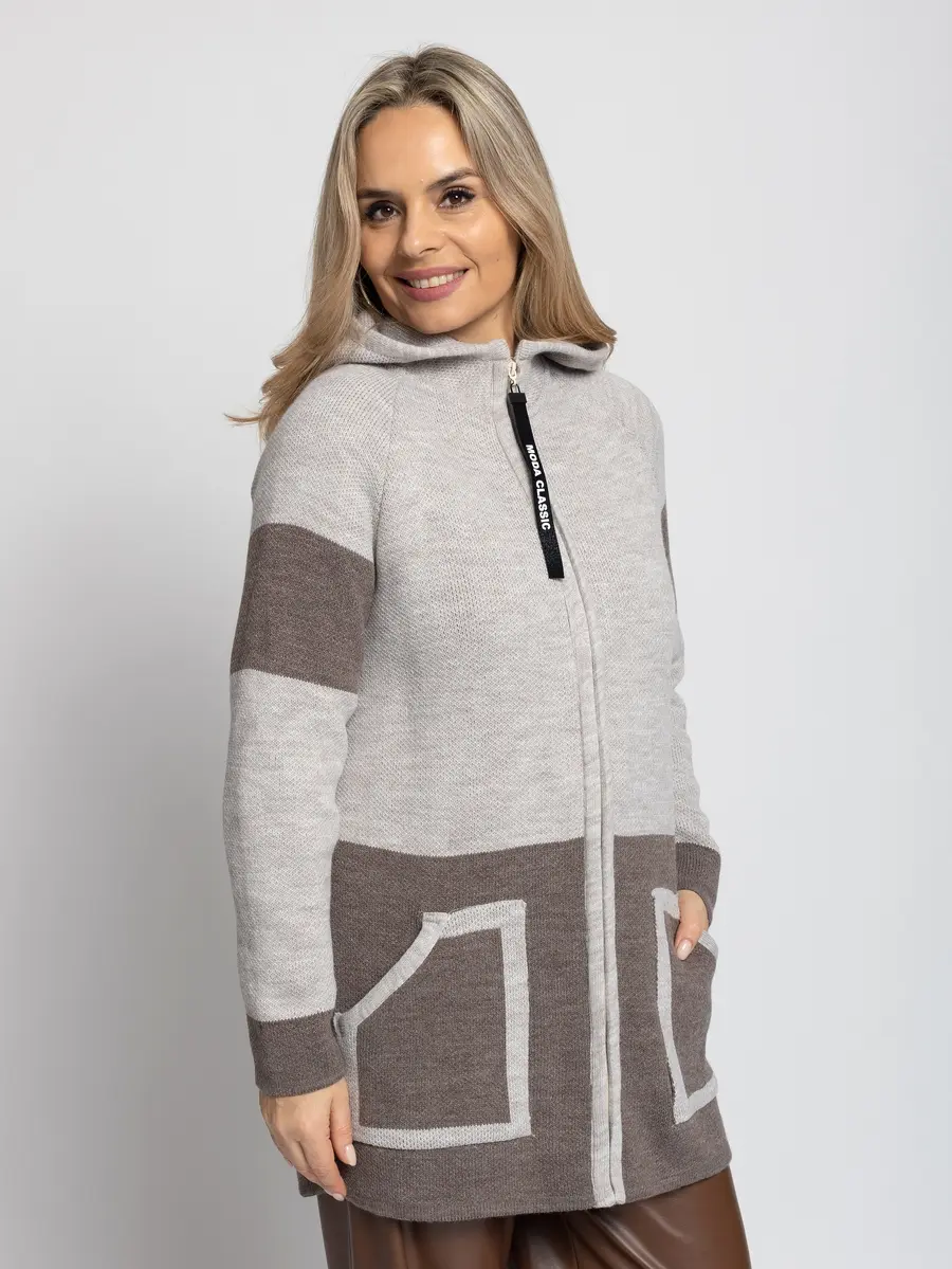 - Женский вязаный кардиган прямого силуэта в спортивном стиле, с капюшоном. Кардиган на молнии. Рукав-реглан полной длины. Накладные карманы. Контрастная отделка.