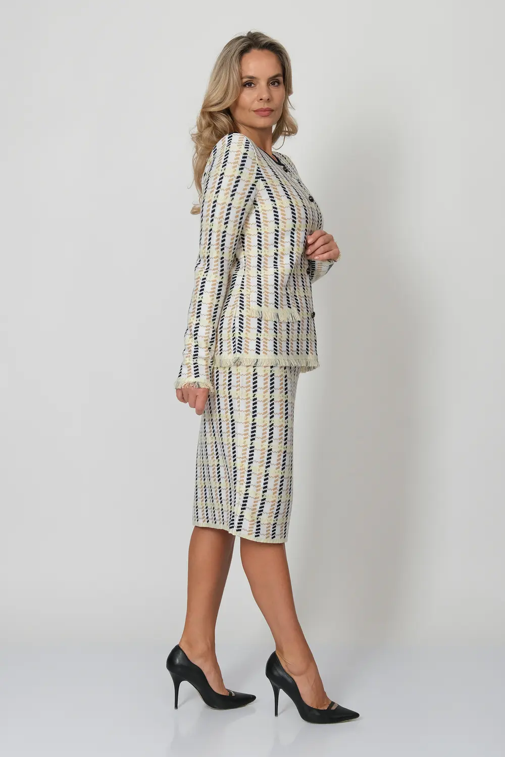 - Жакет полуприлегающего силуэта с длинным втачным рукавом рукавом. Застегивается на пуговицы. Горловина круглая. Бо бокам два прорезных кармана с клапаном. Жакет выполнен жаккардовым переплетением образуя клетку.