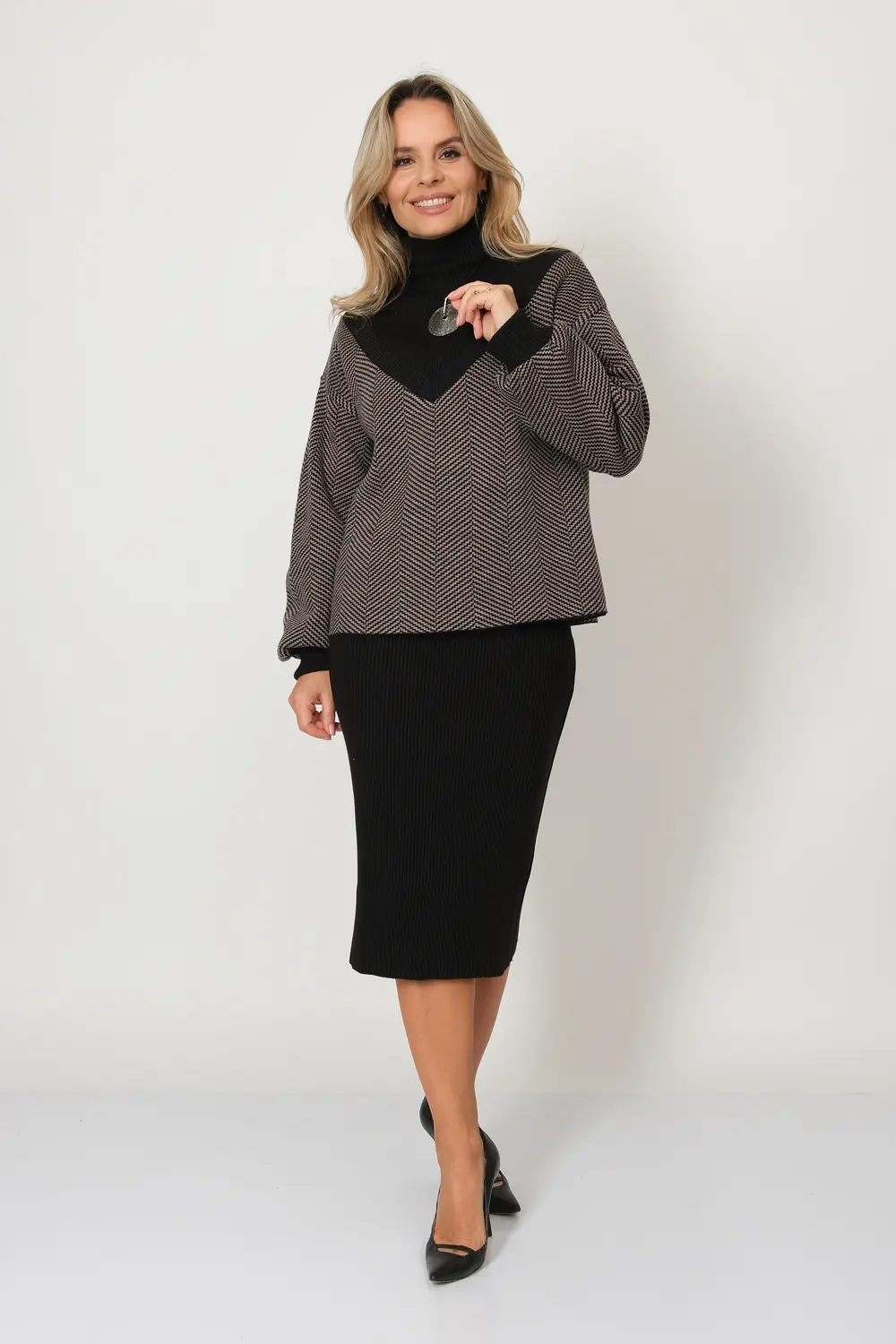 - Женский трикотажный костюм состоит из жакета и юбки. Жакет выполнен жаккардовым переплетением, образующим рисунок-ёлочку. К глубокому V-образному вырезу пришита манишка-стойка, вывязанная "лапшой". Объемные рукава со спущенным плечом, манжеты вывязаны переплетением-резинка. Длина джемпера 63см, юбки-75см.