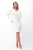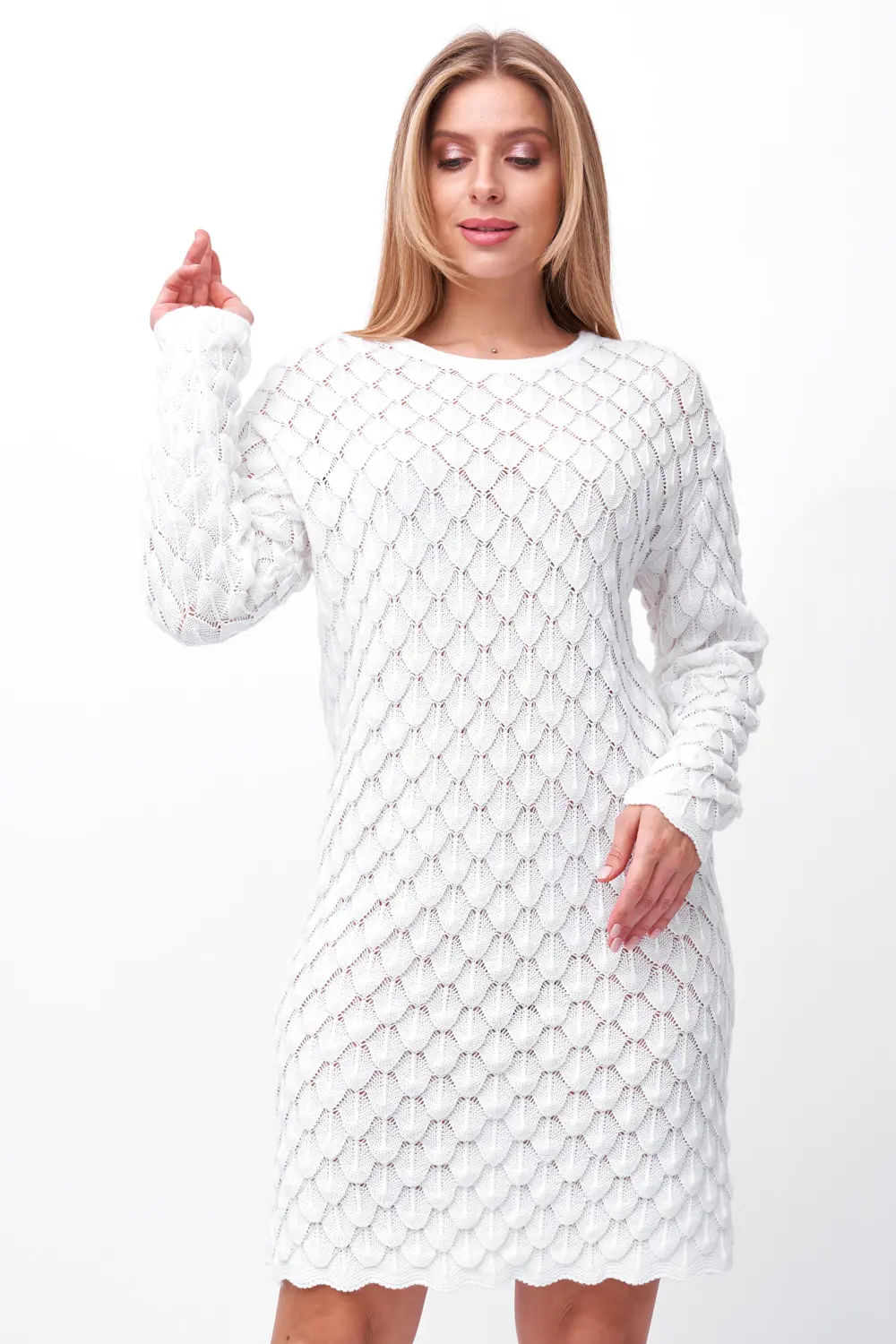 - Женское трикотажное платье полуприлегающего силуэта. Вырез горловины круглый, рукава втачные длинные. Платье выполнено ажурным переплетением.
