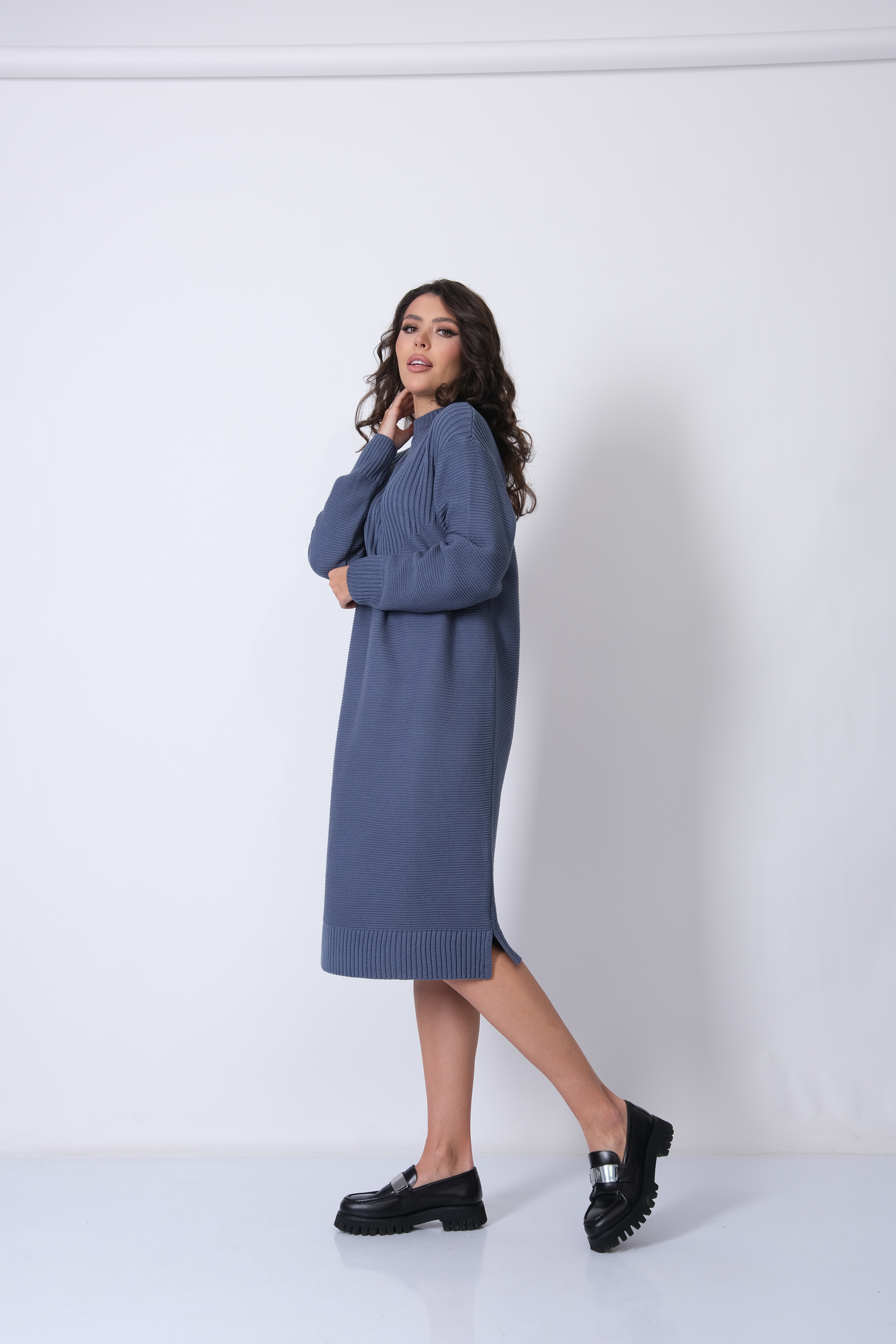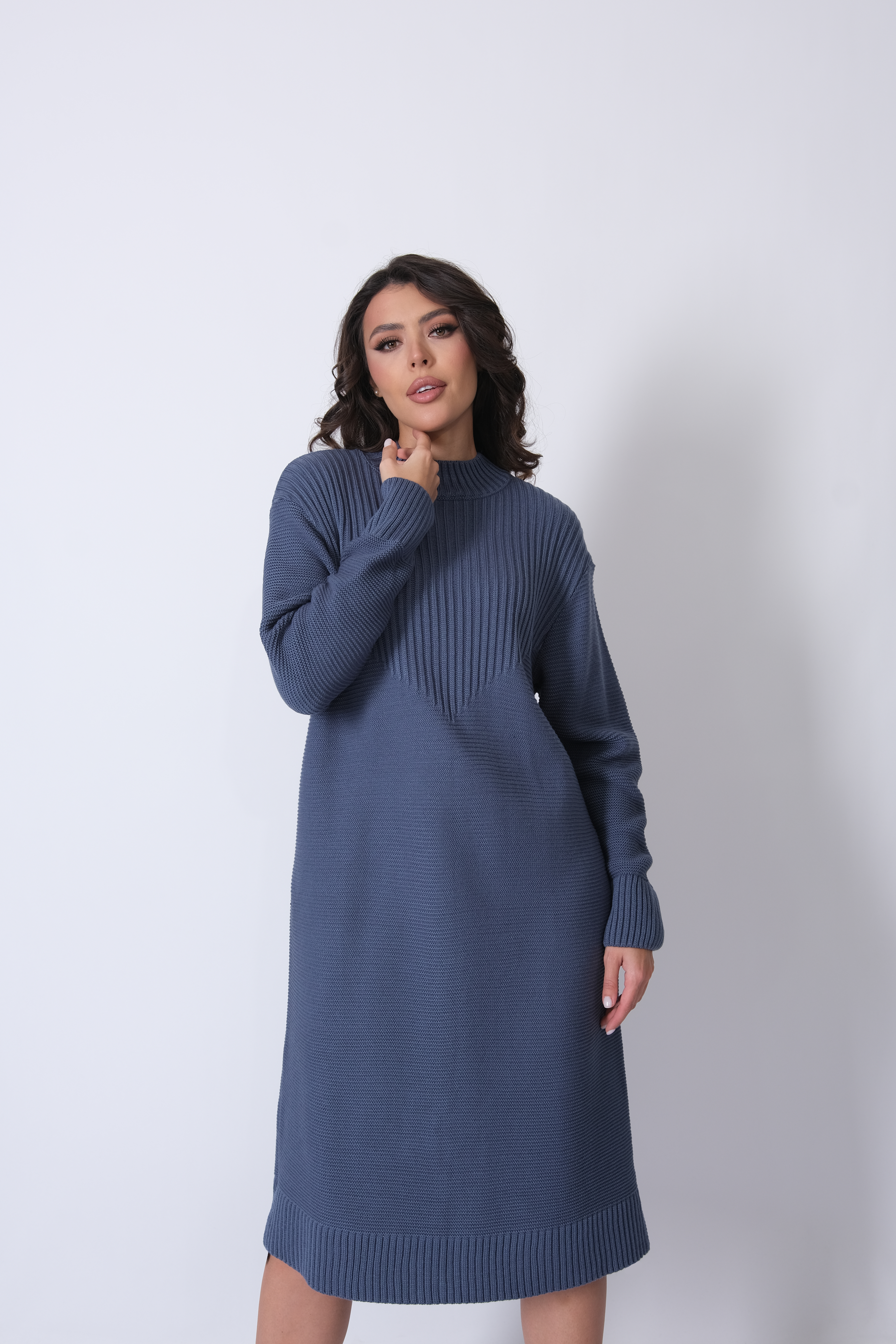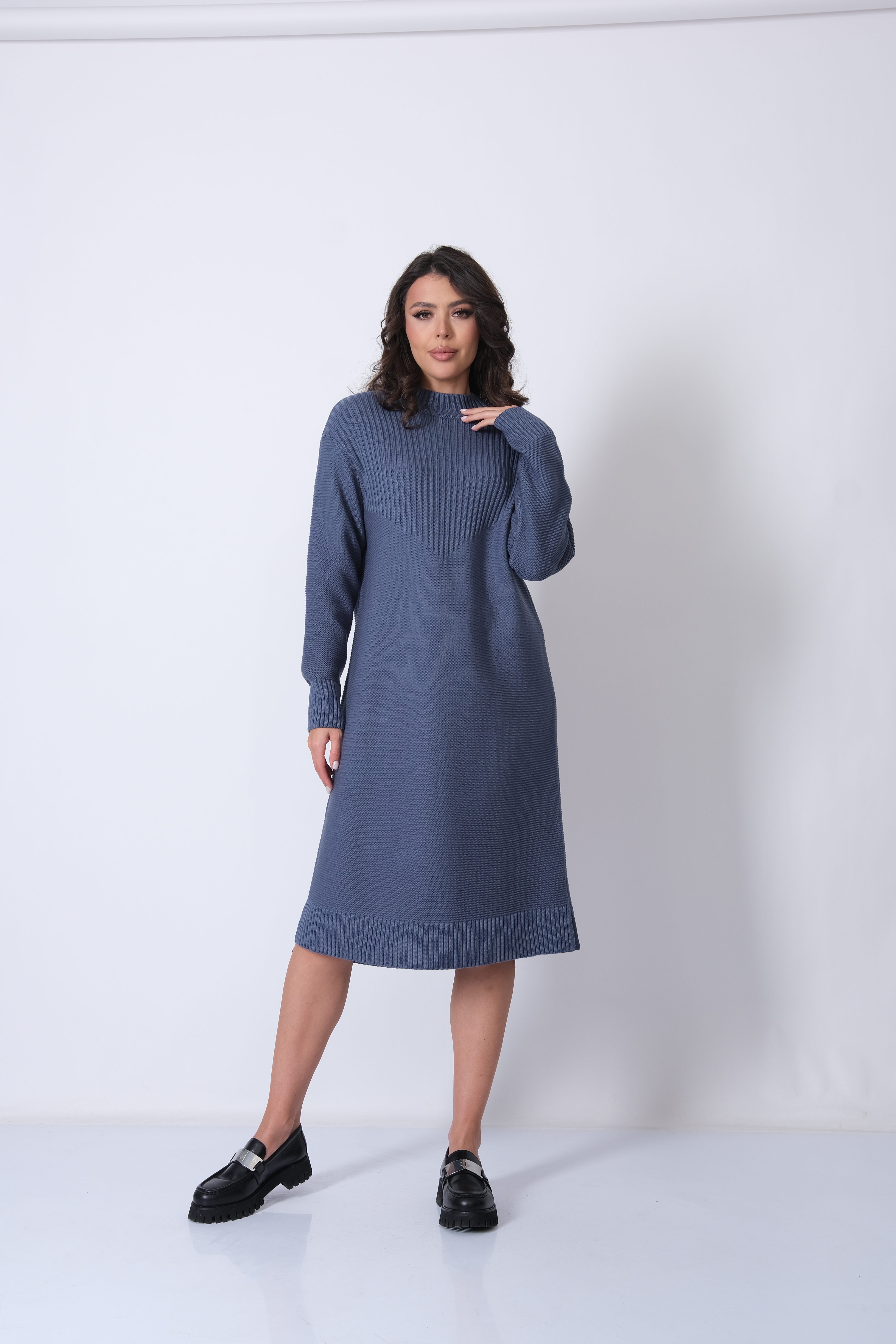 - Платье прямого силуэта из трикотажного вязанного полотна с воротником-стойка, спущенным плечом и рукавом полной длины. Кокетка спинки и полочки выполнено переплетением образующим рельефный вертикальный рисунок.