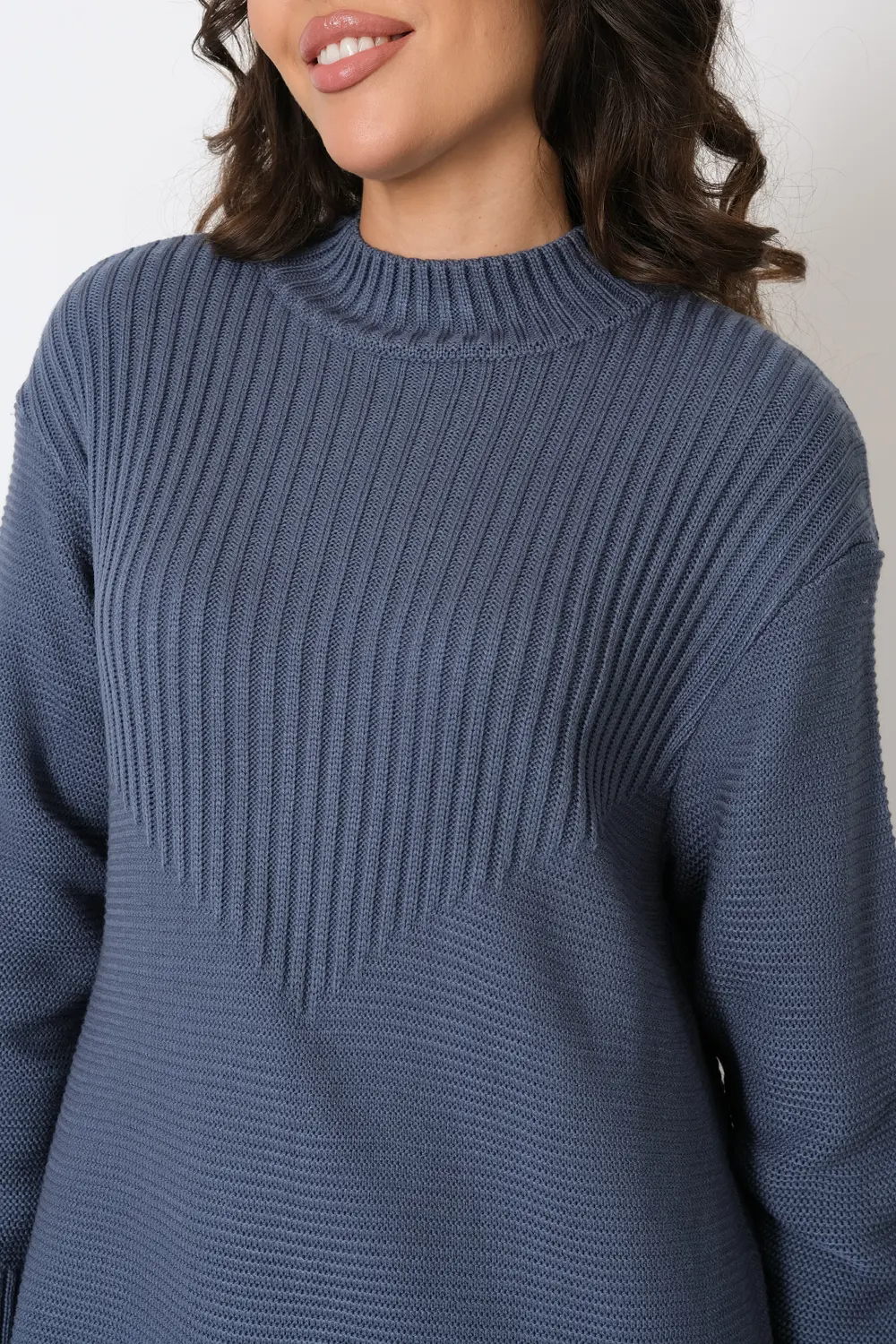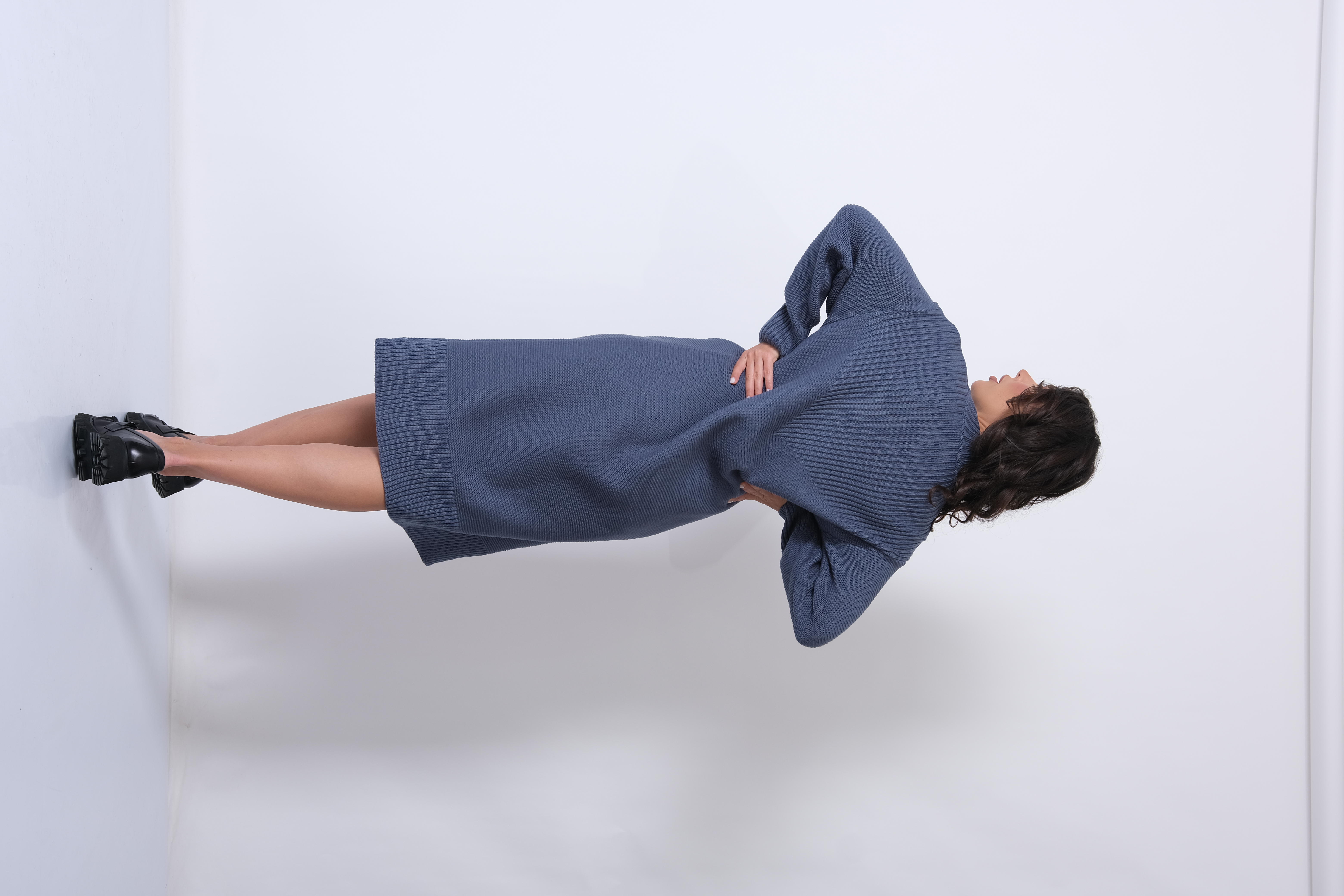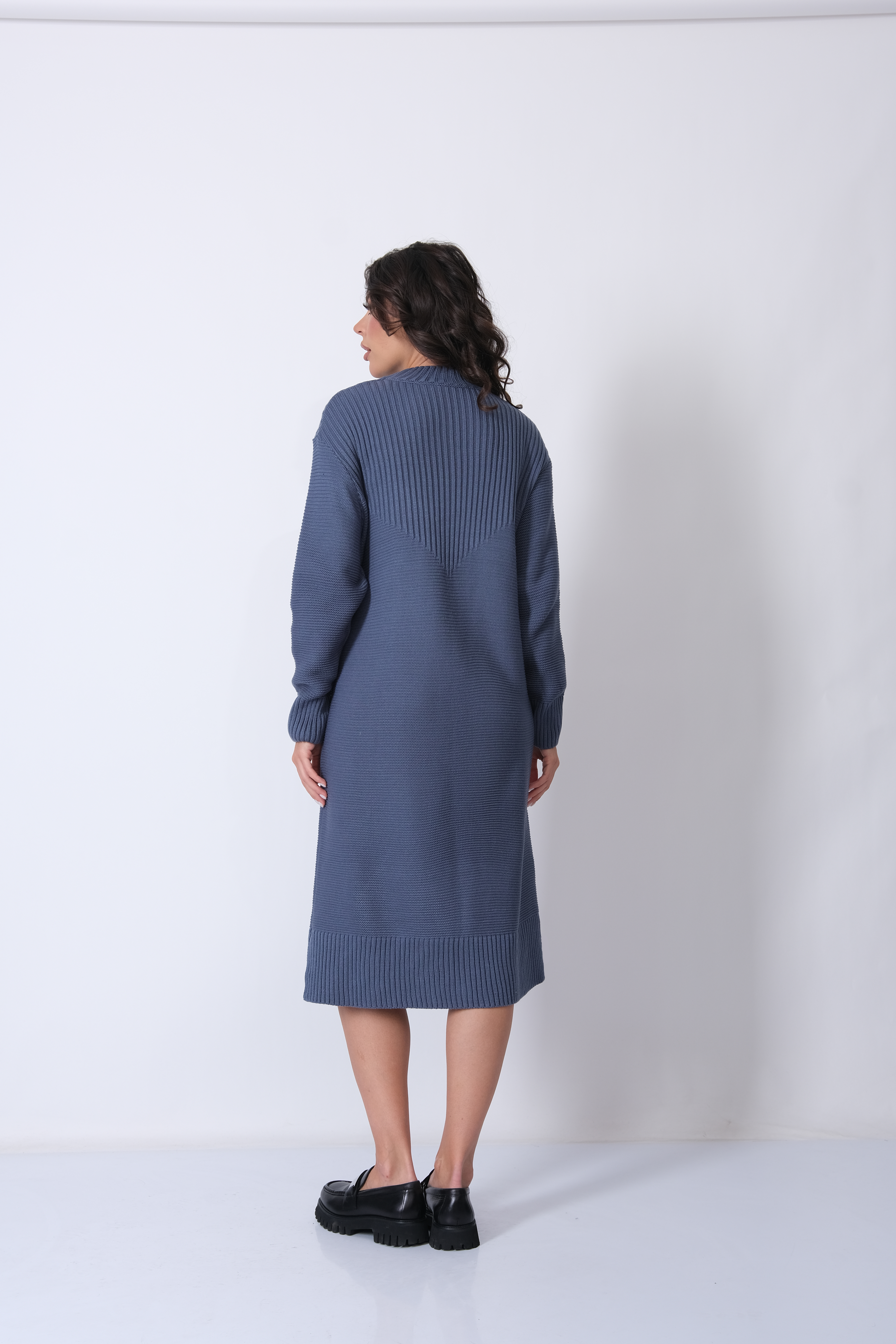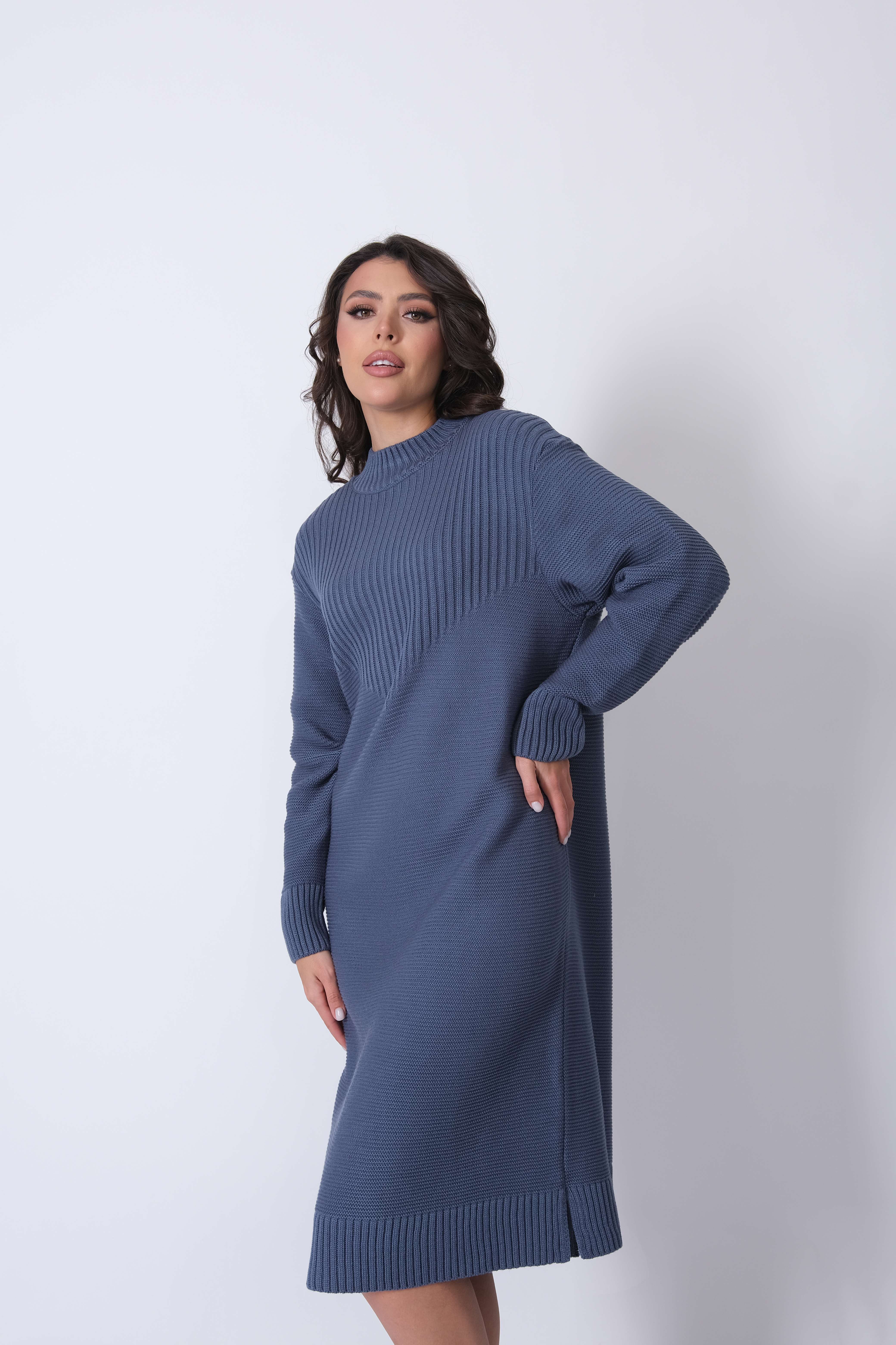 - Платье прямого силуэта из трикотажного вязанного полотна с воротником-стойка, спущенным плечом и рукавом полной длины. Кокетка спинки и полочки выполнено переплетением образующим рельефный вертикальный рисунок.