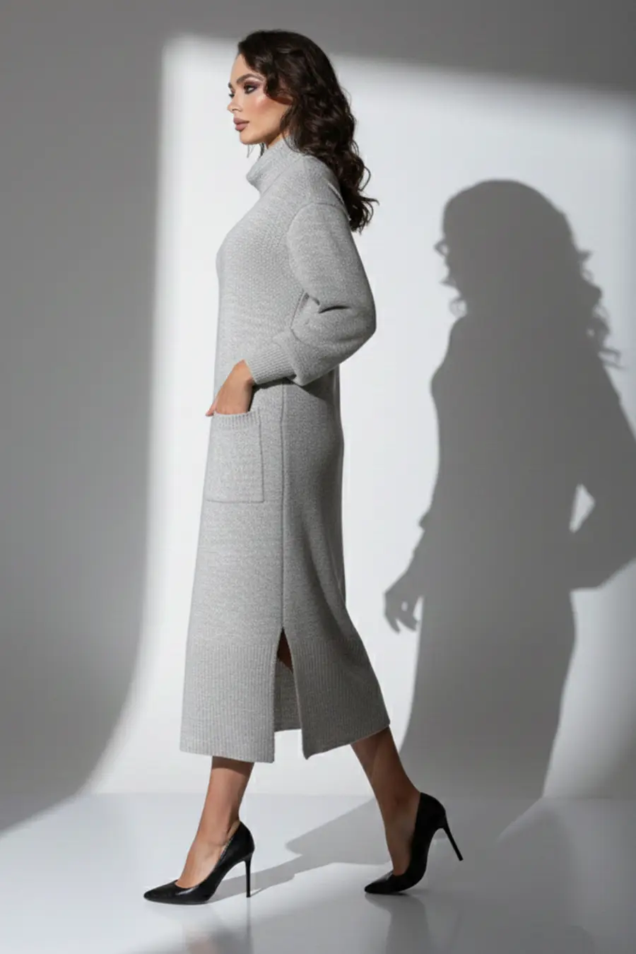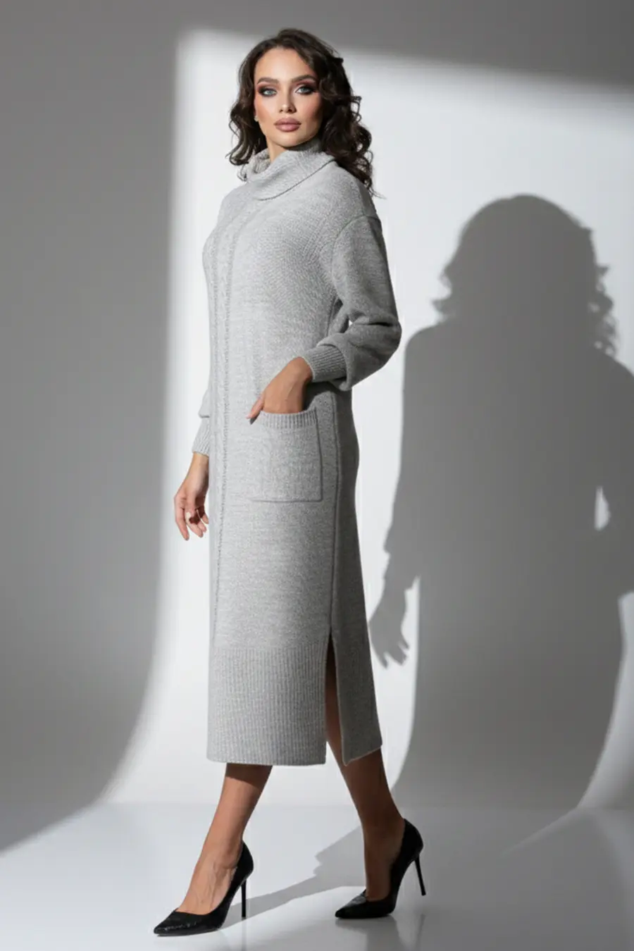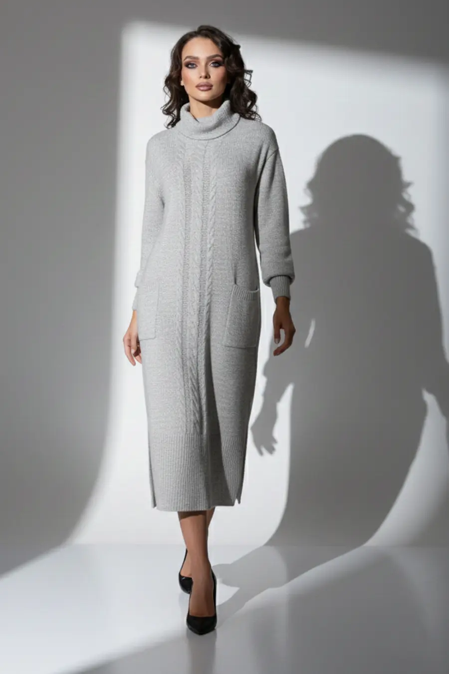 - Трикотажное, однотонное платье-свитер прямого силуэта с отложным воротником-стойка. Длинные рукава с приспущенным плечом. Внизу платья небольшие разрезы по бокам. Вертикальный узором в виде кос визуально вытянет Ваш силуэт. Материал с добавлением шерсти согреет в холодные дни. Длина миди – классика, которая будет актуальна всегда. Горло эластичное, не будет давить и мешаться, при этом будет согревать и заменит шарф. Воротник мягкий, при необходимости можно моделировать и делать отворот. . Если вы любите удобные, теплые наряды на каждый день, то эта модель для Вас.
