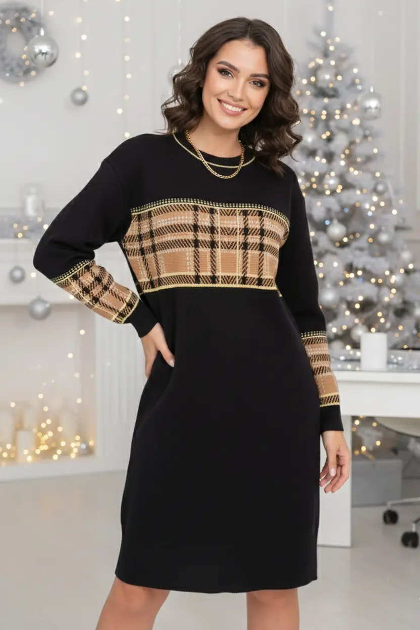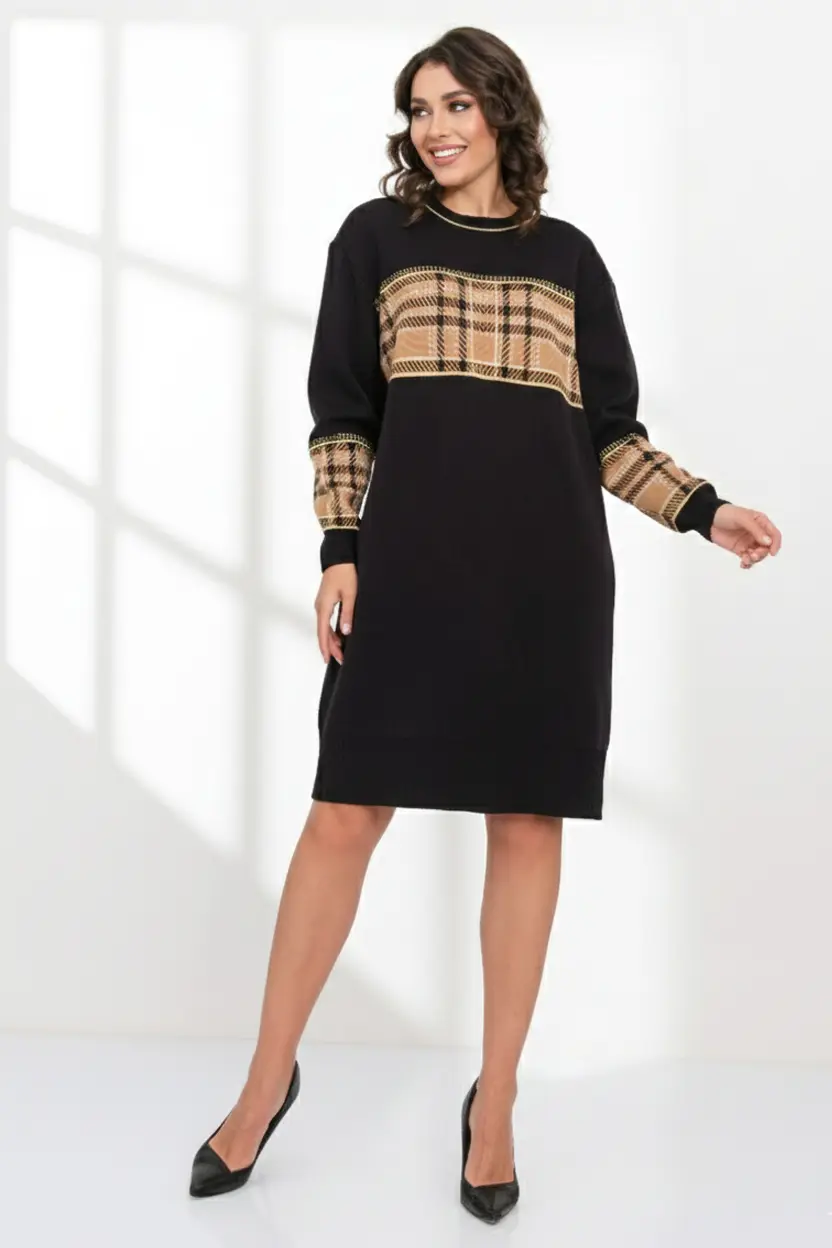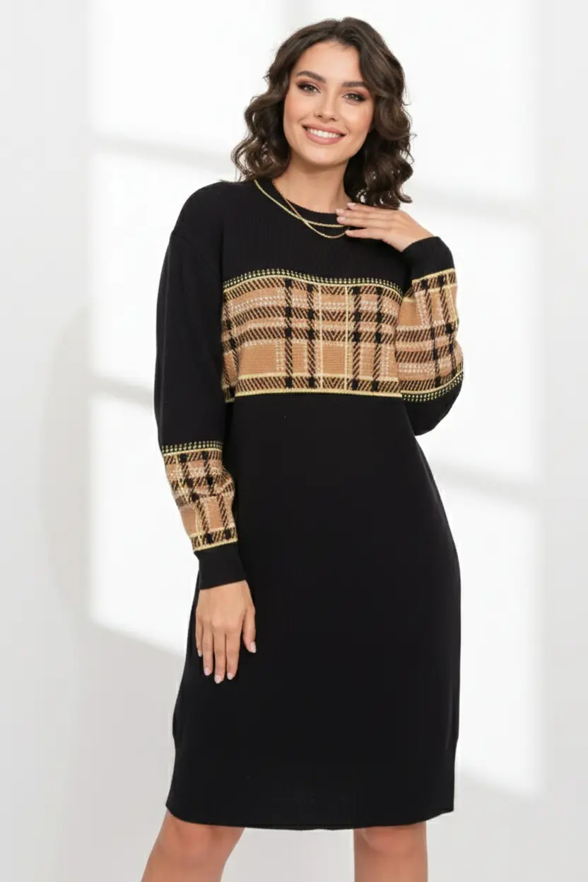 - Вязаное платье женское прямого силуэта. Рукава втачные длинные. Горловина круглая, обработана бейкой. Оригинальное сочетание однотонного полотна с жаккардовым контрастным рисунком "клетка" Платье, выполненое из высококачественной пряжи с хлопком, согреет Вас в прохладное время года