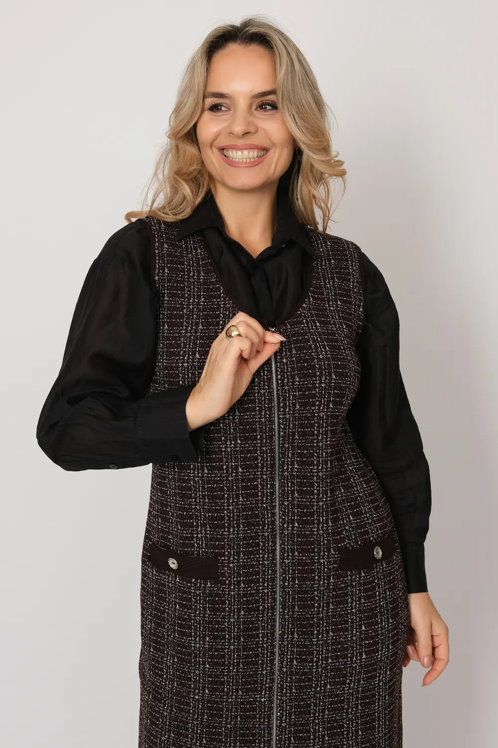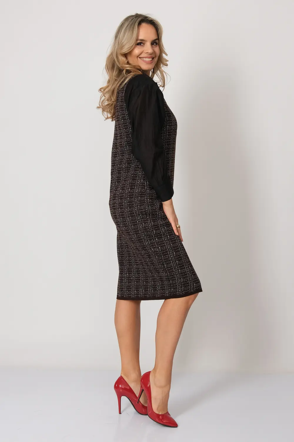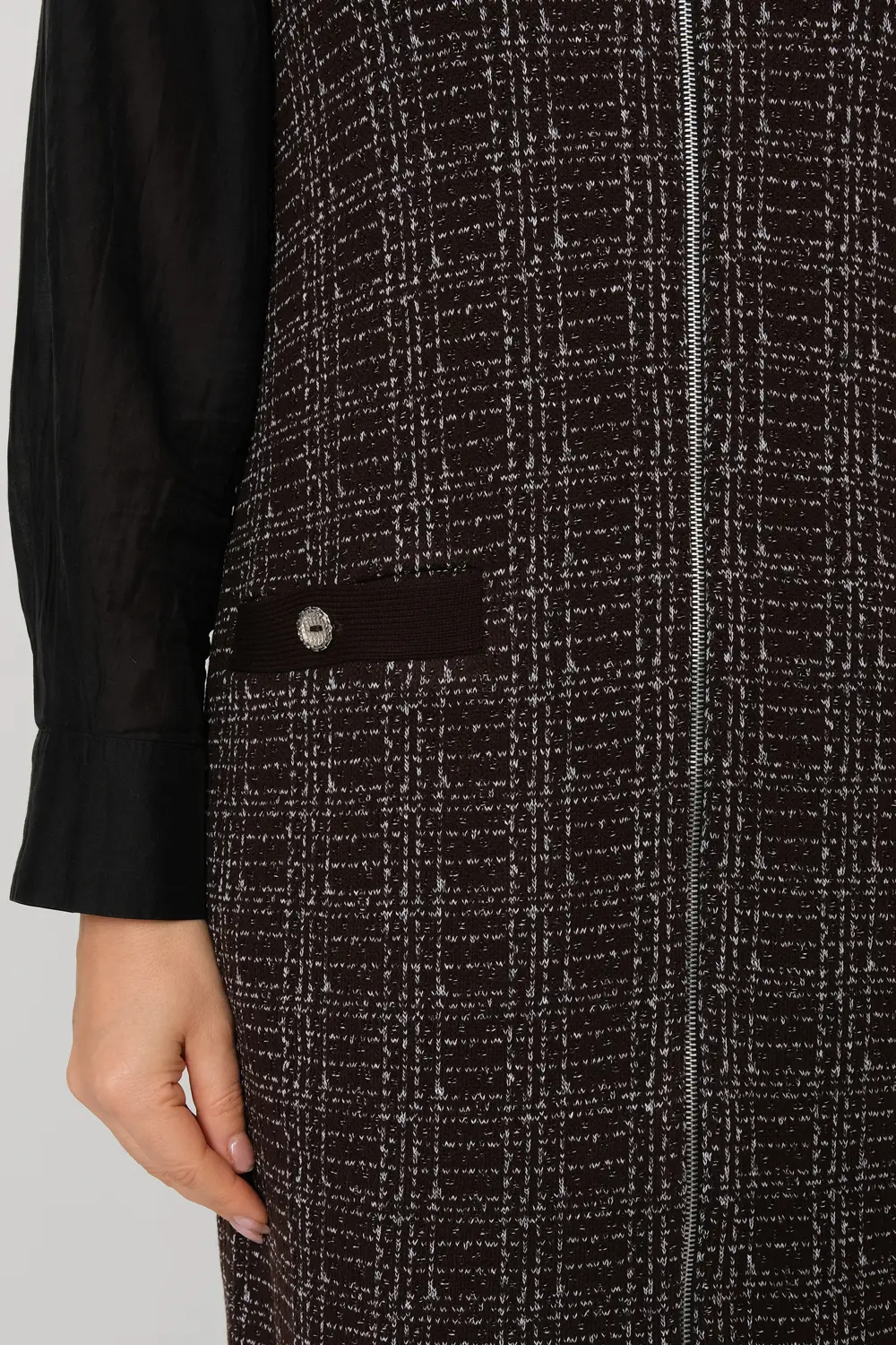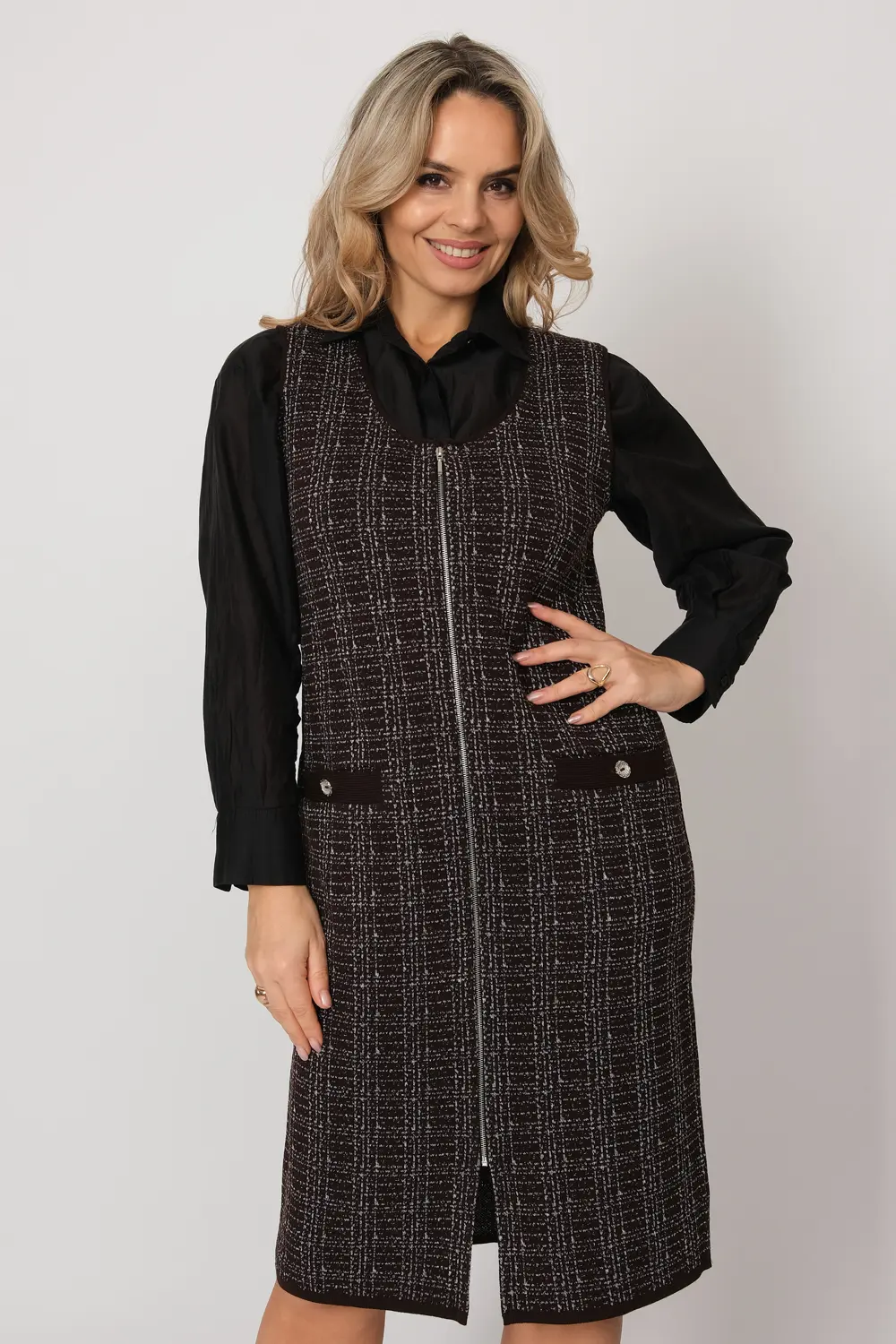 - Вязаное женское платье-сарафан полуприлегающего силуэта. Застежка - молния. Выполнено жаккардовым структурным переплетением рисунок клетка. Платье-сарафан для офисного, повседневного и делового стиля, будет отлично сочетаться с водолазками, рубашками, блузками, джемперами или футболками.