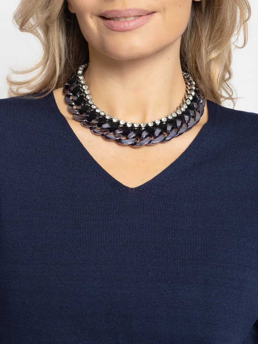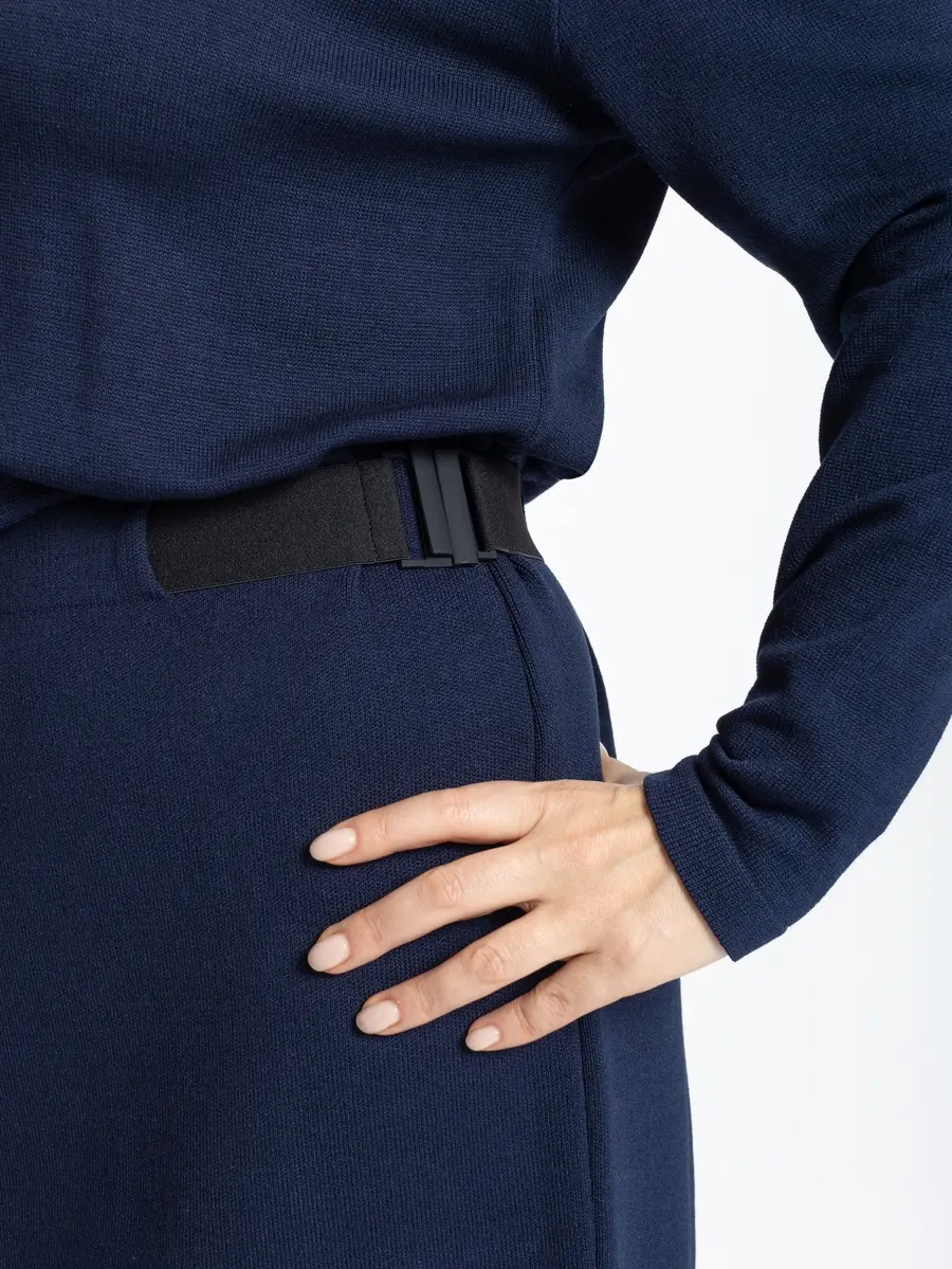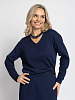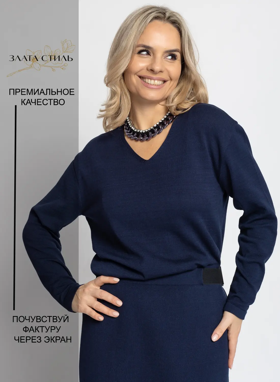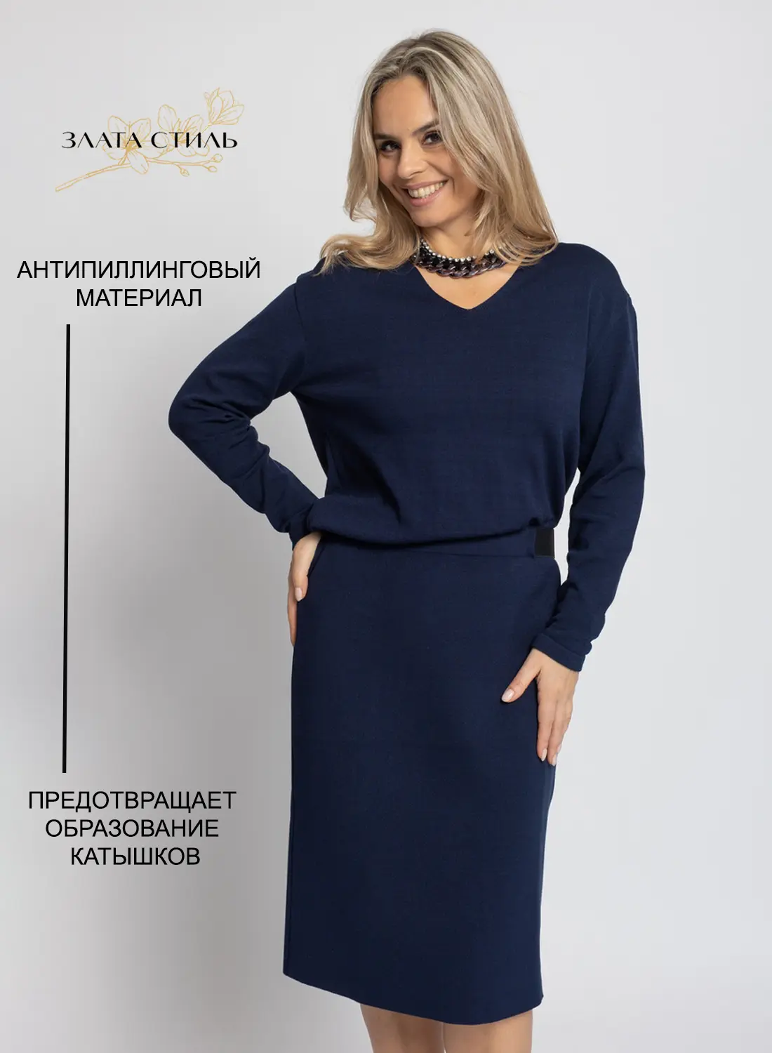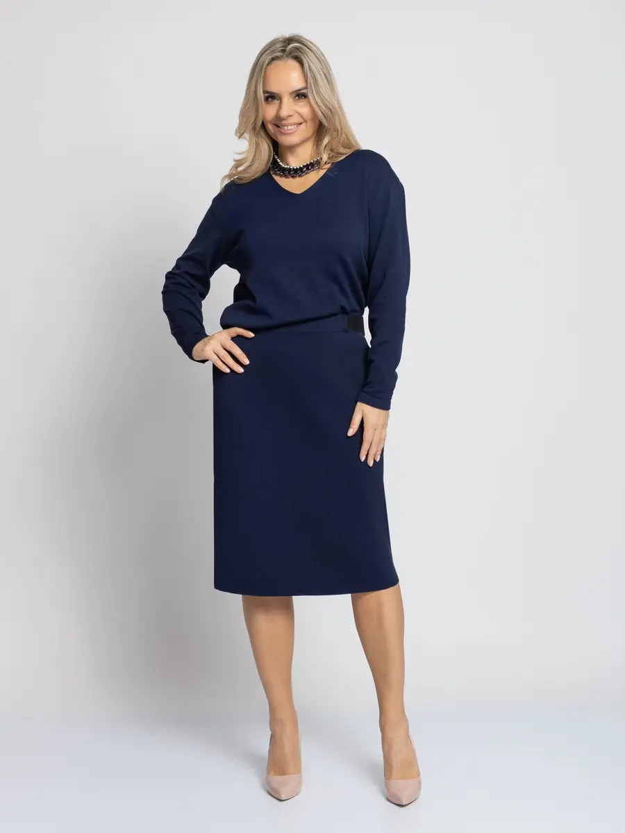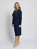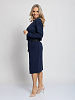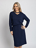 - Вязаное элегантное женское платье, отрезное по талии . Спущенное плечо, рукава длинные. V-образный вырез. По талии проложен пояс с пряжкой, драпировка с напуском по правому боку.