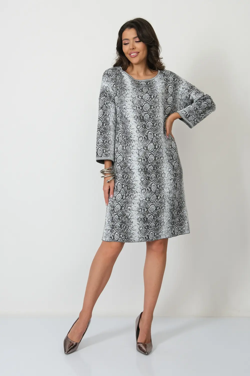 - Женское трикотажное платье свободного силуэта. Вырез горловины круглый, рукава втачные длиной 7/8 со спущенным плечом. Платье выполнено жаккардовым переплетением, образущим орнамент, имитирующий змеиный окрас.
