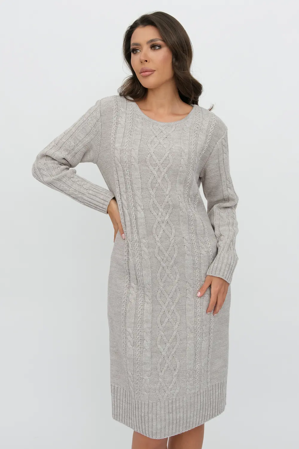 - Вязаное платье женское полуприлегающего силуэта . Рукава втачные длинные. Горловина круглая, обработана бейкой. Платье с фактурным узором косами станет украшением вашего осеннего гардероба. Женское вязаное платье изготовлено из мягкой и приятной к телу турецкой пряжи с содержанием шерсти.и подходит для использования в зимний период.