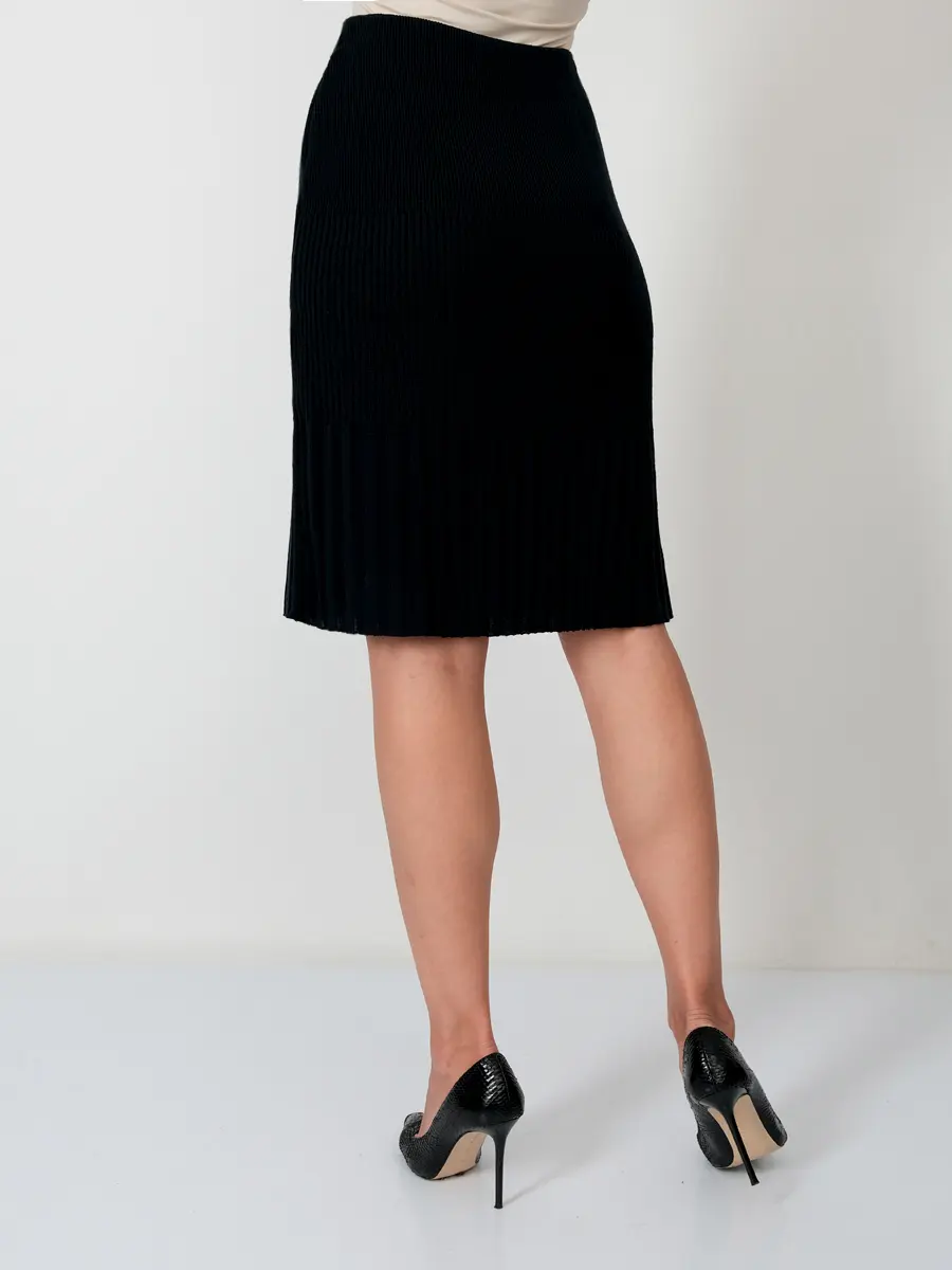 - Классическая юбка полуприлегающего силуэта. Переплетение-лапша от узкой по бедрам до широкой по низу изделия. В пояс горизонтально проложена эластичная резинка.