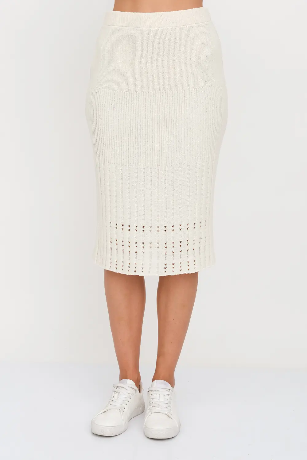 - Классическая юбка полуприлегающего силуэта. Переплетение-лапша от узкой по бедрам до широкой с эффектом перфорации по низу изделия . В пояс горизонтально проложена эластичная резинка. Юбку можно носить в комплекте с джемпером И 023, выполненным аналогичным переплетением и узором.