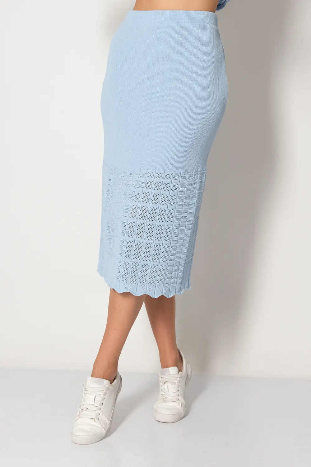 - Классическая юбка полуприлегающего силуэта. Ширина переплетения-лапша увеличивается от пояса до колена, нижняя треть юбки выволнена ажурным переплетением. В пояс горизонтально проложена эластичная резинка. Юбку можно носить в комплекте с джемпером И 024, выполненным аналогичным переплетением и узором.