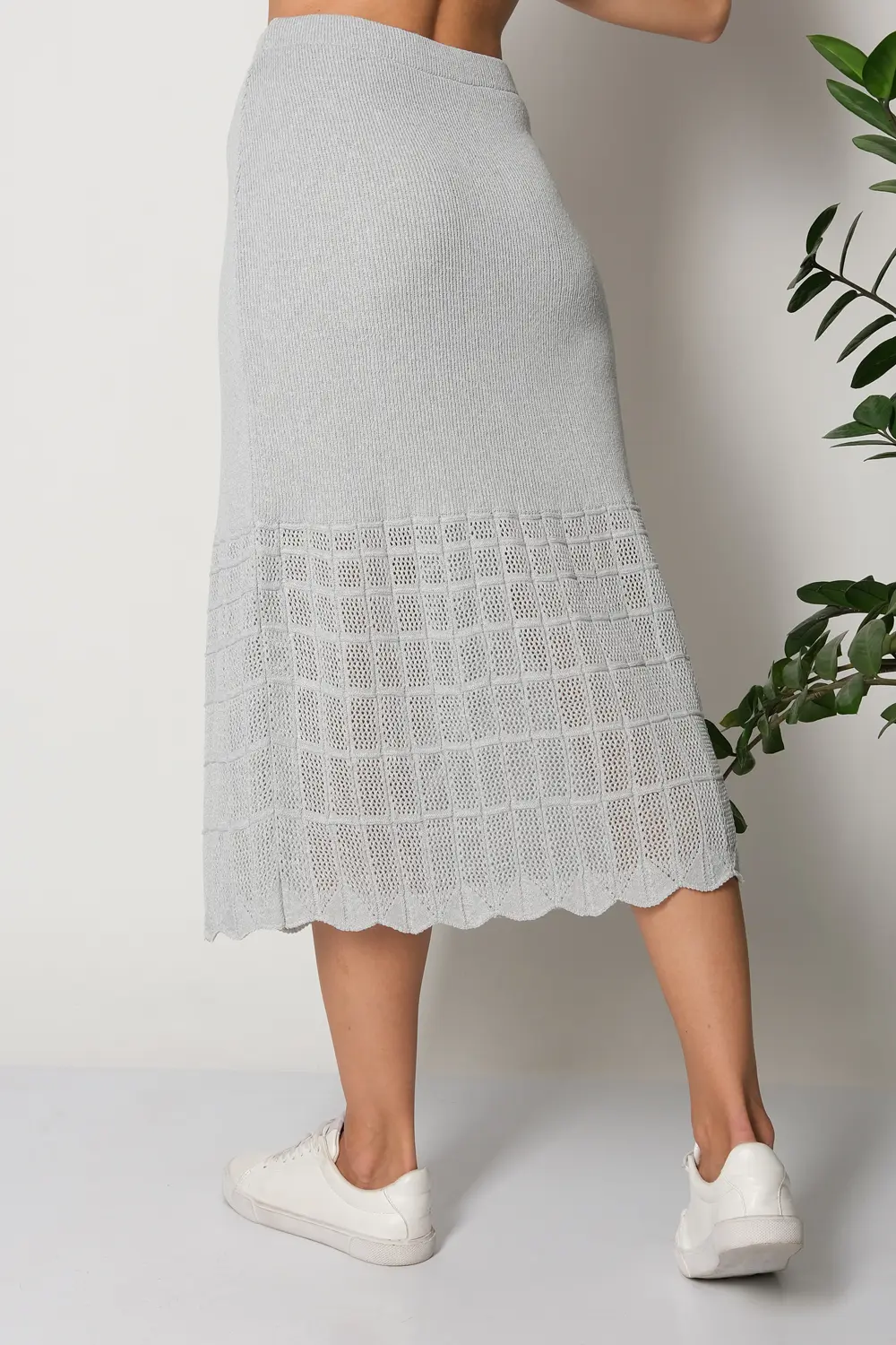 - Классическая юбка полуприлегающего силуэта. Ширина переплетения-лапша увеличивается от пояса до колена, нижняя треть юбки выволнена ажурным переплетением. В пояс горизонтально проложена эластичная резинка. Юбку можно носить в комплекте с джемпером И 024, выполненным аналогичным переплетением и узором.