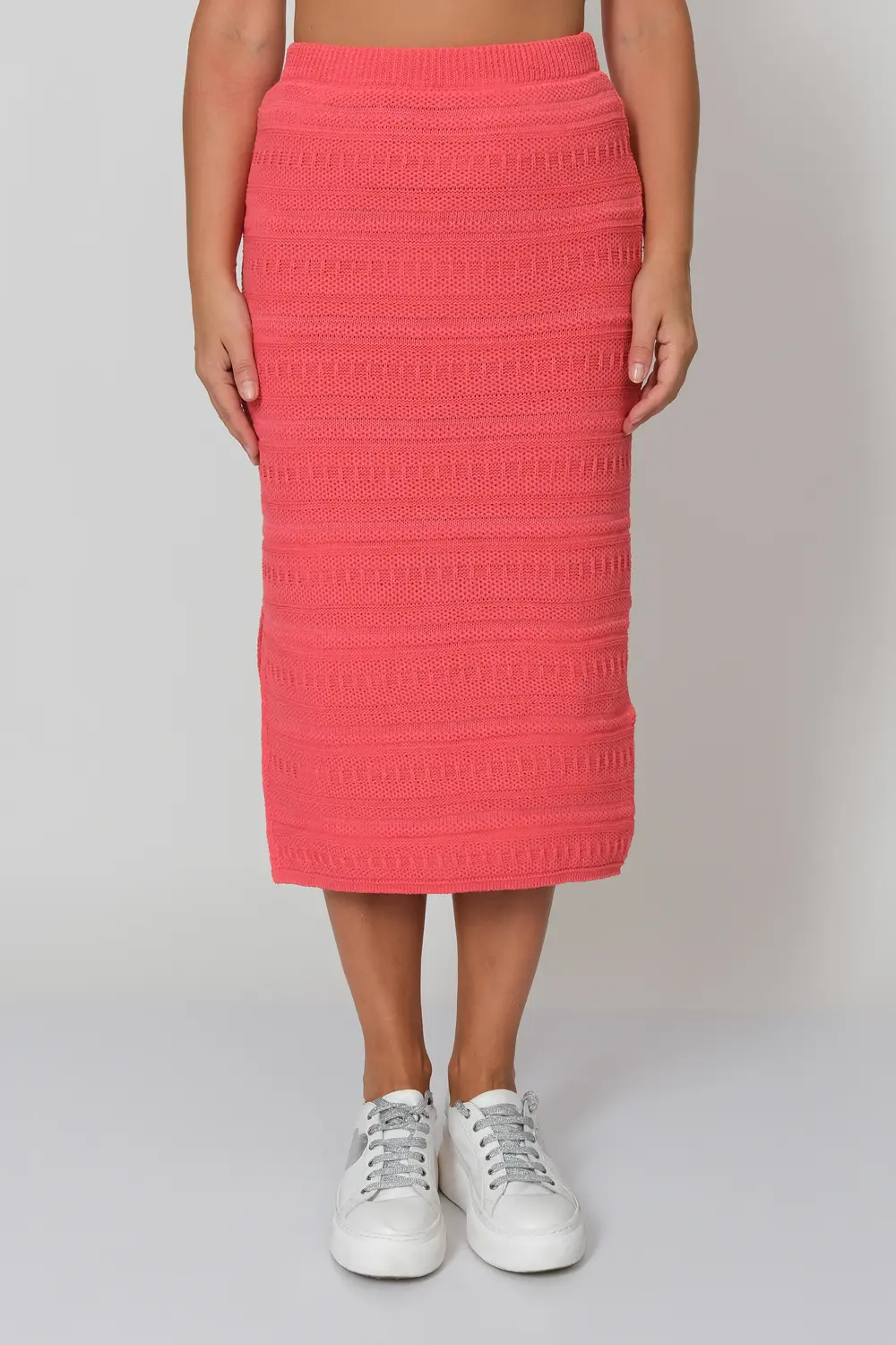 - Классическая юбка прилегающего силуэта с боковым разрезом до колена. Юбка выполнена структурным рельефным переплетением. Можно носить как костюм с джемпером И 020.