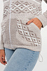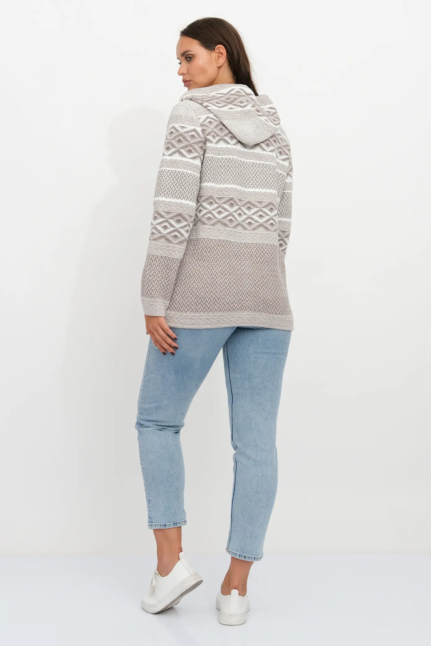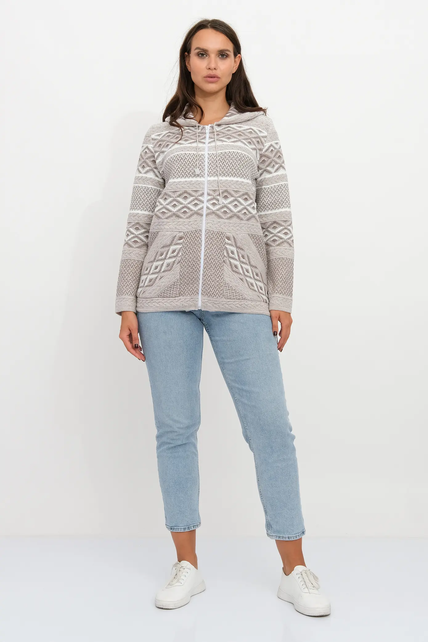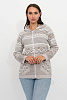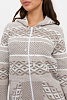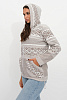 - Вязанный женский жакет на молнии с капюшоном свободного силуэта. Рукава втачные длинные. По переду два накладных кармана. Женский жакет выполнен переплетением сочетающим чередование жаккардовых цветных горизонтальных полос. В капюшон и низ изделия проложен трикотажный шнурок для регулировки ширины.