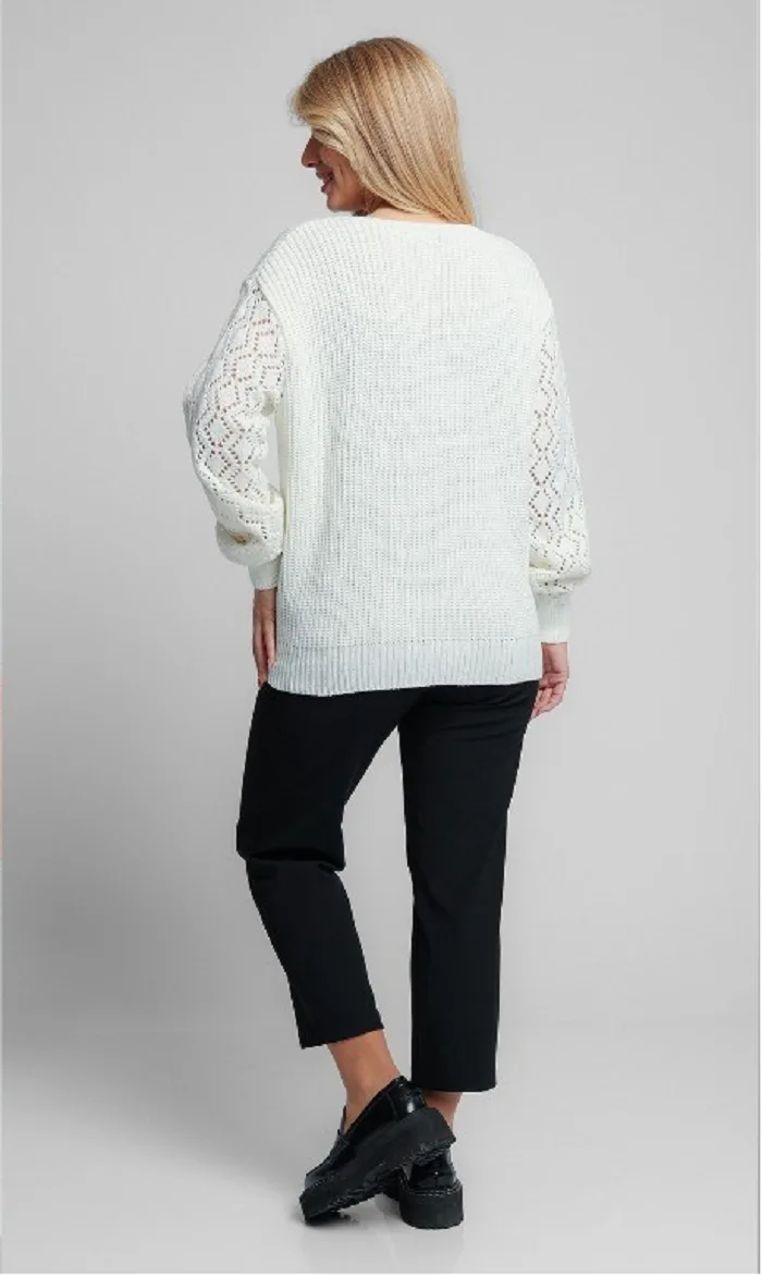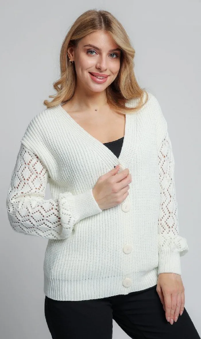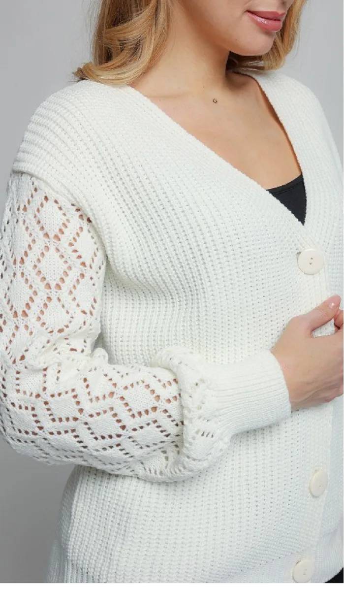 - Женский вязаный жакет свободного силуэта. V-образный вырез горловины. Длинные рукава с приспущенным плечом выполнены ажурной вязкой.
