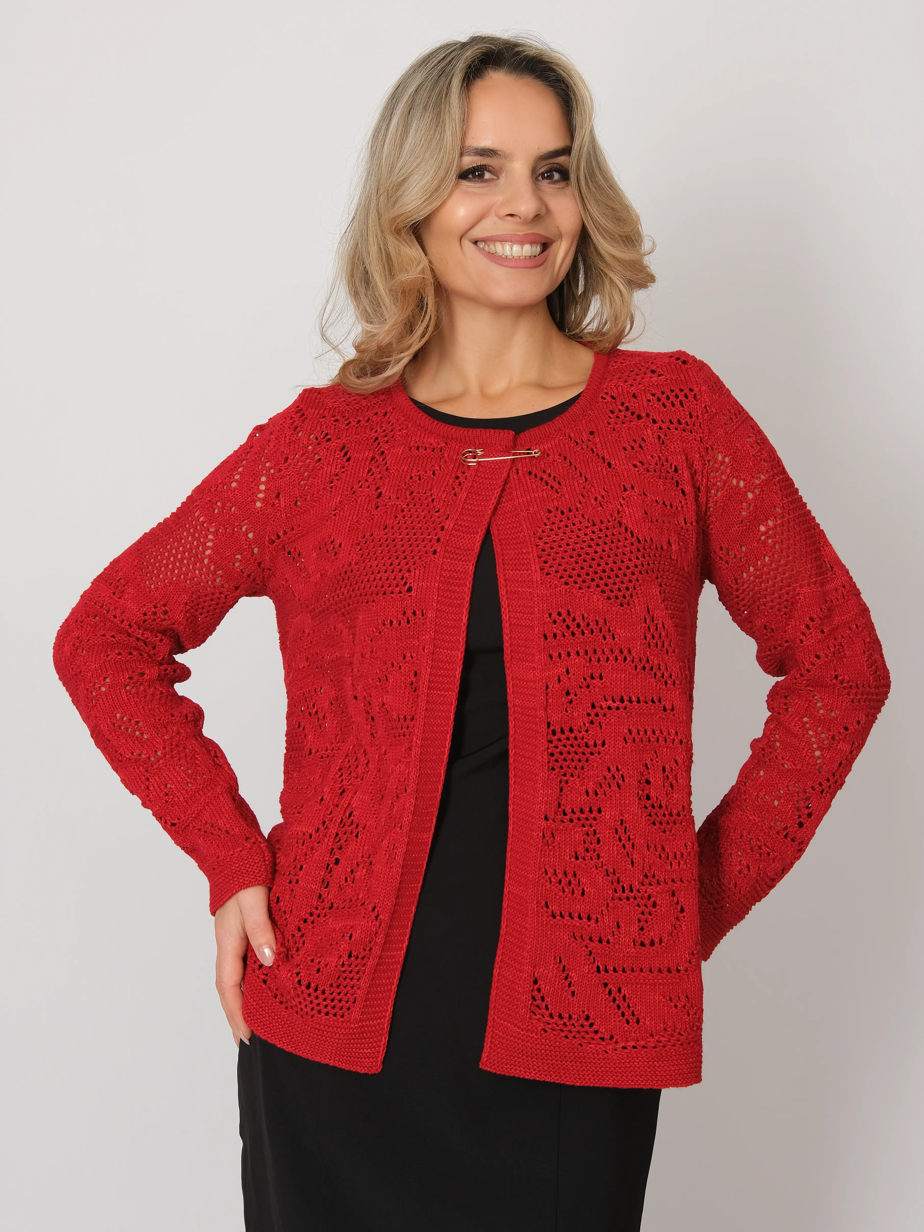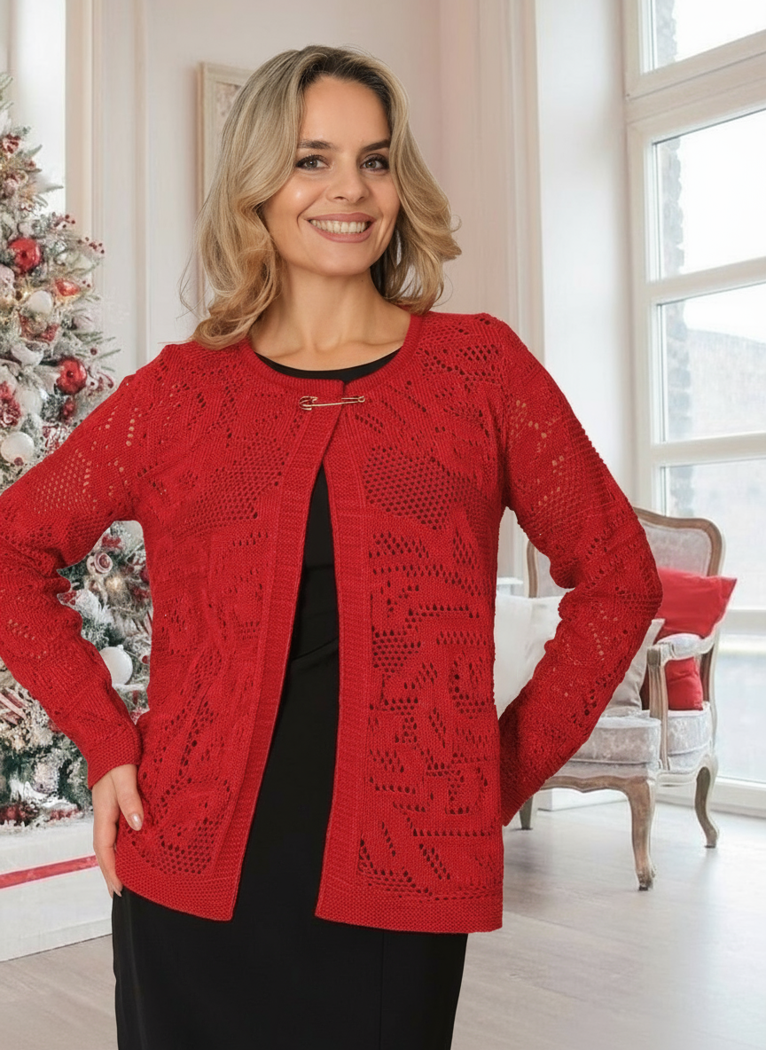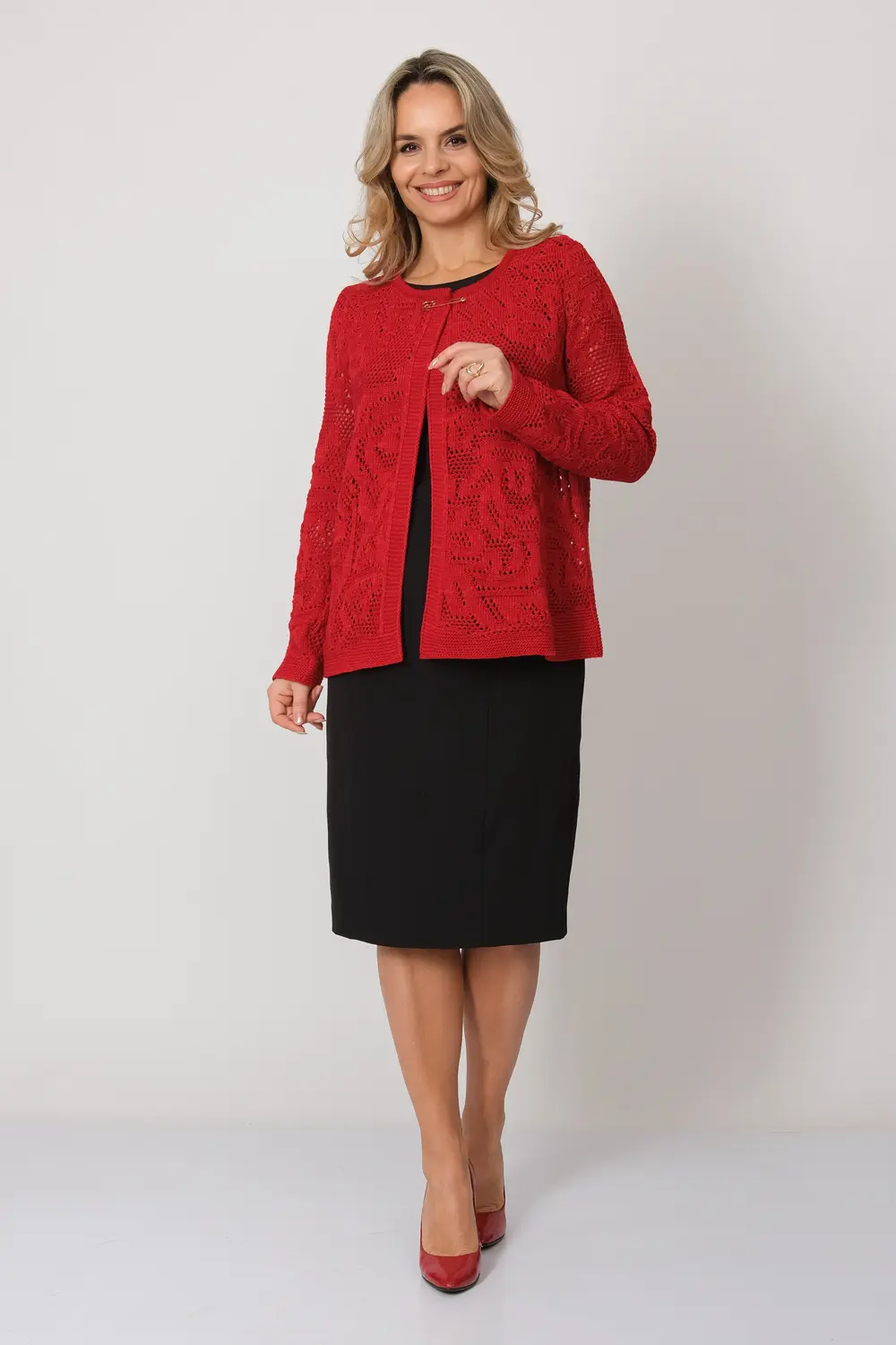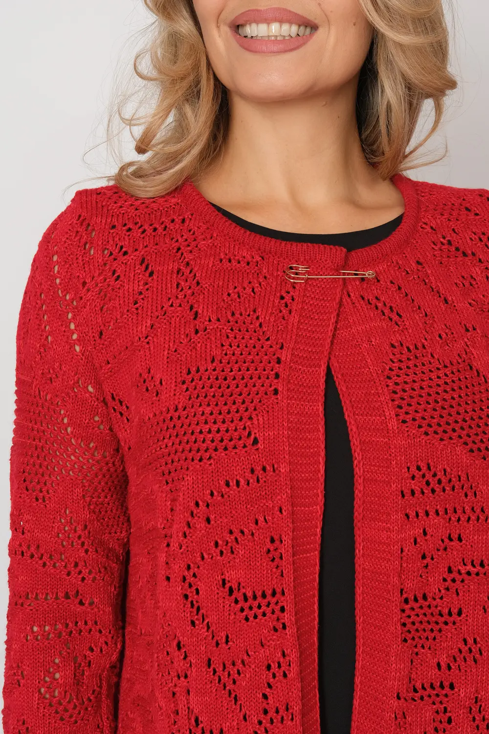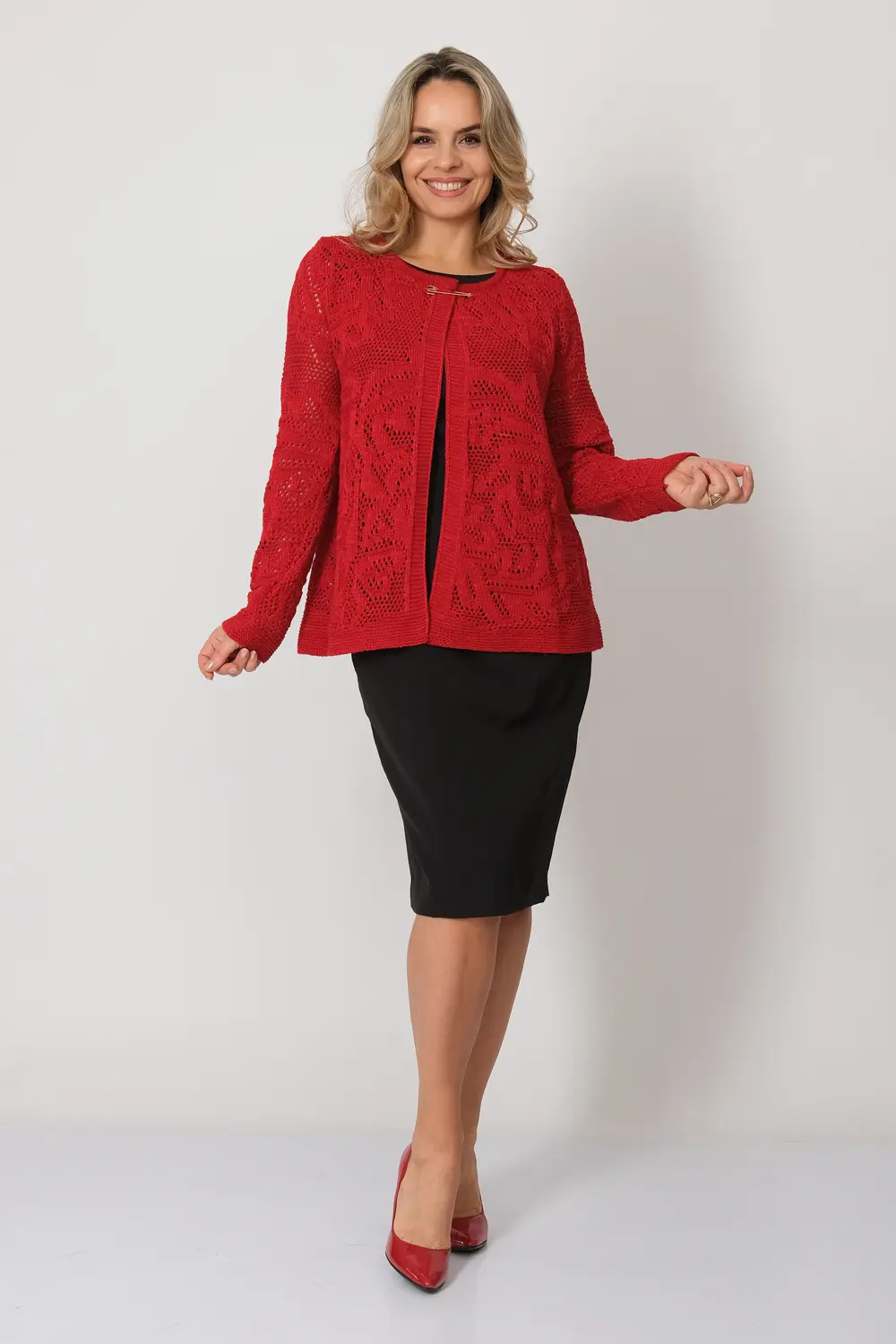 - Нарядный женский вязаный жакет с брошью. Этот элегантный жакет должен быть в гардеробе любой модницы. Модель прямого силуэта, что делает его идеальным выбором для женщин, предпочитающих стильную и комфортную одежду. Жакет выполнен красивым ажурным узором. Состав изделия включает в себя 50% хлопка, что придаст комфорт в носке в любое время года. Модель отлично подойдет к платью, юбке и брюкам. Составит нежный и романтичный образ каждой дамы.