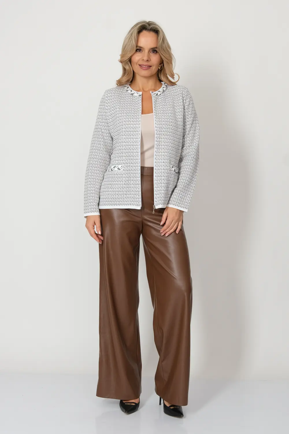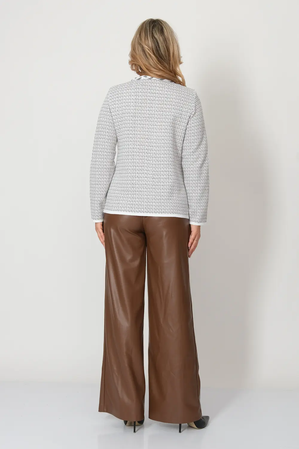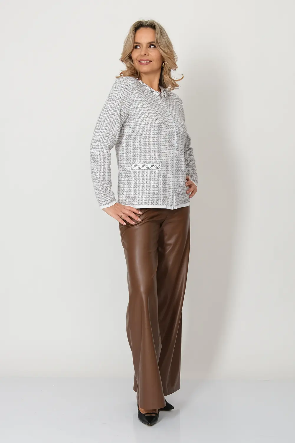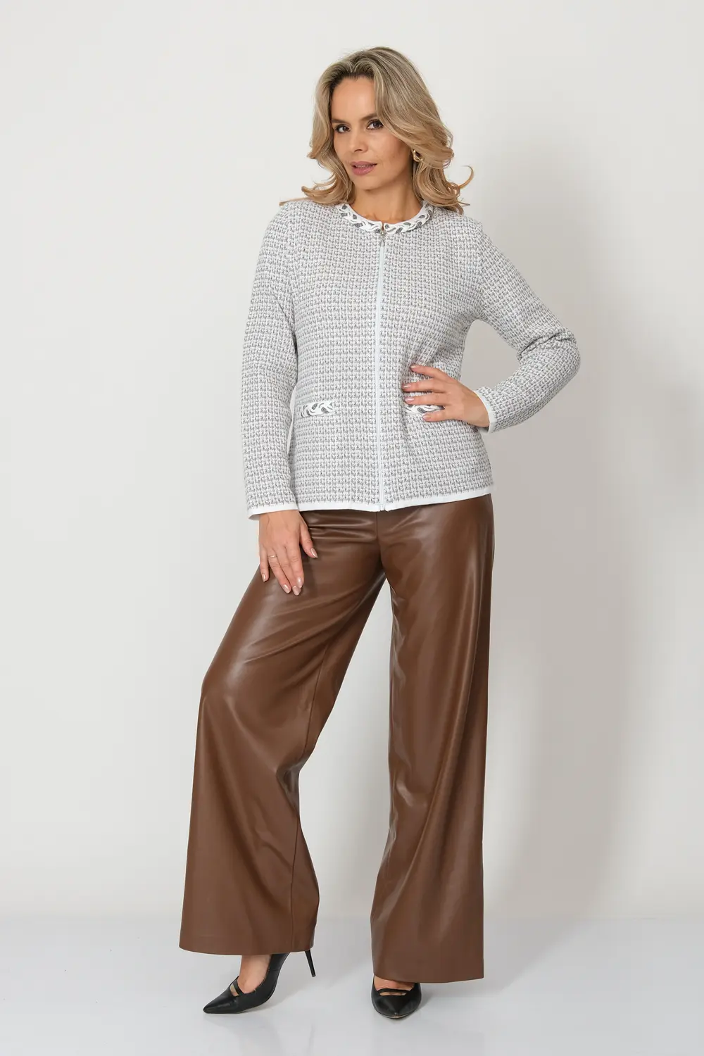 - Жакет женский полуприлегающего силуэта с круглой горловиной. Жакет вязаный на молнии. Выполнен жаккардовым, структурным переплетением рисунок клетка. Горловина и линия входа в карман декорированы косами, которые выполнены из переплетающихся вязаных шнурков.