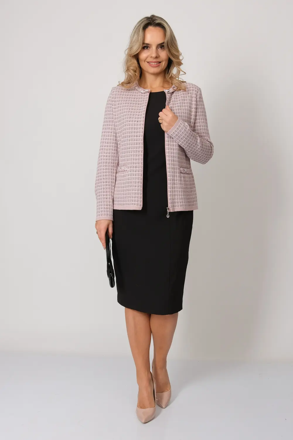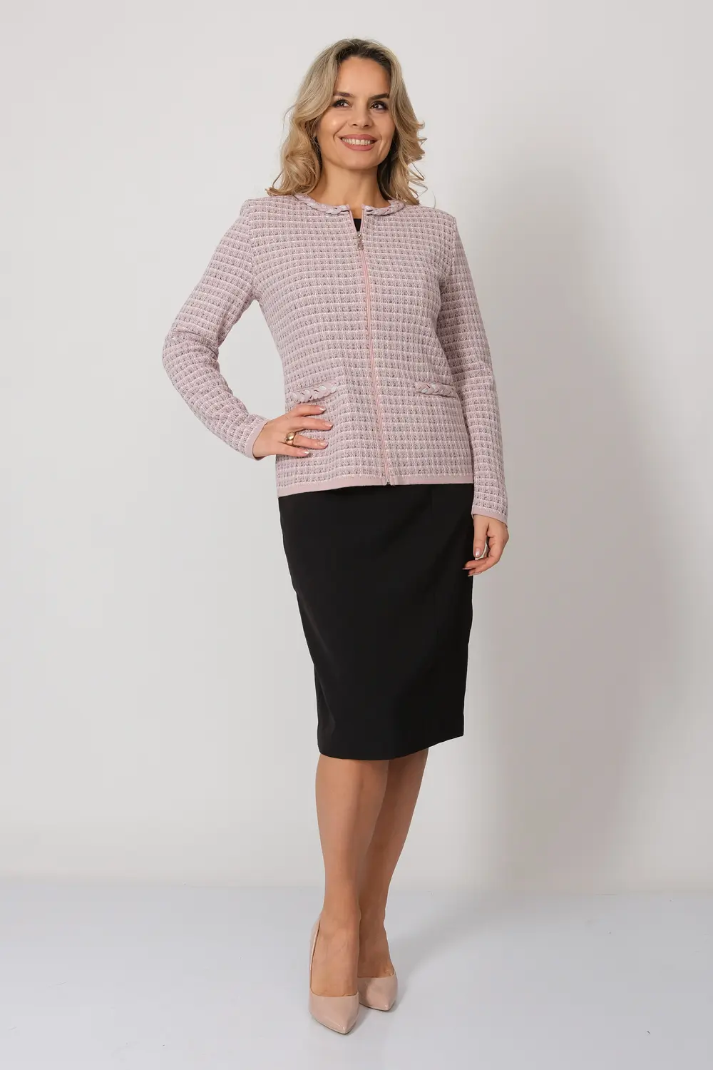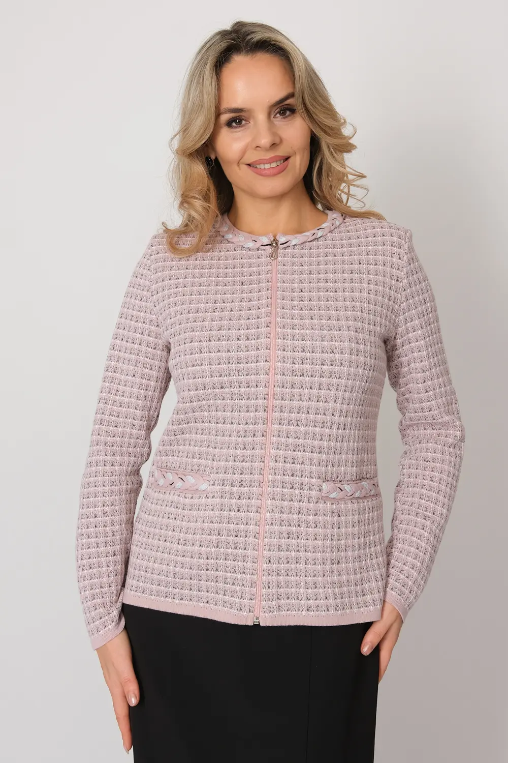 - Жакет женский полуприлегающего силуэта с круглой горловиной. Жакет вязаный на молнии. Выполнен жаккардовым, структурным переплетением рисунок клетка. Горловина и линия входа в карман декорированы косами, которые выполнены из переплетающихся вязаных шнурков.