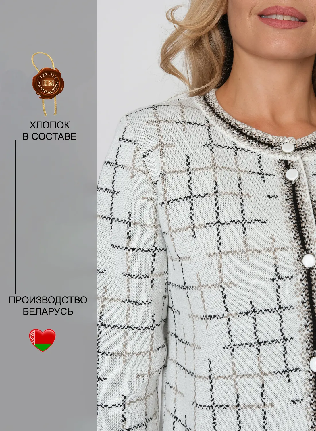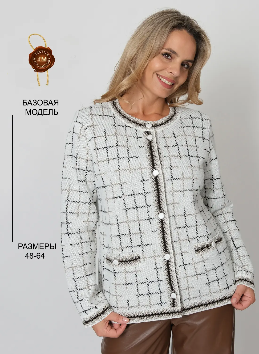 - Жакет женский вязаный полуприлегающего силуэта в классическом стиле с круглым вырезом горловины и втачным рукавом полной длины. Застежка спереди на ряд крупных контрастных пуговиц. По бокам два прорезных кармана с пуговицей. Жакет выполнен жаккардовым переплетением рисунок клетка.