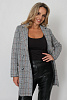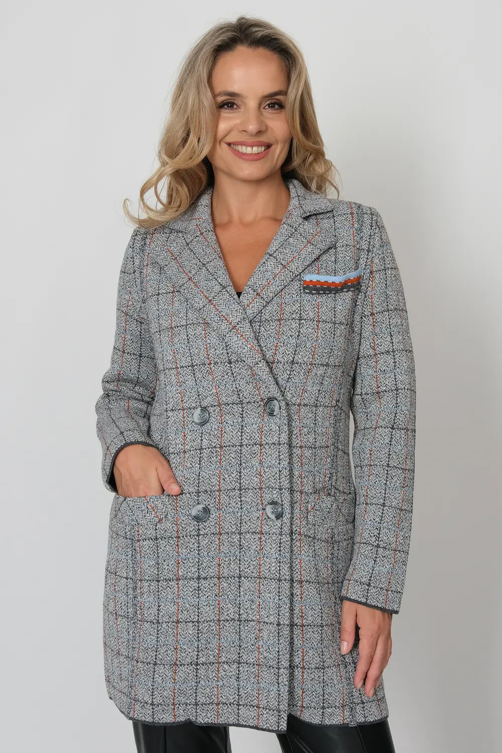 - Двубортный женский жакет прямого удлиненного силуэта с V-образным вырезом, английским воротником из вязаного трикотажа. Рукав втачной длинный. Застёжка спереди на два ряда пуговиц. Два прорезных кармана с листочкой. Изделие выполнено жаккардовым переплетением образующим клетку.