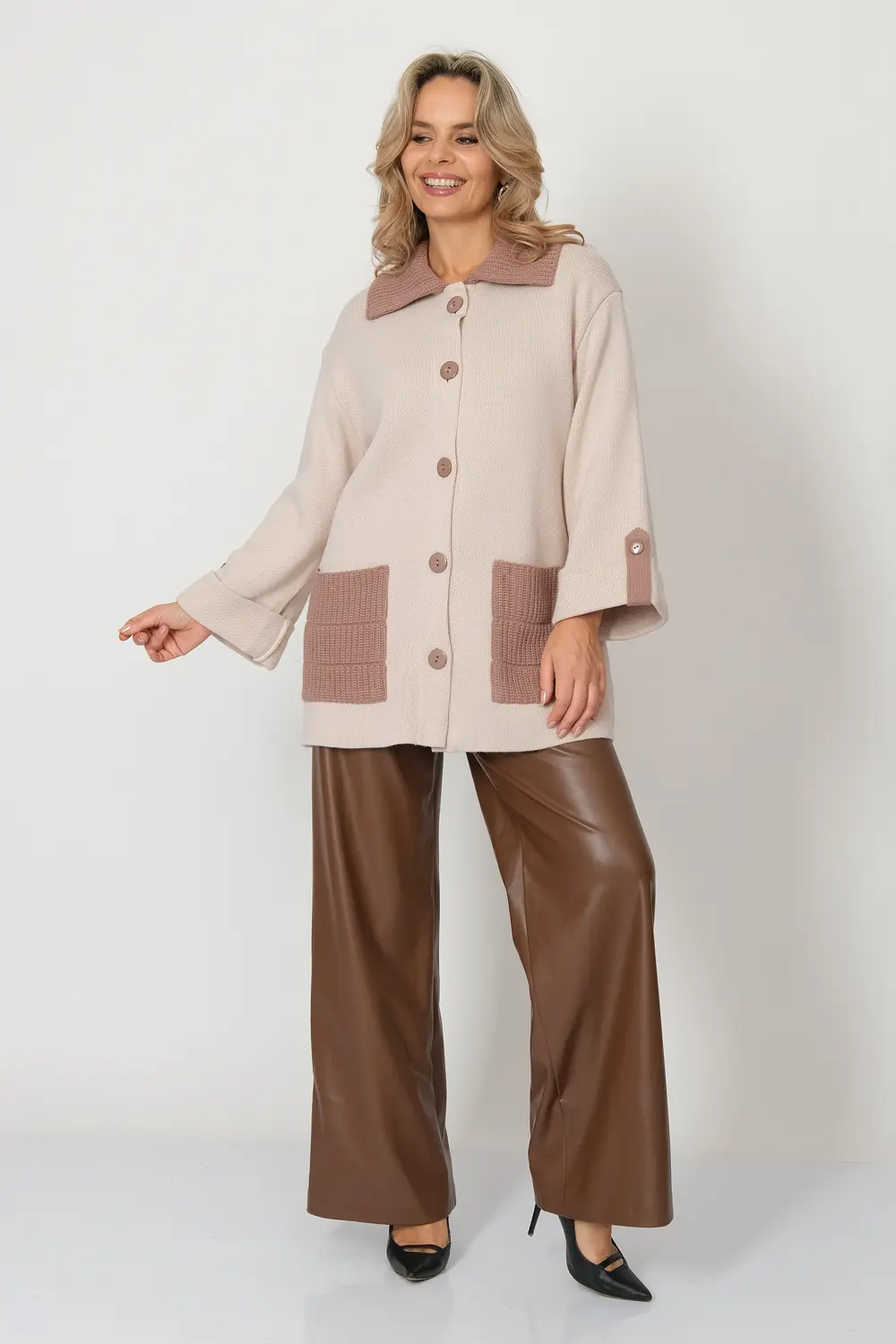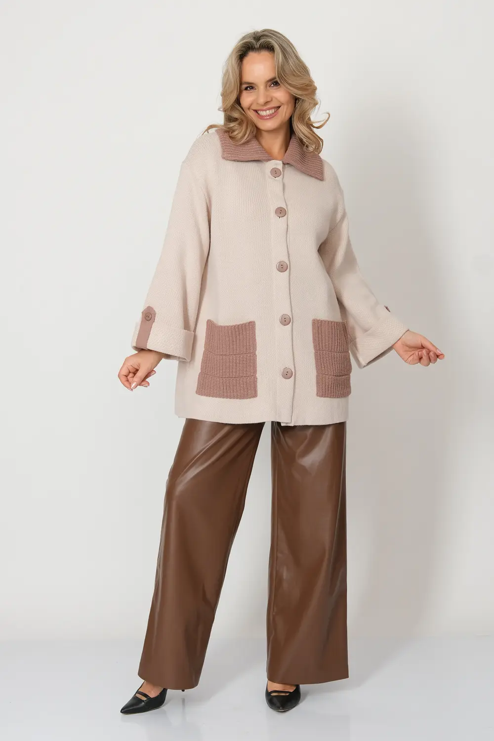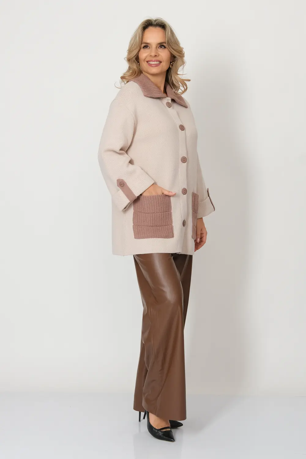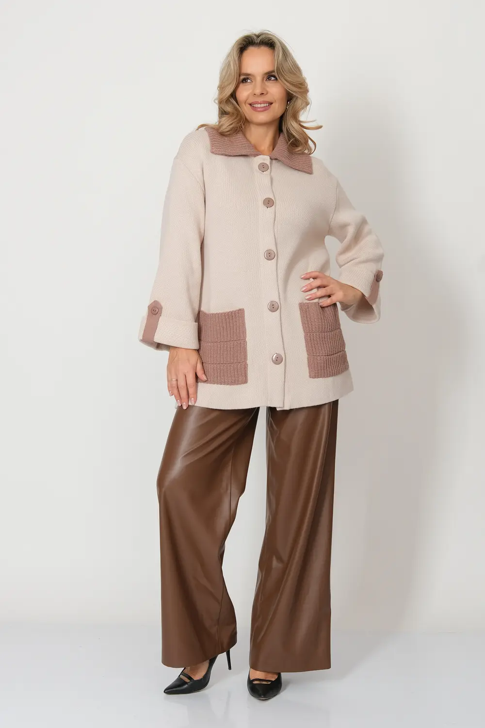 - Элгантный вязаный женский жакет свободного силуэта с отложным воротником. Рукав втачной длинный, чуть расклешенный к низу, с патой, регулирующей длину. . По бокам два накладных кармана. Жакет застегивается на пуговицы.