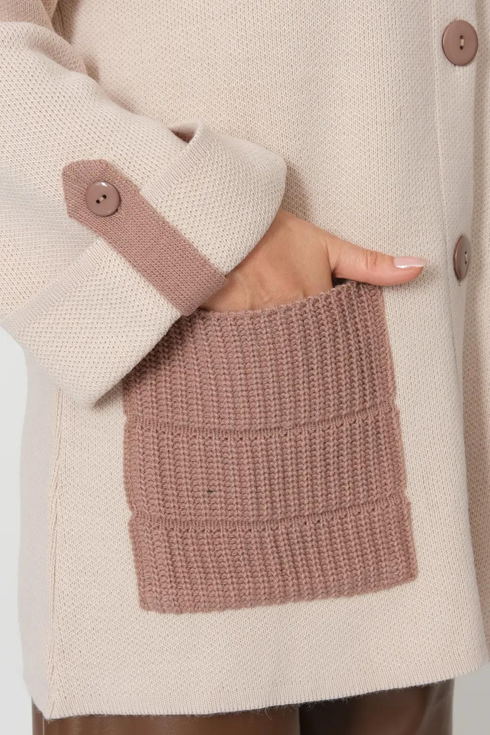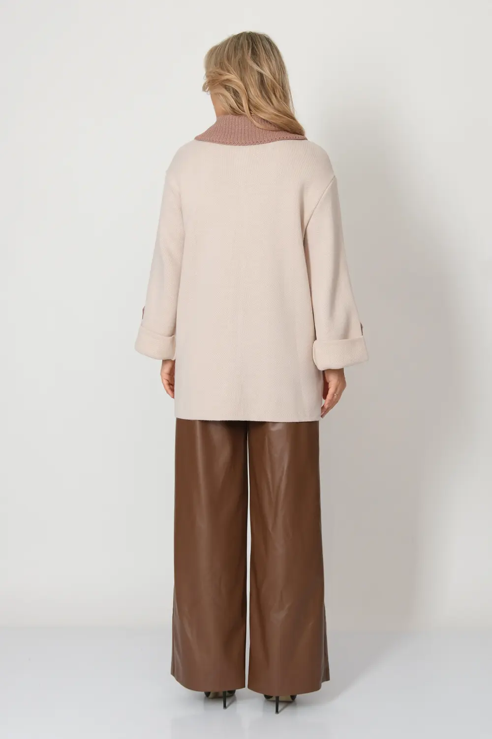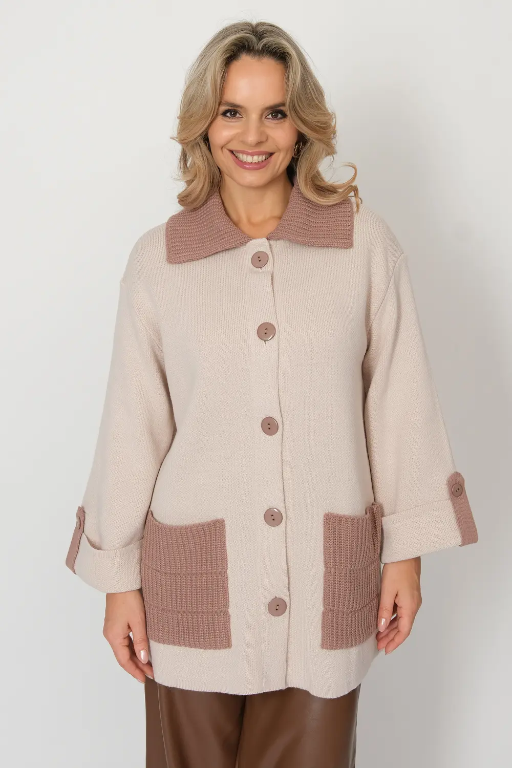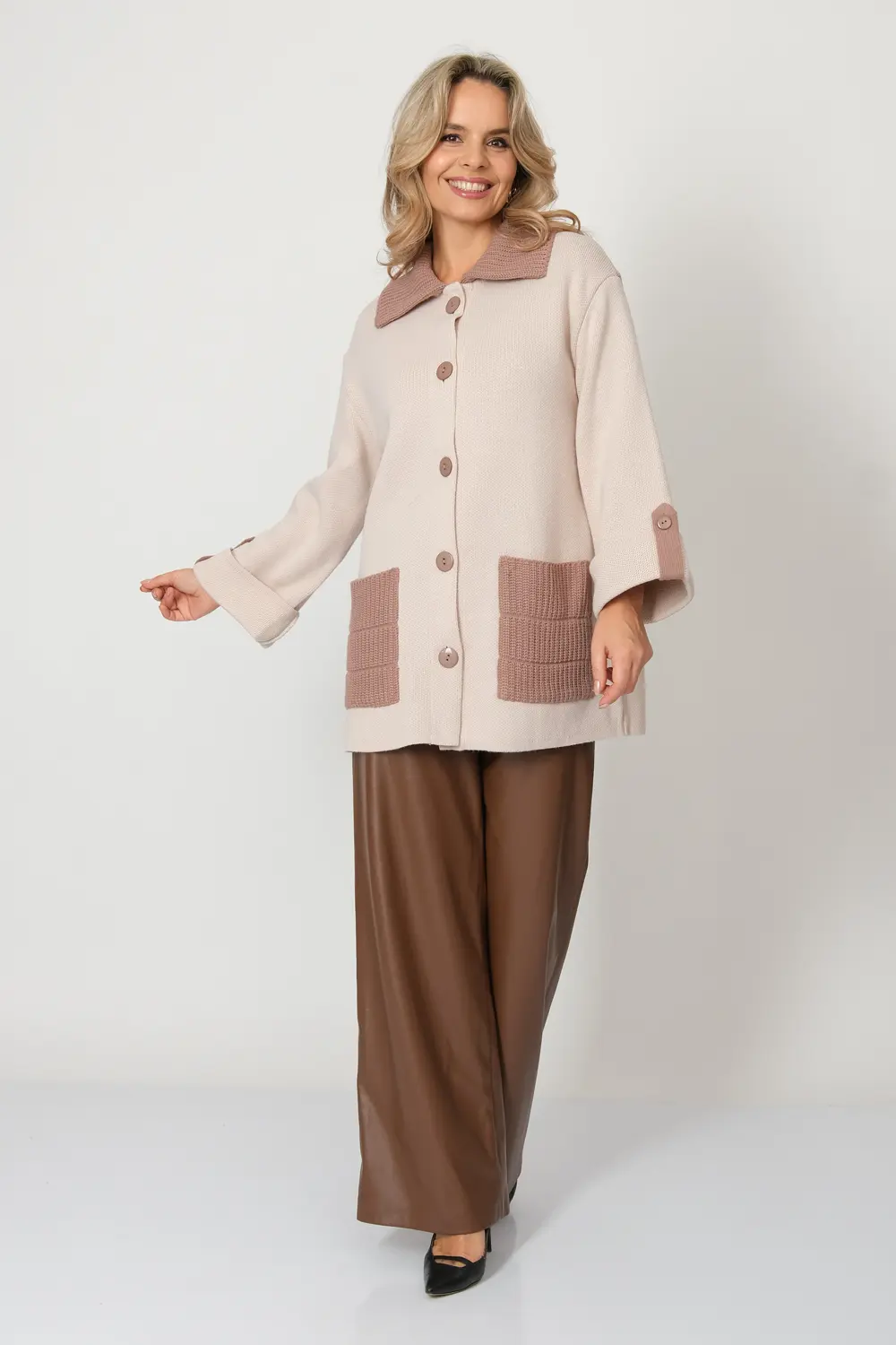 - Элгантный вязаный женский жакет свободного силуэта с отложным воротником. Рукав втачной длинный, чуть расклешенный к низу, с патой, регулирующей длину. . По бокам два накладных кармана. Жакет застегивается на пуговицы.