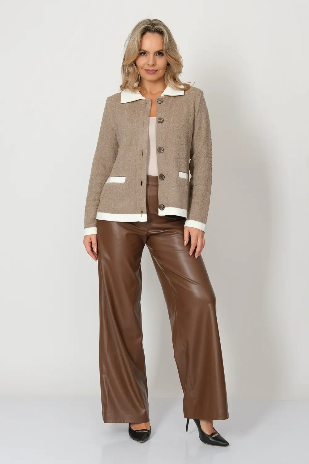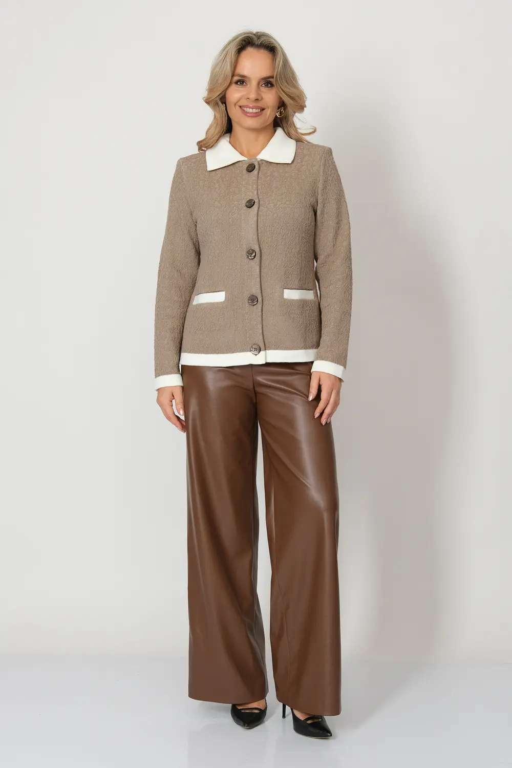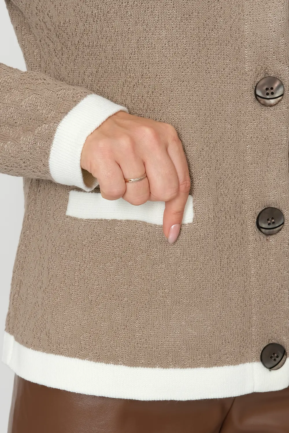 - Жакет женский вязаный прямого силуэта с отложным воротником. Трикотажный пиджак выполнен из высококачественной пряжи с составом 30% хлопок 70% ПАН. Кофта на пуговицах имеет длинные втачные рукава и два прорезных кармана с листочкой. Классический жакет застегивается на пуговицы по всей длине. Пиджак оформлен классическим отложным воротником контрастного цвета. Длина изделия 59 см, длина рукава 60 см. Нарядный жакет выполнен жаккардовым переплетением образующим оригинальный рельефный рисунок, имитирующий ажур. Праздничный пиджак прямого силуэта подойдет для любого типа фигуры и составит оригинальный, модный и женственный образ абсолютно с любым низом: юбка, брюки, джинсы.