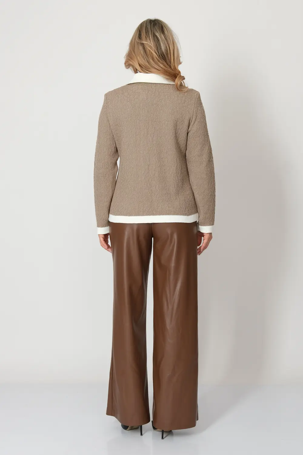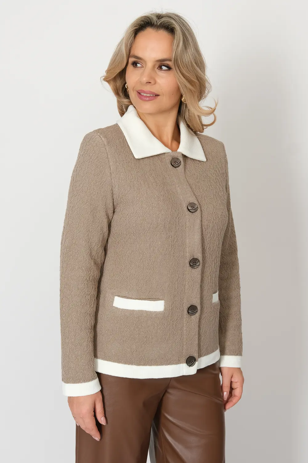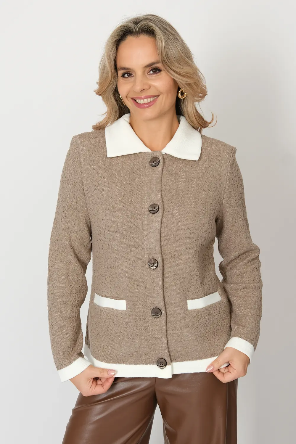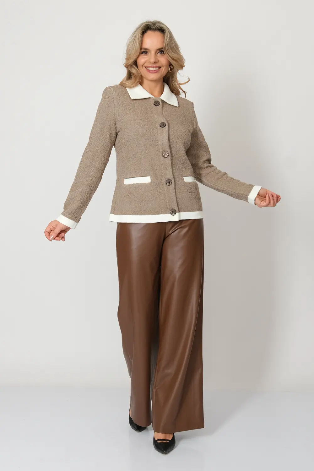 - Жакет женский вязаный прямого силуэта с отложным воротником. Трикотажный пиджак выполнен из высококачественной пряжи с составом 30% хлопок 70% ПАН. Кофта на пуговицах имеет длинные втачные рукава и два прорезных кармана с листочкой. Классический жакет застегивается на пуговицы по всей длине. Пиджак оформлен классическим отложным воротником контрастного цвета. Длина изделия 59 см, длина рукава 60 см. Нарядный жакет выполнен жаккардовым переплетением образующим оригинальный рельефный рисунок, имитирующий ажур. Праздничный пиджак прямого силуэта подойдет для любого типа фигуры и составит оригинальный, модный и женственный образ абсолютно с любым низом: юбка, брюки, джинсы.