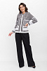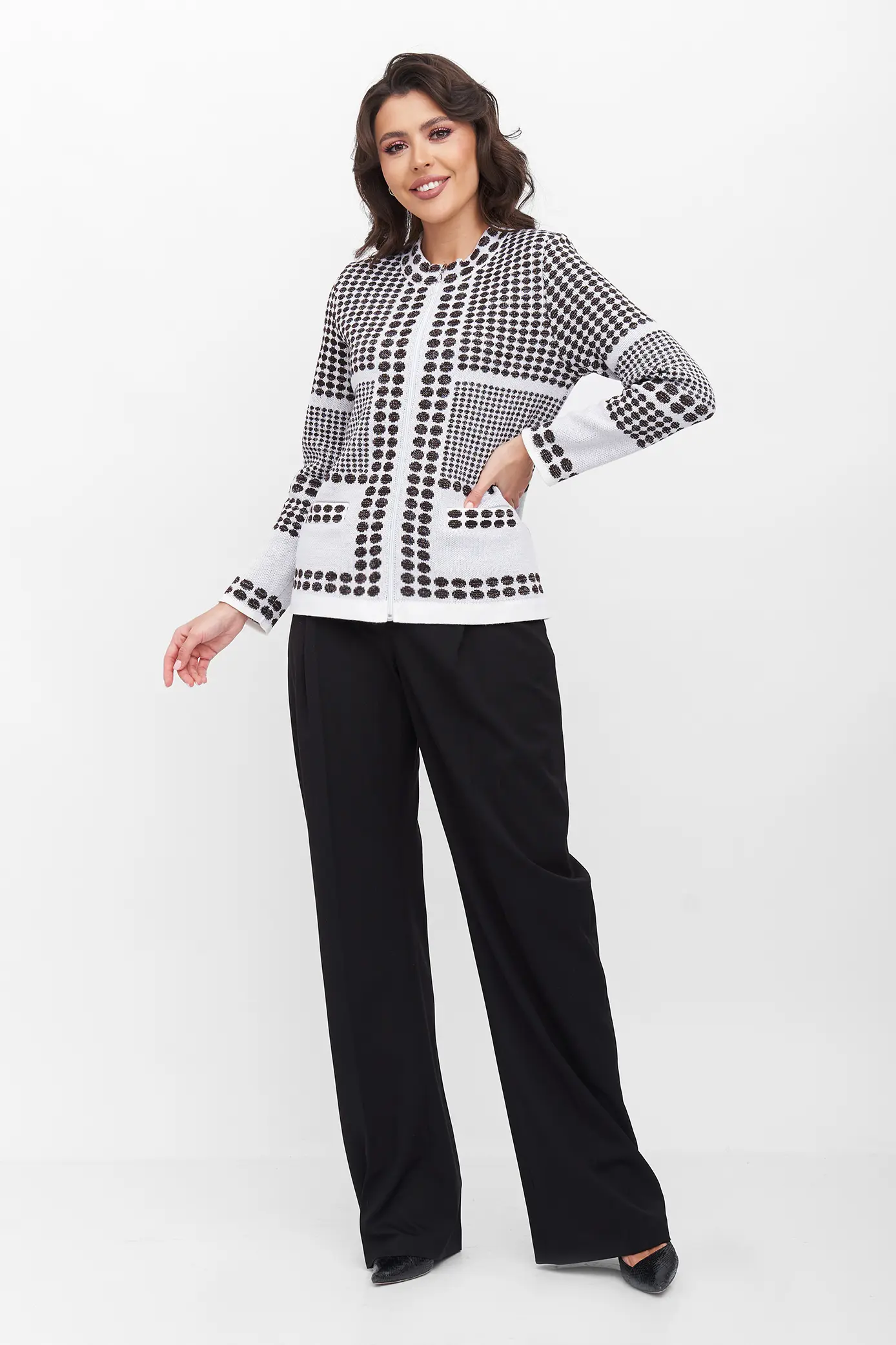- Женский вязаный жакет полуприлегающего силуэта на молнии. Рукава втачные, длинные. Жакет выполнен из качественной пряжи с составом 30% хлопок 70% ПАН с добавлением люрексовой нити. Модель имеет функциональные прорезные карманы с листочкой. Жакет выполнен жаккардовым переплетением с актуальным геометрическим рисунком, имеет комфортную посадку по фигуре. Эффектный жакет поддержит и деловой образ, и праздничное настроение. Отлично сочетается с любым низом в комплекте. Модель классическая, праздничная и повседневная, абсолютно на любой случай жизни.