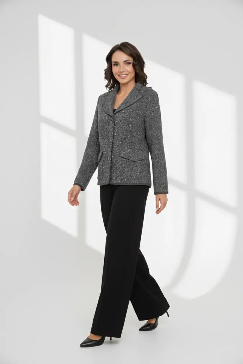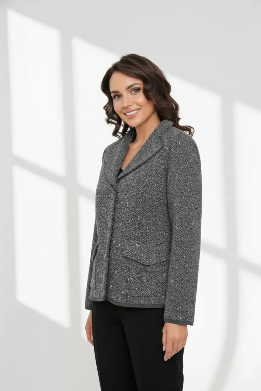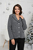 - Женский вязаный жакет прямого силуэта с V-образным вырезом, английским воротником. Рукав втачной длинный. Застёжка на пуговицы. Два накладных кармана с клапаном. Изделие выполнено жаккардовым переплетением. Жакет подойдет для работы в офис и деловых встреч, в нем Вы будете выглядеть модно, но при этом лаконично и сдержанно.