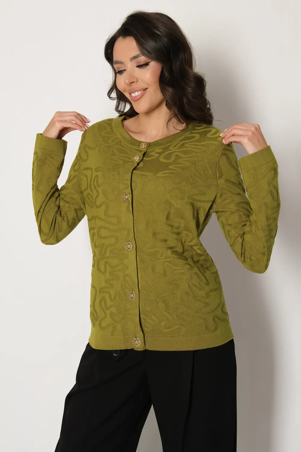 - Нарядный женский жакет из трикотажного полотна полуприлегающего силуэта с круглой горловиной, на пуговицах. Рукава втачные длинные. Жакет выполнен структурным переплетением. Эффектная металлические пуговицы в отделке придают жакету нарядный вид..